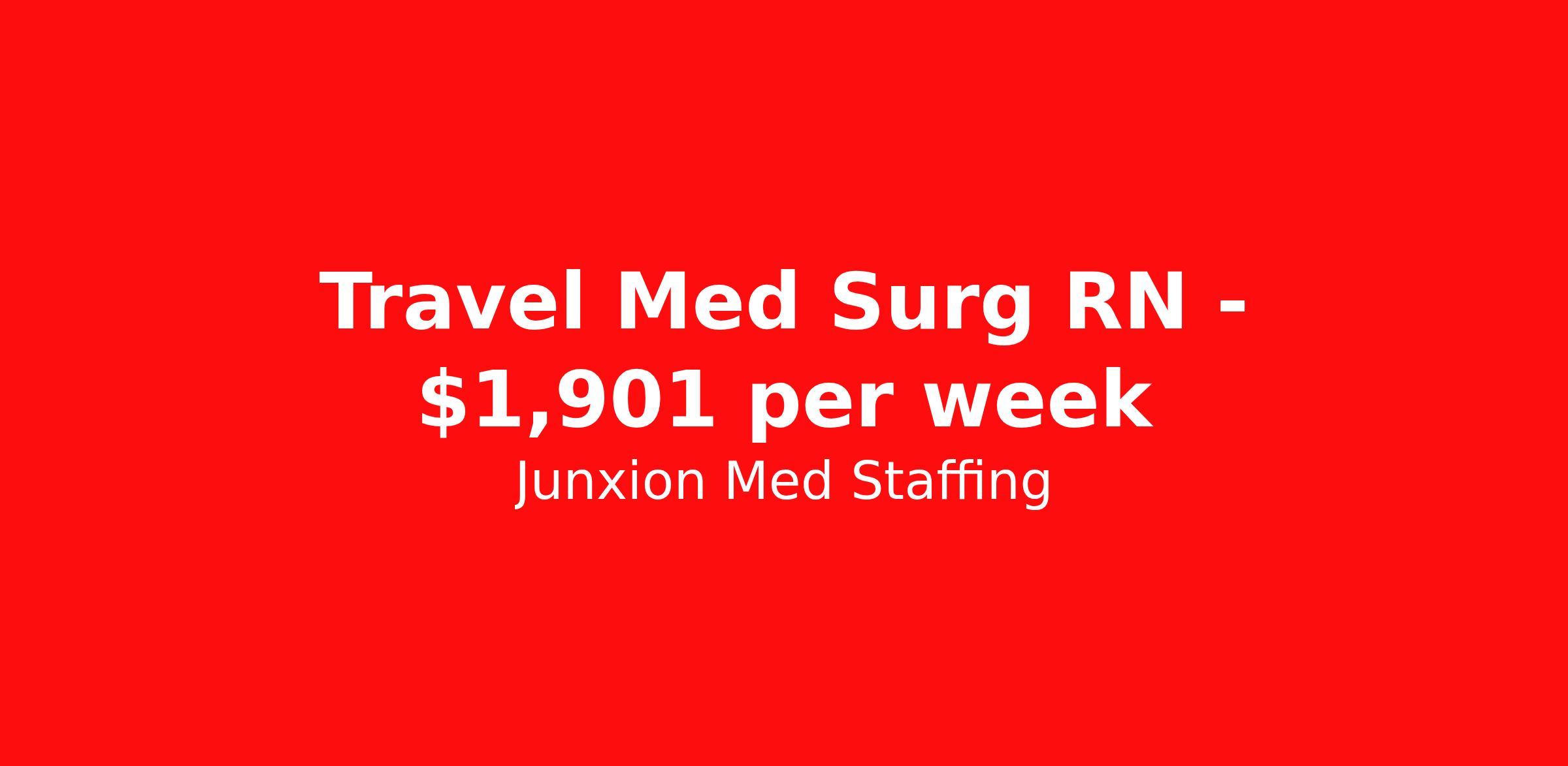 Junxion Med Staffing is seeking a travel nurse RN Med Surg for a travel nursing job in Tuba City, Arizona. Job Description & Requirements Specialty: Med Surg Discipline: RN Start Date: 04/06/2026 Duration: 13 weeks 36 hours per week Shift: 12 hours, days Employment Type: Travel Summary: Junxion Med Staffing is looking for a Med surg RN to take an assignment in Tuba City, Arizona. This assignment lasts 13.14 WEEKS and is scheduled to start on April 6, 2026. If you don't like the start date, pay, or shift, then let’s talk. Give us a call opt 1 Job Details: Shift: 12H Days Total Weekly Hours: 36 Certifications: BLS, BLS, ACLS, TCAR, NIH NIHSS Trauma Level: Benefits: Day 1 Insurance Additional bonus potential for every contract Additional vacation incentives Medical insurance with no more than $175 monthly premium for employee Employee Assistance Program (EAP) Referral bonus up to $1,000 401K and access to financial advisors for financial wellness and education A dedicated recruiter and support team that will help you every step of the way to sure you start on time and have an exceptional experience An agency ran by a traveler for travelers Click here for licensing requirements About the Company: Junxion Med Staffing is an award-winning healthcare staffing company with a mission to provide quality healthcare to our communities. Apply today to speak with a recruiter! Awards: RNVIP- Top 10 Travel Nursing Agencies of 2024 BluePipes – The Best Travel Nursing Companies 2023 *Estimated weekly pay includes projected hourly wages and weekly meal and lodging per diems for eligible clinicians based on nationally published GSA rates. Actual weekly pay and per diems may differ from the amount shown and may be subject to change during an assignment. For all employees and employee applicants, Junxion Med Staffing is an Equal Employment Opportunity ("EEO") Employer, including Disability/Vets, and welcomes all to apply. Junxion Med Staffing Job ID 1362195. Pay package is based on 12 hour shifts and 36 hours per week (subject to confirmation) with tax-free stipend amount to be determined. About Junxion Med Staffing Junxion Med Staffing was founded by a former healthcare traveler who understands the challenges healthcare professionals face - because we’ve been there. We specialize in placing travel nurses, allied health professionals, physicians, physician assistants, and nurse practitioners in both short-term and permanent roles across a wide range of specialties. Whether you're looking for a travel contract or a long-term fit, we work to ensure the right match between each healthcare professional and facility. At Junxion, we keep it simple: ● Transparent communication. No surprises, no hidden details, just honest conversations so you always know what to expect. ● Dedicated support. From job search to contract negotiations and throughout your assignment, you’ll have a recruiter who’s with you every step of the way. ● Competitive pay and benefits. We advocate for you to be fairly compensated and supported in your goals. ● A focus on your success. When healthcare professionals feel valued and empowered, patient care improves and that’s what it’s all about. You’re not just a number here. You’re part of a team that actually cares. Let’s find your next great opportunity together. Benefits Weekly pay Referral bonus Dental benefits Vision benefits 401k retirement plan Medical benefits Mileage reimbursement