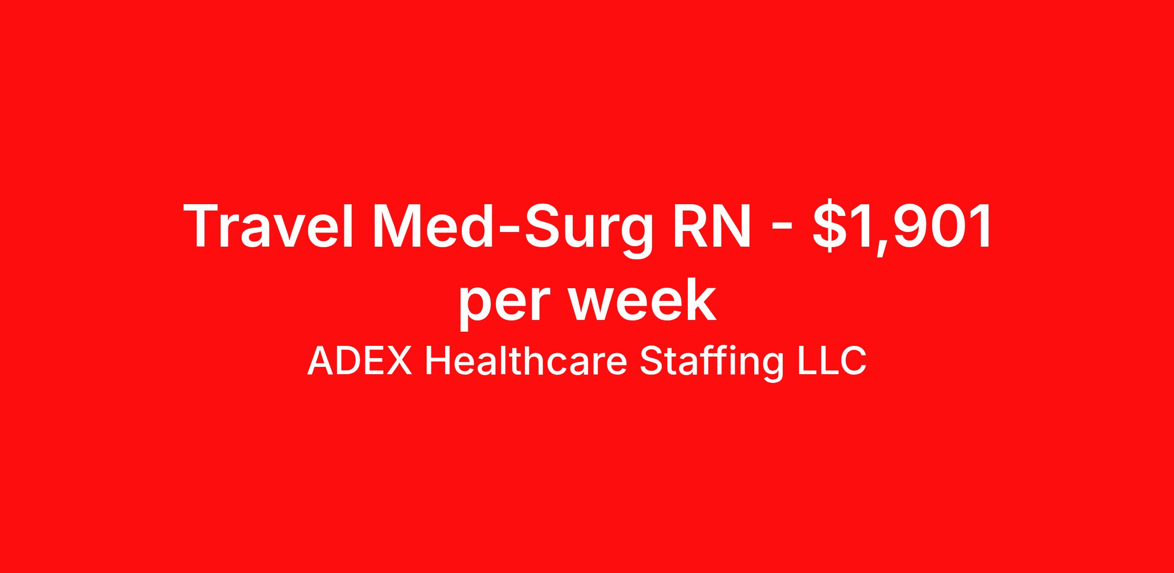 ADEX Healthcare Staffing LLC is seeking a travel nurse RN Med Surg for a travel nursing job in Carlsbad, New Mexico. Job Description & Requirements Specialty: Med Surg Discipline: RN Start Date: 04/06/2026 Duration: 13 weeks 36 hours per week Shift: 12 hours, nights Employment Type: Travel RN Position Job Notes: Travel or Local Registered Nurse needed for ASAP start. A minimum of 2 years of recent hospital bedside experience is required. Candidates must be able to start within 5 weeks. Opportunity for extension upon successful completion of the initial assignment. $750 referral bonus available. Opportunity: RN - Med Surg Job Details: • Work 12.5-hour night shifts from 6:30 PM to 7:00 AM • Floating and call required • Patient ratio of 1:6 • 2 years of experience required • ACLS and BLS certifications required • PALS certification preferred • Any color scrubs acceptable • EMR system: MedHost • Blocked scheduling may be accommodated (must be included in submittal) • On-call only for census flex prior to scheduled shift if census is low • Fingerprints required for all New Mexico travelers • 13-week assignment duration • 48-hour guarantees are not approved • Auto offers only - no interviews required Facility: This medical center provides comprehensive healthcare services with a focus on general medical-surgical inpatient care. The facility maintains modern technology systems and offers a supportive environment for nursing professionals. The organization emphasizes quality patient care and maintains flexible scheduling options to accommodate staff needs while ensuring adequate coverage for patient safety. Location: Carlsbad, NM Carlsbad offers a unique blend of natural beauty and outdoor recreation, most famous for the nearby Carlsbad Caverns National Park. The area provides an affordable cost of living and a close-knit community atmosphere, making it an attractive location for healthcare professionals seeking a quieter lifestyle with access to stunning natural attractions and recreational opportunities. Adex Job ID 991871. Pay package is based on 12 hour shifts and 36 hours per week (subject to confirmation) with tax-free stipend amount to be determined. About ADEX Healthcare Staffing LLC ADEX has been placing healthcare professionals across the US since 2004. Originally founded in Atlanta, GA, the company's headquarters are now located in Tampa, FL. JCAHO certified since 2009. Benefits Referral bonus