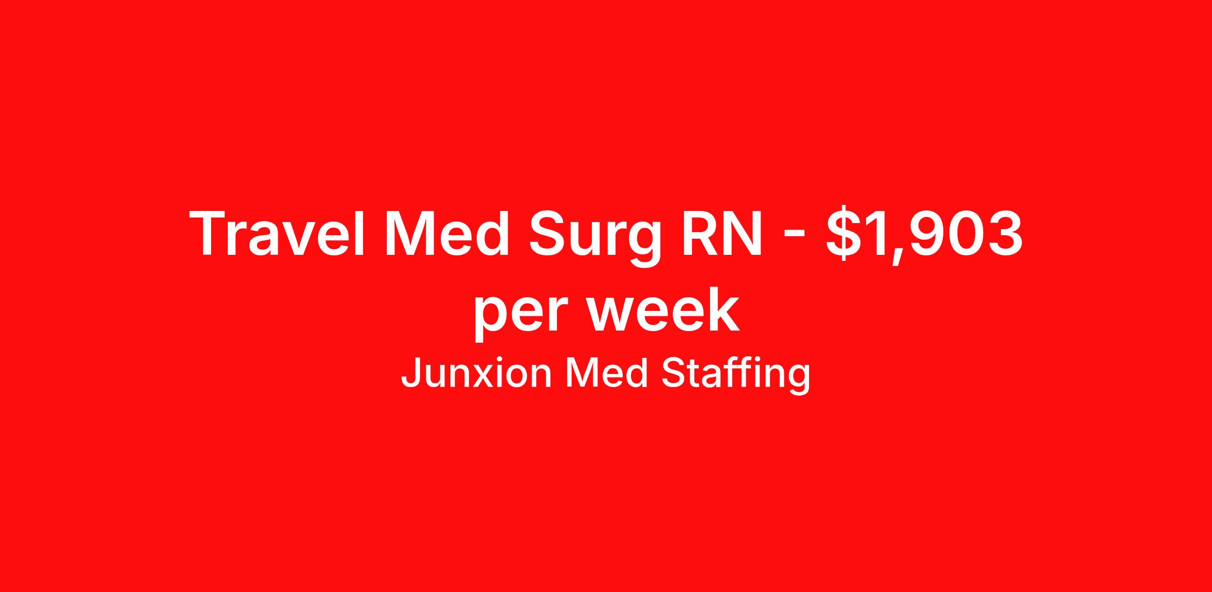 Junxion Med Staffing is seeking a travel nurse RN Med Surg for a travel nursing job in Santa Fe, New Mexico. Job Description & Requirements Specialty: Med Surg Discipline: RN Start Date: 04/06/2026 Duration: 13 weeks 36 hours per week Shift: 12 hours, nights Employment Type: Travel Summary: Junxion Med Staffing is looking for a Med surg RN to take an assignment in Santa Fe, New Mexico. This assignment lasts 13 WEEKS and is scheduled to start on April 6, 2026. If you don't like the start date, pay, or shift, then let’s talk. Give us a call opt 1 Job Details: Shift: 12H Nights Total Weekly Hours: 36 Certifications: BLS, Current New Mexico RN license or current Compact state license, BLS Certification Trauma Level: Benefits: Day 1 Insurance Additional bonus potential for every contract Additional vacation incentives Medical insurance with no more than $175 monthly premium for employee Employee Assistance Program (EAP) Referral bonus up to $1,000 401K and access to financial advisors for financial wellness and education A dedicated recruiter and support team that will help you every step of the way to sure you start on time and have an exceptional experience An agency ran by a traveler for travelers Click here for licensing requirements About the Company: Junxion Med Staffing is an award-winning healthcare staffing company with a mission to provide quality healthcare to our communities. Apply today to speak with a recruiter! Awards: RNVIP- Top 10 Travel Nursing Agencies of 2024 BluePipes – The Best Travel Nursing Companies 2023 *Estimated weekly pay includes projected hourly wages and weekly meal and lodging per diems for eligible clinicians based on nationally published GSA rates. Actual weekly pay and per diems may differ from the amount shown and may be subject to change during an assignment. For all employees and employee applicants, Junxion Med Staffing is an Equal Employment Opportunity ("EEO") Employer, including Disability/Vets, and welcomes all to apply. Junxion Med Staffing Job ID 1362777. Pay package is based on 12 hour shifts and 36 hours per week (subject to confirmation) with tax-free stipend amount to be determined. About Junxion Med Staffing Junxion Med Staffing was founded by a former healthcare traveler who understands the challenges healthcare professionals face - because we’ve been there. We specialize in placing travel nurses, allied health professionals, physicians, physician assistants, and nurse practitioners in both short-term and permanent roles across a wide range of specialties. Whether you're looking for a travel contract or a long-term fit, we work to ensure the right match between each healthcare professional and facility. At Junxion, we keep it simple: ● Transparent communication. No surprises, no hidden details, just honest conversations so you always know what to expect. ● Dedicated support. From job search to contract negotiations and throughout your assignment, you’ll have a recruiter who’s with you every step of the way. ● Competitive pay and benefits. We advocate for you to be fairly compensated and supported in your goals. ● A focus on your success. When healthcare professionals feel valued and empowered, patient care improves and that’s what it’s all about. You’re not just a number here. You’re part of a team that actually cares. Let’s find your next great opportunity together. Benefits Weekly pay Referral bonus Dental benefits Vision benefits 401k retirement plan Medical benefits Mileage reimbursement