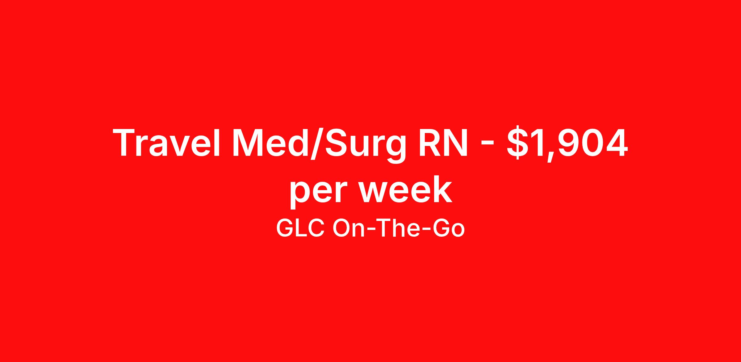 GLC On-The-Go is seeking a travel nurse RN Med Surg for a travel nursing job in Birmingham, Alabama. Job Description & Requirements Specialty: Med Surg Discipline: RN Start Date: 04/06/2026 Duration: 13 weeks 36 hours per week Shift: 12 hours Employment Type: Travel GLC is hiring: RN Med Surg - Birmingham, AL - 13-week contract GLC – Named Best Nurse Agency 2024–2025 We connect nurses, nursing professionals, and allied health professionals like you to contracts that align with your skills, schedule, and career goals. About this Assignment Join the care team in Med Surg where you’ll provide patient-centered care in a collaborative environment. Typical responsibilities include direct patient care, timely documentation, and coordination with the care team. Specific duties will be confirmed during your interview with a recruiter. Assignment Details Location: Birmingham, AL Assignment Length: 13 weeks Start Date: 04/06/2026 End Date: 07/06/2026 Pay Range: $1,714 - $1,904 Minimum Requirements Active license in Med Surg 1 year full-time RN, Med Surg experience within the last 2 years What you can expect from GLC Weekly on-time pay with direct deposit Transparent communication, clear assignment details, and recruiter support from start to finish - or extension Referral bonus up to $500 Health, dental, and vision insurance 401(k) plan Completion and signing bonuses may also be available Ready to move forward? Apply now and start your rewarding journey with GLC - a recruiter will connect quickly to review pay , start date , and assignment details so you can make the best decision for your next contract. GLC On-The-Go Job ID 504504. Pay package is based on 12 hour shifts and 36 hours per week (subject to confirmation) with tax-free stipend amount to be determined. Posted job title: Princeton - Travel: RN - 5 West Med/Surg Oncology - 18:30- 07:00 About GLC On-The-Go GLC is more than just a staffing agency – we’re your trusted partner in finding travel, local, and PRN contracts that align with your career aspirations and lifestyle. We specialize in connecting travel nurses and allied healthcare professionals like you with opportunities in acute care, long-term care, behavioral health, and allied fields across the U.S. Our attentive and friendly recruiters are always just a call or text away, ready to guide you at every step, ensuring you feel valued and heard. We understand the unique needs of travel healthcare professionals, which is why we offer comprehensive benefits and 24/7 support. Join GLC, where our 20 years of experience mean we know how to help you find the assignments that turn your career goals into reality. With us, it's not just a placement – it's your dream career made possible