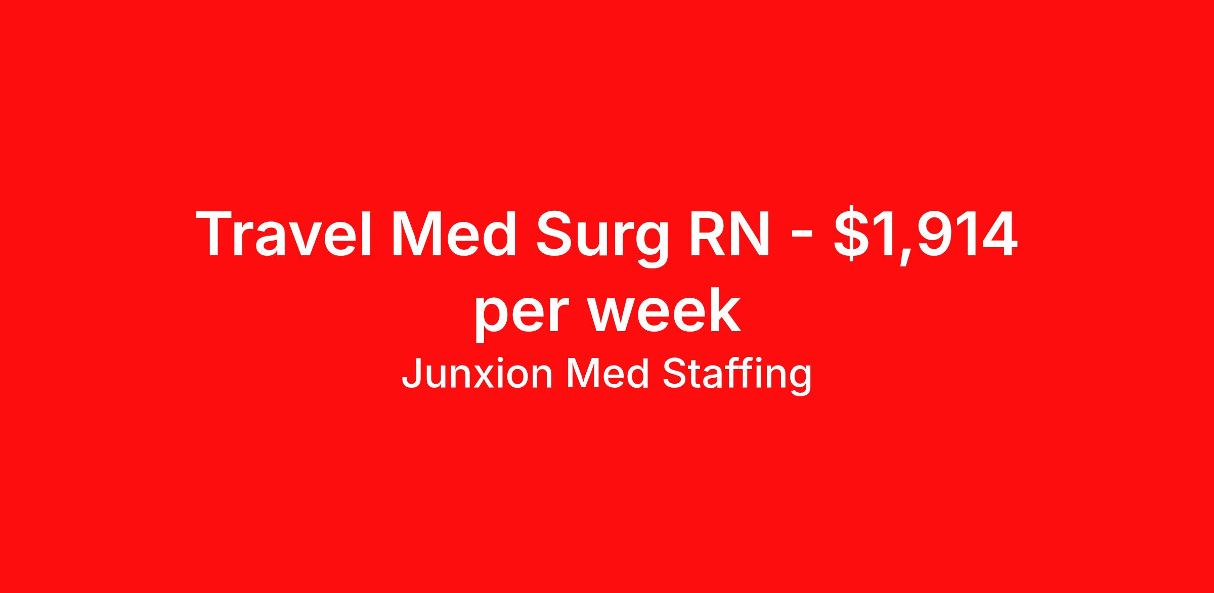 Junxion Med Staffing is seeking a travel nurse RN Med Surg for a travel nursing job in Santa Fe, New Mexico. Job Description & Requirements Specialty: Med Surg Discipline: RN Start Date: ASAP Duration: 13 weeks 36 hours per week Shift: 12 hours, nights Employment Type: Travel Summary: Junxion Med Staffing is looking for a Med surg RN to take an assignment in Santa Fe, New Mexico. This assignment lasts 13 WEEKS and is scheduled to start on March 2, 2026. If you don't like the start date, pay, or shift, then let’s talk. Give us a call opt 1 Job Details: Shift: 12H Nights Total Weekly Hours: 36 Certifications: BLS, Current New Mexico RN license or current Compact state license, BLS Certification Trauma Level: Benefits: Day 1 Insurance Additional bonus potential for every contract Additional vacation incentives Medical insurance with no more than $175 monthly premium for employee Employee Assistance Program (EAP) Referral bonus up to $1,000 401K and access to financial advisors for financial wellness and education A dedicated recruiter and support team that will help you every step of the way to sure you start on time and have an exceptional experience An agency ran by a traveler for travelers Click here for licensing requirements About the Company: Junxion Med Staffing is an award-winning healthcare staffing company with a mission to provide quality healthcare to our communities. Apply today to speak with a recruiter! Awards: RNVIP- Top 10 Travel Nursing Agencies of 2024 BluePipes – The Best Travel Nursing Companies 2023 *Estimated weekly pay includes projected hourly wages and weekly meal and lodging per diems for eligible clinicians based on nationally published GSA rates. Actual weekly pay and per diems may differ from the amount shown and may be subject to change during an assignment. For all employees and employee applicants, Junxion Med Staffing is an Equal Employment Opportunity ("EEO") Employer, including Disability/Vets, and welcomes all to apply. Junxion Med Staffing Job ID 1359183. Pay package is based on 12 hour shifts and 36 hours per week (subject to confirmation) with tax-free stipend amount to be determined. About Junxion Med Staffing Junxion Med Staffing was founded by a former healthcare traveler who understands the challenges healthcare professionals face - because we’ve been there. We specialize in placing travel nurses, allied health professionals, physicians, physician assistants, and nurse practitioners in both short-term and permanent roles across a wide range of specialties. Whether you're looking for a travel contract or a long-term fit, we work to ensure the right match between each healthcare professional and facility. At Junxion, we keep it simple: ● Transparent communication. No surprises, no hidden details, just honest conversations so you always know what to expect. ● Dedicated support. From job search to contract negotiations and throughout your assignment, you’ll have a recruiter who’s with you every step of the way. ● Competitive pay and benefits. We advocate for you to be fairly compensated and supported in your goals. ● A focus on your success. When healthcare professionals feel valued and empowered, patient care improves and that’s what it’s all about. You’re not just a number here. You’re part of a team that actually cares. Let’s find your next great opportunity together. Benefits Weekly pay Referral bonus Dental benefits Vision benefits 401k retirement plan Medical benefits Mileage reimbursement