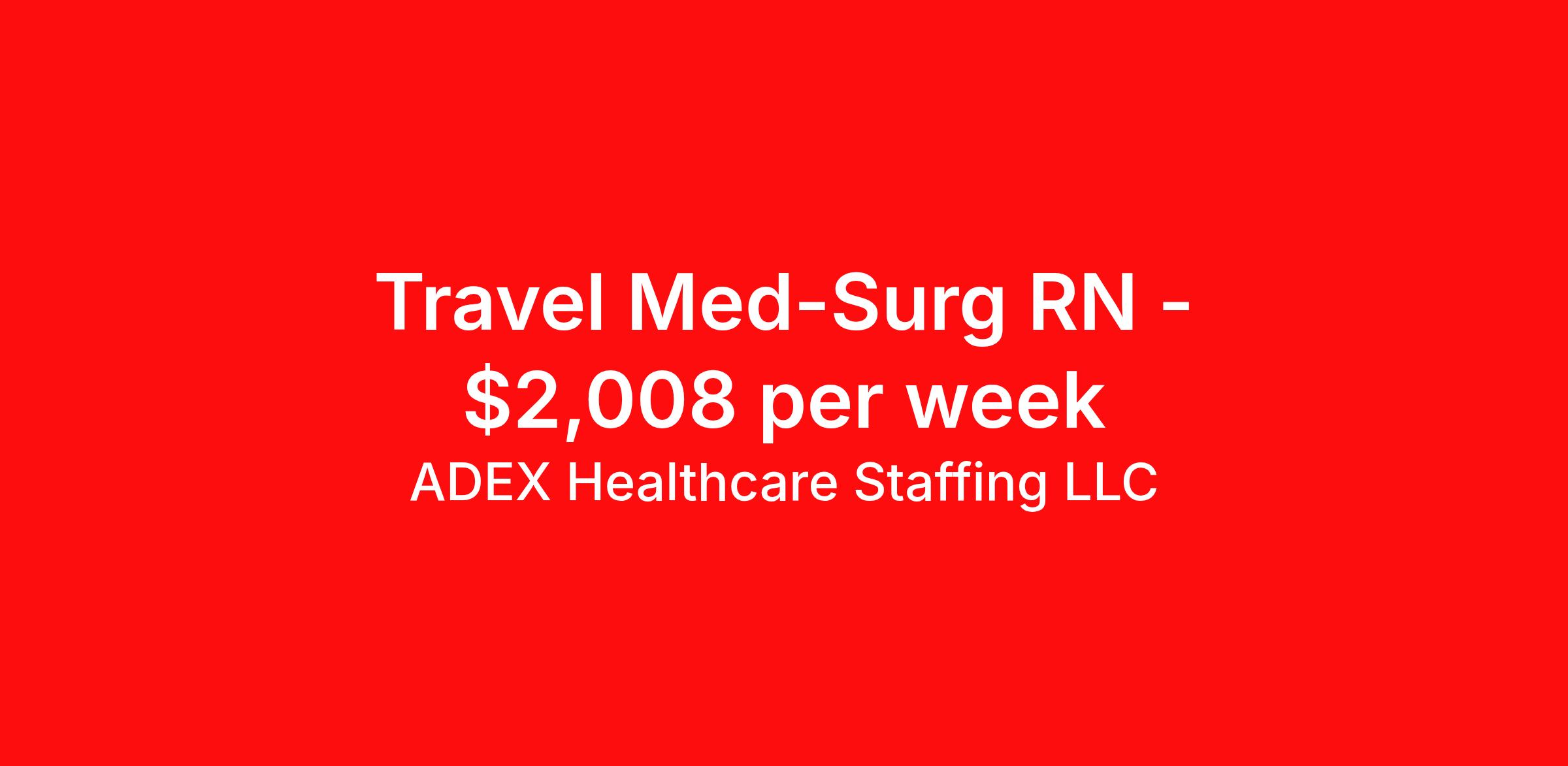 ADEX Healthcare Staffing LLC is seeking a travel nurse RN Med Surg for a travel nursing job in Espanola, New Mexico. Job Description & Requirements Specialty: Med Surg Discipline: RN Start Date: 04/13/2026 Duration: 13 weeks 36 hours per week Shift: 12 hours, nights Employment Type: Travel RN Position Job Notes: Travel or Local Registered Nurse needed for ASAP start. A minimum of 2 years of recent hospital bedside experience is required. Candidates must be able to start within 5 weeks. Opportunity for extension upon successful completion of the initial assignment. $750 referral bonus available. Opportunity: RN - Med Surg Job Details: • Work 12-hour night shifts from 7:00 PM to 7:30 AM • 0.9 FTE position with 36 guaranteed hours per week • Weekend and on-call/call back shifts as needed • Floating between departments and local locations within 20 miles is required • Must be a team player, flexible, and accustomed to fast-paced environment • At least one 13-week previous travel assignment required • Two years current experience required in specialty • EPIC experience preferred; can train on-site • Utilize nursing process to provide direct patient care to assigned group of patients • Assess, plan, implement, evaluate, and document individual patient needs • Coordinate patient care through collaboration with patient/family and healthcare team • Administer medications and treatments as prescribed by physician or standard protocols • Provide clinical supervision of LPNs and non-licensed assistive personnel • Complete patient population/age-specific/procedure and protocol education and competency testing • Required certifications: New Mexico or Compact State Nursing License, BLS certification through American Heart Association, American Health and Safety, or American Red Cross • Required education: Associates Degree in Nursing (ADN) or Associate of Science in Nursing (ASN) • English proficiency required (speak, read, write) Facility: This healthcare facility provides comprehensive medical and surgical services to the community, focusing on patient-centered care across multiple departments. The organization emphasizes safe, effective, timely, efficient, and equitable patient care while maintaining high standards for nursing excellence. The facility supports continuing education and competency development for healthcare professionals and utilizes modern healthcare technology systems to enhance patient care delivery. Location: Espanola, NM Espanola offers a unique blend of rich cultural heritage and stunning natural beauty in northern New Mexico, situated between Santa Fe and Taos. The area provides excellent outdoor recreation opportunities with access to skiing, hiking, and river activities, while maintaining a strong sense of community and cultural diversity that makes it an attractive location for healthcare professionals seeking an authentic southwestern experience. Adex Job ID 37052740. Pay package is based on 12 hour shifts and 36 hours per week (subject to confirmation) with tax-free stipend amount to be determined. About ADEX Healthcare Staffing LLC ADEX has been placing healthcare professionals across the US since 2004. Originally founded in Atlanta, GA, the company's headquarters are now located in Tampa, FL. JCAHO certified since 2009. Benefits Referral bonus