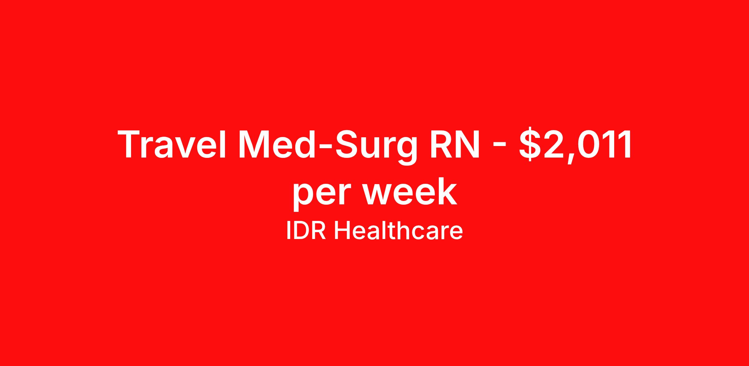 IDR Healthcare is seeking a travel nurse RN Med Surg for a travel nursing job in Salem, Virginia. Job Description & Requirements Specialty: Med Surg Discipline: RN Start Date: ASAP Duration: 13 weeks 36 hours per week Shift: 12 hours, nights Employment Type: Travel Why Choose IDR Healthcare? We are passionate about helping you find the perfect fit! Whether you are looking for an assignment across the country, across town, or somewhere in between - we are here to help. You’ll have a dedicated recruiter who is there to understand and advocate for your needs from beginning to end. Join the IDR family to experience travel the way it was meant to be. Benefits Weekly Pay! We offer competitive pay packages that allow you to max out your stipends! Medical, Dental, & Vision insurance – We cover up to 50% of your individual premium – Benefits kick in on the first day of the month. Access to unlimited behavioral and mental health sessions/support with a licensed counselor License, certification, and onboarding reimbursements 401(k) & ESOP - You get equity in (y)our company You have a dedicated recruiter that will understand your needs and make sure that you’re cared for before, during and after your assignment! We have positions in all 50 states! Work with a team that has achieved ClearlyRated’s 2023 Best of Staffing Client and Talent Diamond Award. This award marks our 10th consecutive win, underscoring the company’s unwavering dedication to service. Did you know fewer than 2% of all staffing companies in the US and Canada achieve the Best of Staffing Client Award, and fewer than 1% achieve the Talent and Employee-Satisfaction Awards?! Check us out on Instagram @IDRHealthcareStaffing and see what our travelers are up to by searching TravelFarWithIDR IDR Job ID 246834. Pay package is based on 12 hour shifts and 36 hours per week (subject to confirmation) with tax-free stipend amount to be determined. About IDR Healthcare IDR Healthcare is an awarding winning staffing firm that believes it is a privilege and awesome responsibility to serve those who selflessly care for others. Our mission is to empower healthcare professionals to achieve their fullest potential both personally and professionally while they create positive change within the healthcare community. We exercise true grit, tenacity, and authenticity while embracing and ownership mindset to go above and beyond providing healthcare professionals a world class experience. We are employee owned and our travelers and clinicians earn shares/equity by just completing multiple assignments! We have been named SIA’s Fastest Growing Staffing Firms and have won ClearlyRated® Best of Staffing for 11 consecutive years! This cements our commitment to clinician satisfaction earning top net promoter scores putting us in the top 2% of agencies in North America! Help us give back! For every booked assignment, proceeds are donated to St. Jude and Feeding America! Last year we raised over $18,000 for St. Jude and provided over 49,000 meals for children in need. TravelFarWithIDR and see what it is all about! Benefits Weekly pay 401k retirement plan Referral bonus Medical benefits Dental benefits License and certification reimbursement Vision benefits