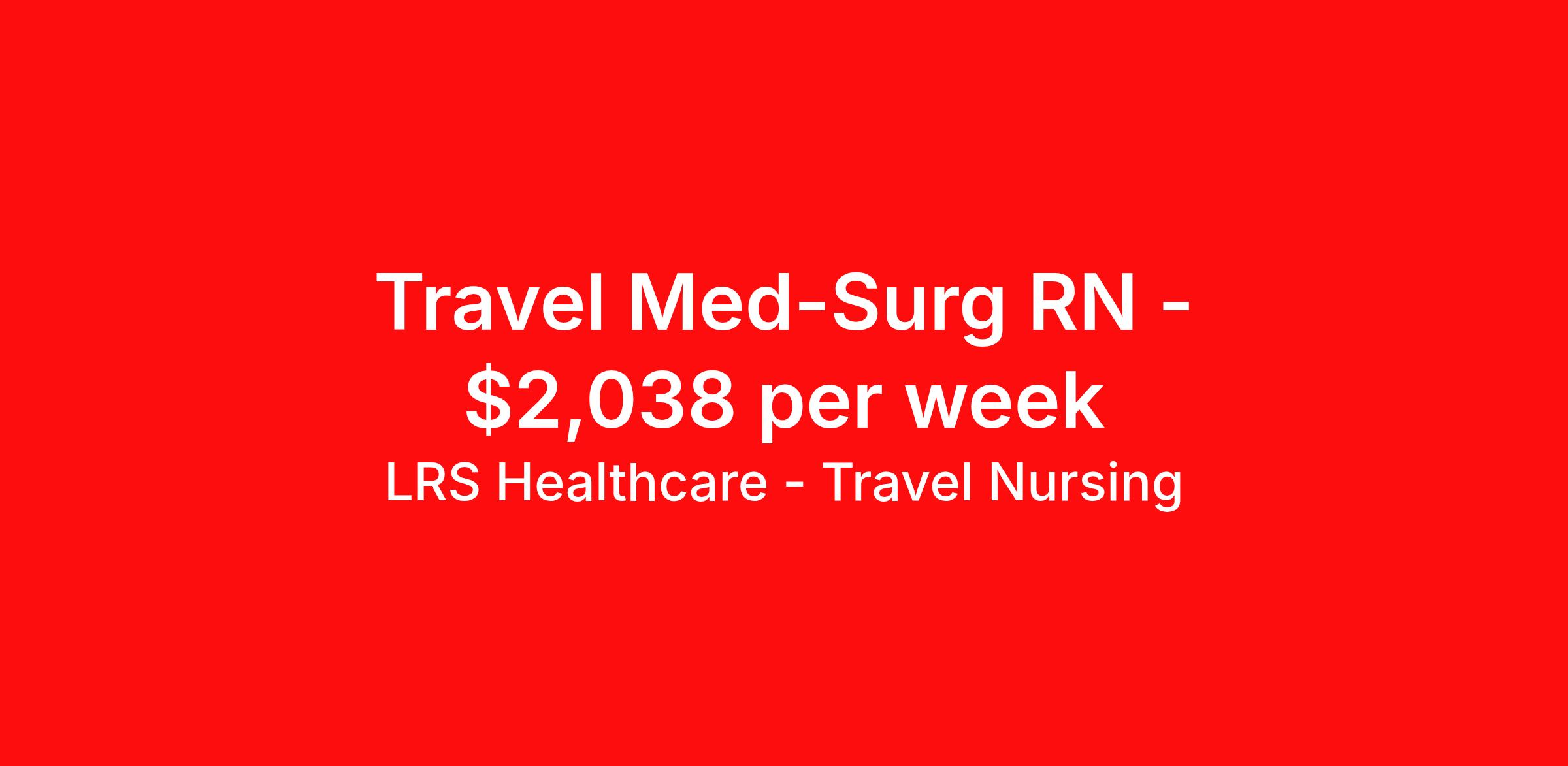 LRS Healthcare - Travel Nursing is seeking a travel nurse RN Med Surg for a travel nursing job in Espanola, New Mexico. Job Description & Requirements Specialty: Med Surg Discipline: RN Start Date: 04/13/2026 Duration: 13 weeks 36 hours per week Shift: 12 hours, nights Employment Type: Travel LRS Healthcare - Travel Nursing Job ID 74-72322. Pay package is based on 12 hour shifts and 36 hours per week (subject to confirmation) with tax-free stipend amount to be determined. About LRS Healthcare - Travel Nursing LRS Healthcare can lend a hand to take your career to new heights and places. As an industry leader in healthcare staffing, we work to connect you with jobs at top of the line facilities in the locations you’ve always wanted to live and visit. LRS is truly a full service medical staffing agency, so we take care of everything from housing and travel expenses to your itinerary, too. We handle it all because we want to be with you throughout your journey – not just your next placement. As a medical staffing agency that fosters long relationships with their employees, we’re determined to help amplify your personal and career growth through placement. We identify both temporary and permanent positions for candidates, and even some temp-to-perm positions that begin as 13-week programs. We have many positions available across the country, so let's discuss what would be a good fit for you! Benefits: Medical, Dental, and Vision Short-Term Disability Long-Term Disability Life Insurance 401(k) Certification & License Reimbursement Refer-a-friend Bonus Program Direct Deposit - Weekly 24-Hour Support Benefits Medical benefits Life insurance 401k retirement plan License and certification reimbursement Referral bonus Weekly pay
