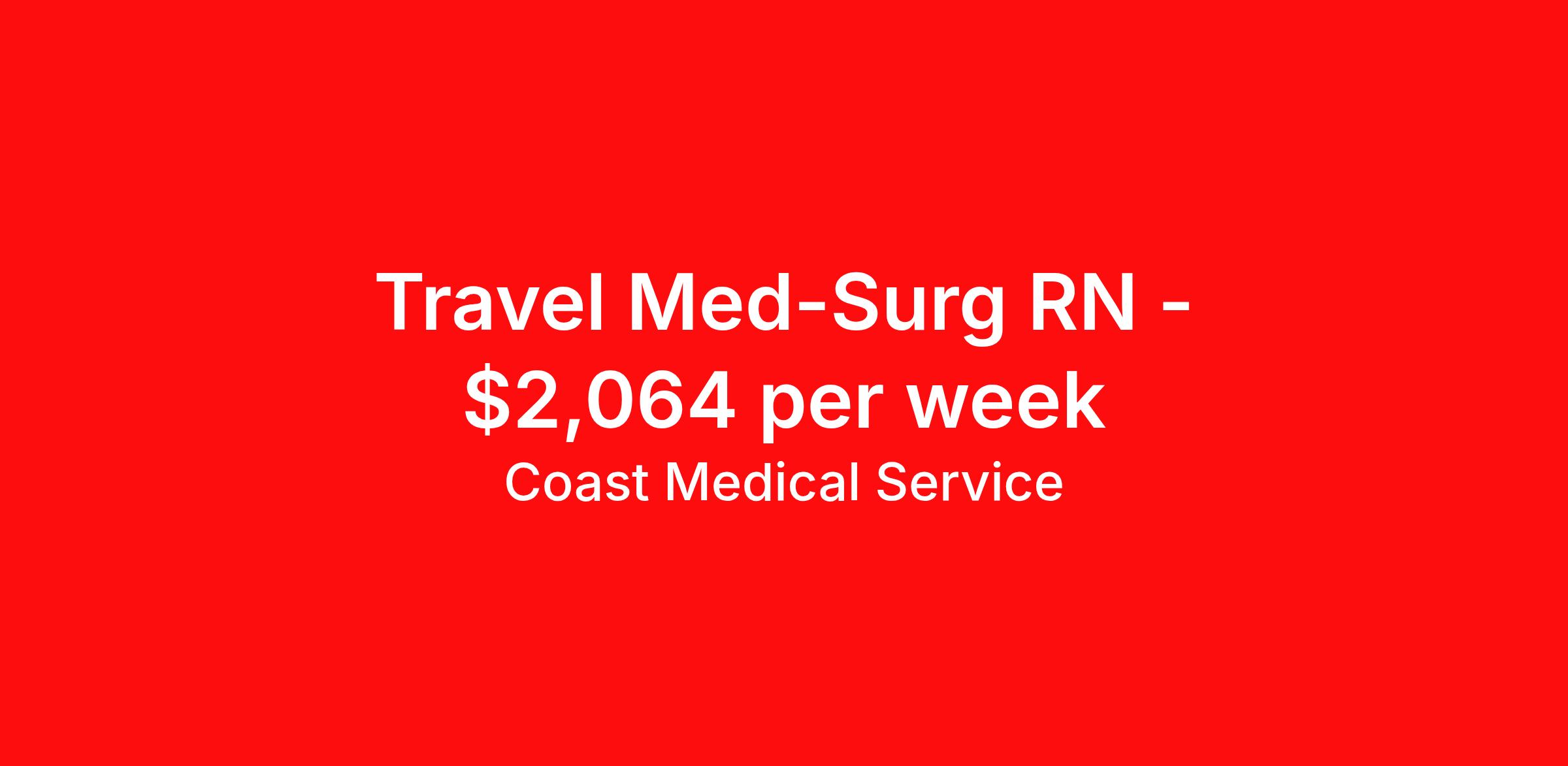 Coast Medical Service is seeking a travel nurse RN Med Surg for a travel nursing job in Carlsbad, New Mexico. Job Description & Requirements Specialty: Med Surg Discipline: RN Start Date: 04/06/2026 Duration: 13 weeks 36 hours per week Shift: 12 hours, nights Employment Type: Travel Coast Medical Service is a nationwide travel nursing & allied healthcare staffing agency dedicated to providing an elite traveler experience for the experienced or first-time traveler. Coast is featured on Blue Pipes' 2023 Best Travel Agencies and named a 2022 Top Rated Healthcare Staffing Firm & 2023 First Half Top Rated Healthcare Staffing Firm by Great Recruiters. Please note that pay rate may differ for locally based candidates. Please apply here or contact a recruiter directly to learn more about this position & the facility, and/or explore others that may be of interest to you. We look forward to speaking with you! Coast Medical Services Job ID 36069659. Pay package is based on 12 hour shifts and 36.0 hours per week (subject to confirmation) with tax-free stipend amount to be determined. Posted job title: RN:Medical-Surgical,19:00:00-07:30:00
