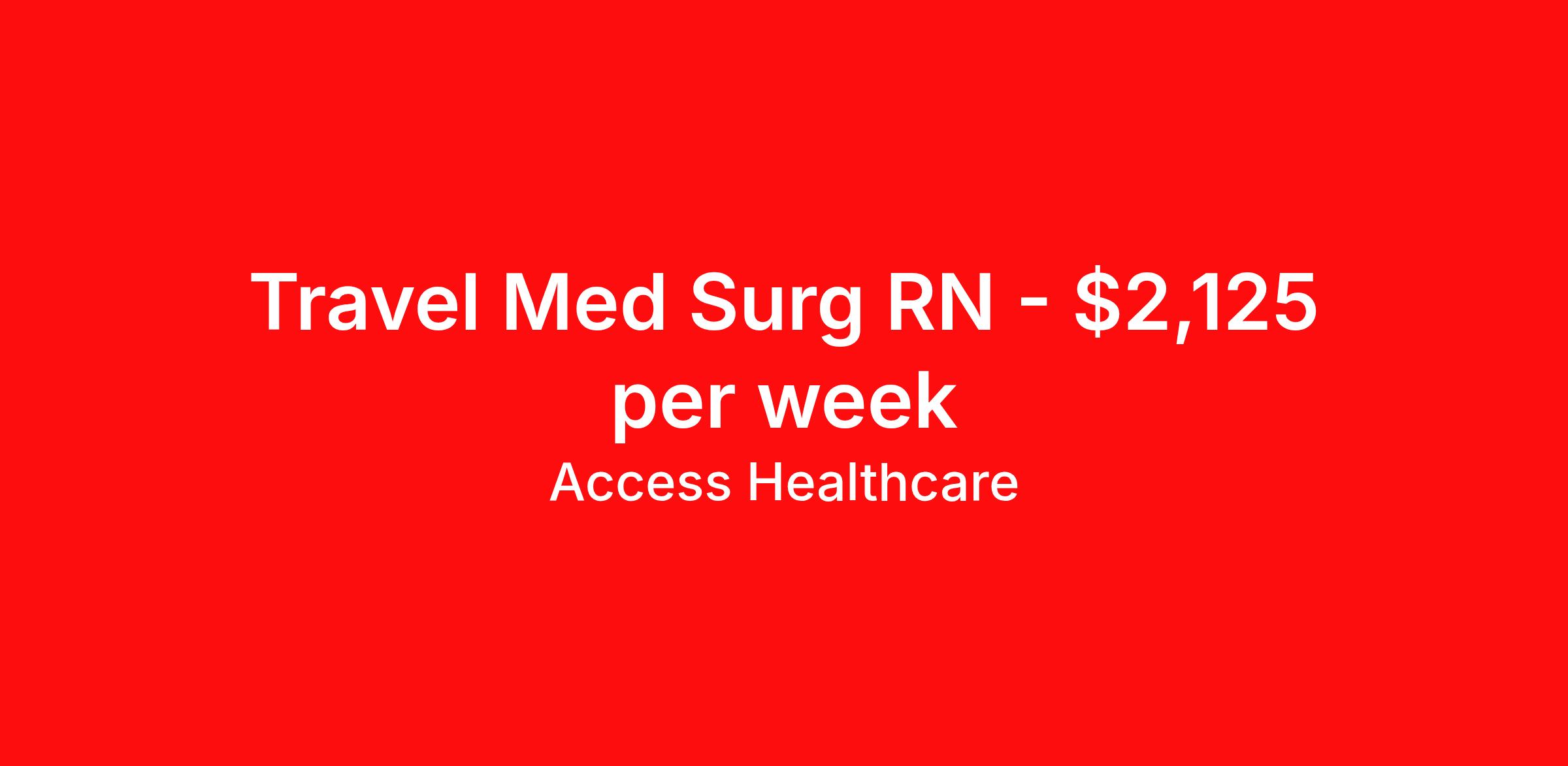 Access Healthcare is seeking a travel nurse RN Med Surg for a travel nursing job in Santa Fe, New Mexico. Job Description & Requirements Specialty: Med Surg Discipline: RN Start Date: 04/06/2026 Duration: 13 weeks 36 hours per week Shift: 12 hours, nights Employment Type: Travel Access Healthcare Job ID 76325762. Pay package is based on 12 hour shifts and 36 hours per week (subject to confirmation) with tax-free stipend amount to be determined. About Access Healthcare Access Healthcare aims to provide superior service to our nursing family by providing around the clock support, competitive pay packages and an unmatched benefits package! Unlike other agencies, we offer a true family feel and work with you to find the placement that is right for you. We offer one of the top leading pay packages in the industry and we are ready to get you the money you deserve! Access Healthcare was founded by two travel nurses, Danielle and Diego, who had a dream and a shared vision of creating an agency which all nurses would want to work with. Our passion has led us to where we are today as one of the top 10 agencies in our home state of New Jersey, with access to contracts in all 50 states! We encourage you to join our team and we cannot wait to get to know you!