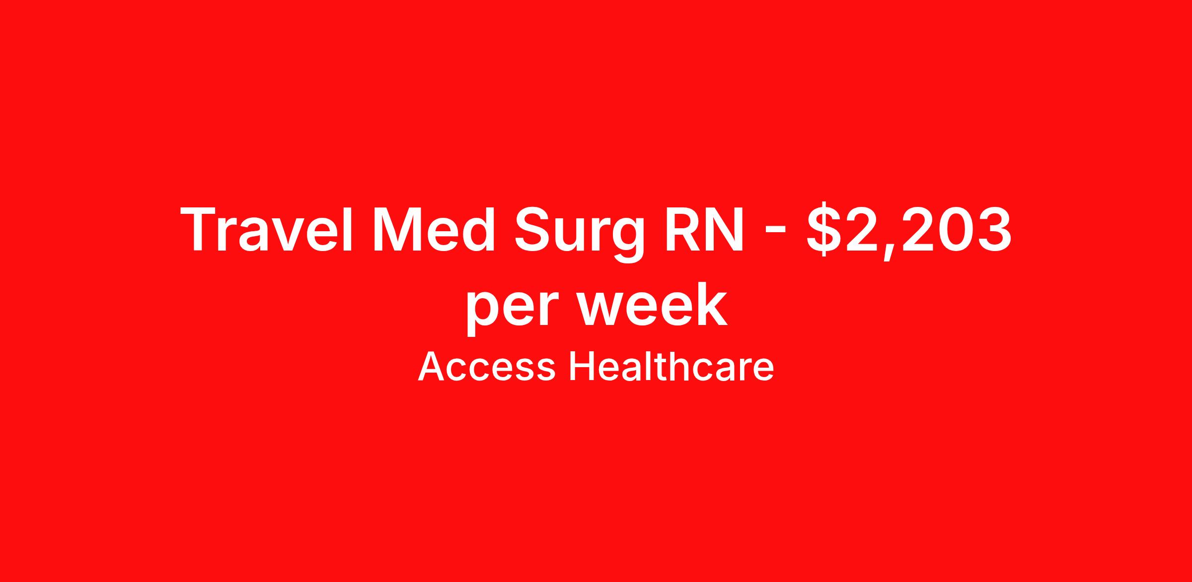 Access Healthcare is seeking a travel nurse RN Med Surg for a travel nursing job in Lander, Wyoming. Job Description & Requirements Specialty: Med Surg Discipline: RN Start Date: 04/06/2026 Duration: 13 weeks 36 hours per week Shift: 12 hours, nights Employment Type: Travel Access Healthcare Job ID 76182894. Pay package is based on 12 hour shifts and 36 hours per week (subject to confirmation) with tax-free stipend amount to be determined. About Access Healthcare Access Healthcare aims to provide superior service to our nursing family by providing around the clock support, competitive pay packages and an unmatched benefits package! Unlike other agencies, we offer a true family feel and work with you to find the placement that is right for you. We offer one of the top leading pay packages in the industry and we are ready to get you the money you deserve! Access Healthcare was founded by two travel nurses, Danielle and Diego, who had a dream and a shared vision of creating an agency which all nurses would want to work with. Our passion has led us to where we are today as one of the top 10 agencies in our home state of New Jersey, with access to contracts in all 50 states! We encourage you to join our team and we cannot wait to get to know you!