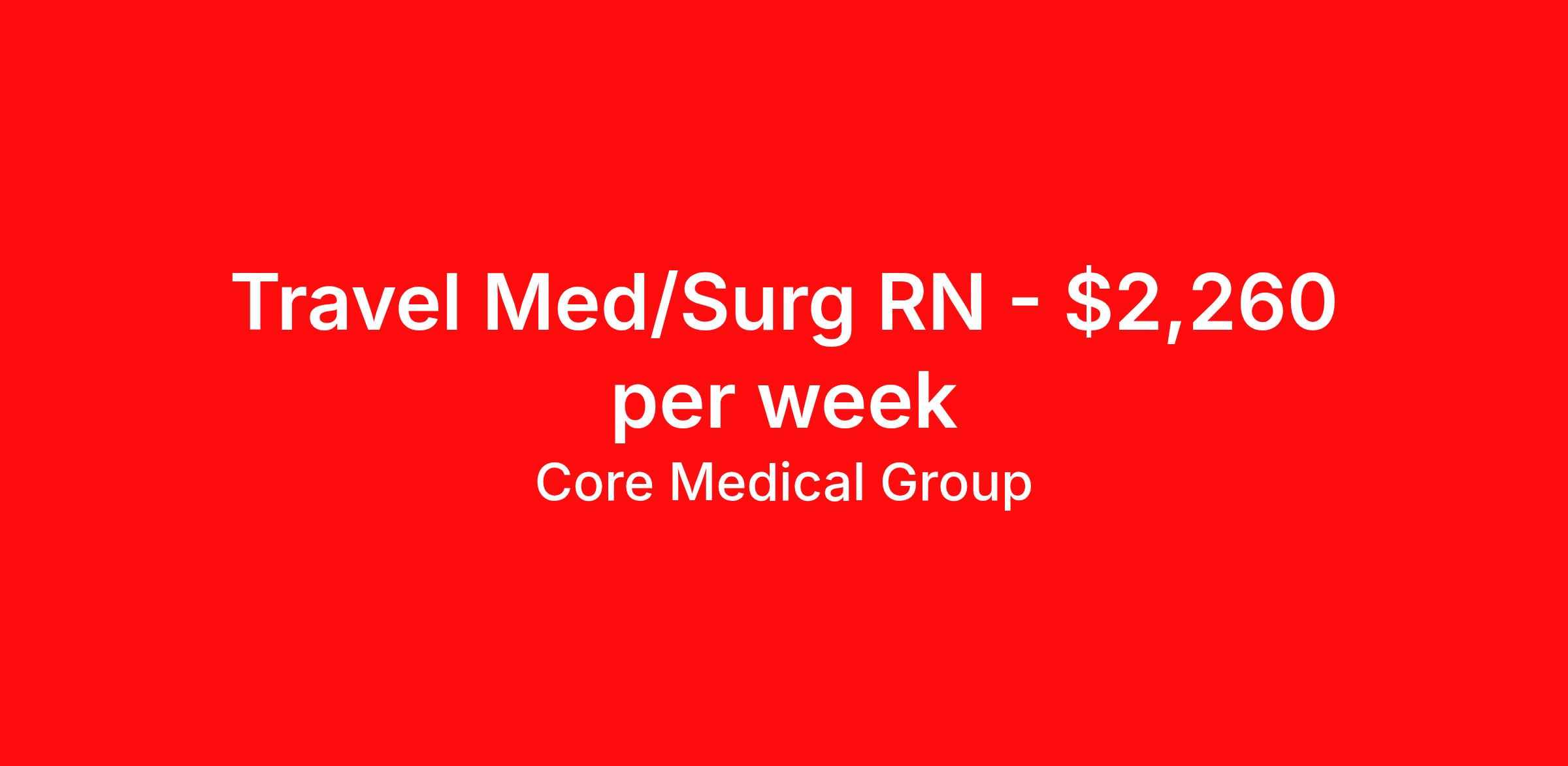 Core Medical Group is seeking a travel nurse RN Med Surg / Telemetry for a travel nursing job in Fairfield, California. Job Description & Requirements Specialty: Med Surg / Telemetry Discipline: RN Start Date: ASAP Duration: 13 weeks 36 hours per week Shift: 12 hours Employment Type: Travel Client in CA seeking Registered Nurse: Float Pool for the following shift(s): Days We are looking for a healthcare professional who is ready to provide exceptional patient care in this contract/travel role. Contract/travel assignments are typically 13 weeks, with potential to extend. Help us continue our mission to connect people, improve lives, and give back to the community by joining the CoreMedical Group team. When you work with CoreMedical Group, we put you first and treat you like family, supporting you every step of the way. CoreMedical Group is one of the largest healthcare staffing agencies in the country, with travel and contract positions located across the United States. Our recruiters will help you find the perfect job, whether it's across the country or across the street. In addition to dedicated, personalized support from your recruiter, when you work with CoreMedical Group you'll receive: Access to an extensive benefits package, including day 1 health, dental, and vision insurance, employer paid life insurance, a health reimbursement account, and more! Weekly paychecks with competitive pay packages Matching 401(k) benefits to help you save for retirement Licensure assistance and reimbursement to set you up for success on your contract Travel reimbursement and dedicated housing support while on assignment Referral cash bonuses when you connect us with other clinicians CoreMedical Group also offers you a free, all-inclusive vacation each year as our way of saying "thank you" for your hard work. Join other healthcare professionals on the annual Club CoreMed retreat and you'll see why our contract and travel professionals come back to us year after year! Your career is too valuable to tackle on your own. Let CoreMedical Group help you with your healthcare journey! *Estimate of weekly payments is intended for informational purposes and includes hourly wages, as well as reimbursements for meal & incidental expenses, and housing expenses incurred on behalf of the Company. Any benefits (medical/dental/vision) are in addition to the weekly pay. Please speak with your Recruiter for additional details. Estimated payments are subject to change until formal offer of assignment is made and accepted. Core Medical Group Job ID 1357101. Pay package is based on 12 hour shifts and 36 hours per week (subject to confirmation) with tax-free stipend amount to be determined. Posted job title: RN About Core Medical Group CoreMedical Group is one of the largest healthcare staffing agencies in the country. We have jobs nationwide in travel nursing, travel allied health, interim, locum tenens, and permanent placements! Join the staffing agency with Club CoreMed, the best perk in the industry - an all inclusive paid trip to a tropical resort! Benefits Weekly pay Holiday Pay Guaranteed Hours Continuing Education 401k retirement plan Pet insurance Company provided housing options Sick pay Wellness and fitness programs Mileage reimbursement Referral bonus Employee assistance programs Medical benefits Dental benefits Vision benefits Benefits start day 1 License and certification reimbursement Life insurance Discount program