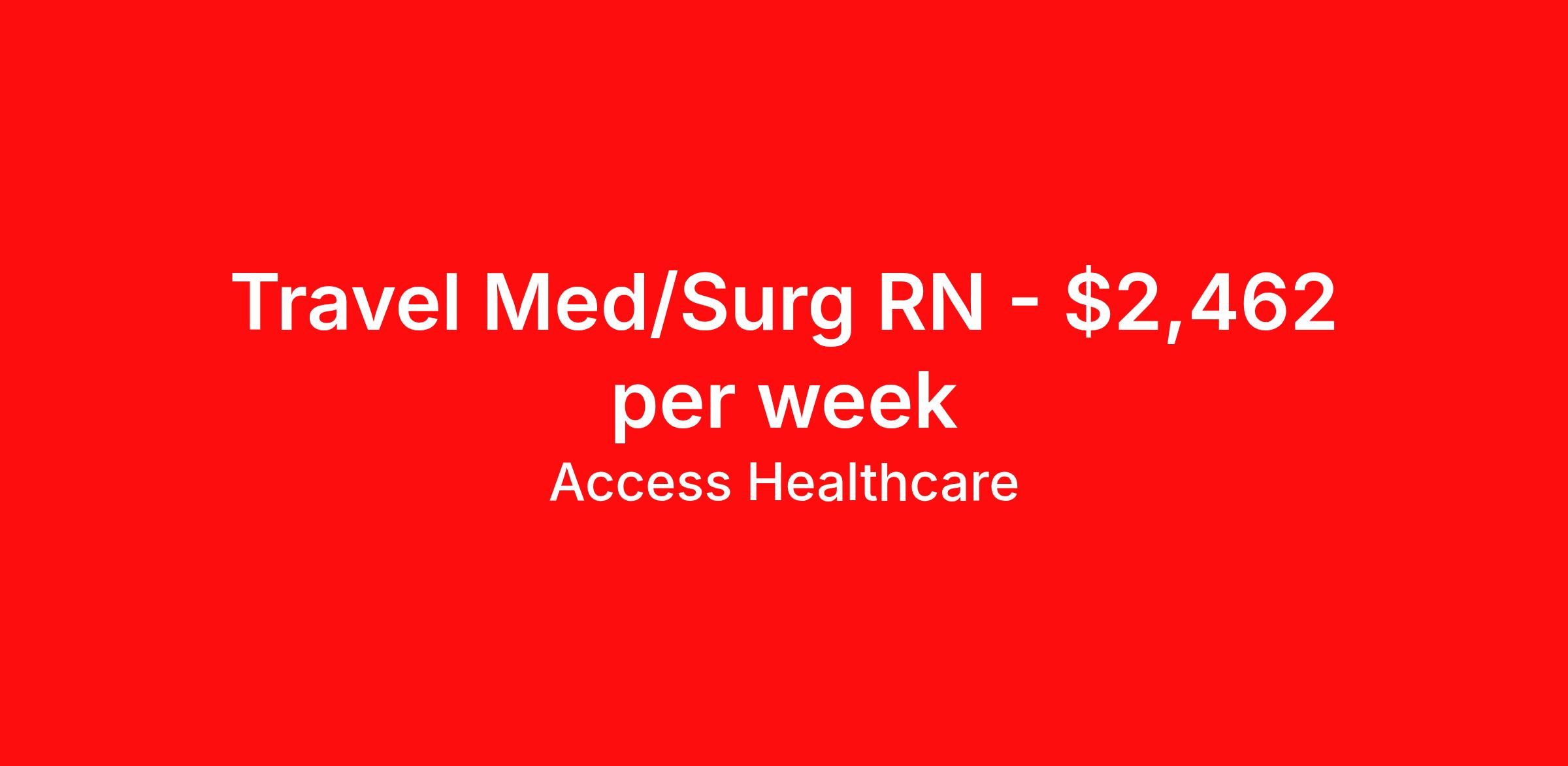 Access Healthcare is seeking a travel nurse RN Med Surg for a travel nursing job in Lebanon, New Hampshire. Job Description & Requirements Specialty: Med Surg Discipline: RN Start Date: 04/13/2026 Duration: 12 weeks 36 hours per week Shift: 12 hours, rotating Employment Type: Travel Access Healthcare Job ID 75842082. Pay package is based on 12 hour shifts and 36 hours per week (subject to confirmation) with tax-free stipend amount to be determined. About Access Healthcare Access Healthcare aims to provide superior service to our nursing family by providing around the clock support, competitive pay packages and an unmatched benefits package! Unlike other agencies, we offer a true family feel and work with you to find the placement that is right for you. We offer one of the top leading pay packages in the industry and we are ready to get you the money you deserve! Access Healthcare was founded by two travel nurses, Danielle and Diego, who had a dream and a shared vision of creating an agency which all nurses would want to work with. Our passion has led us to where we are today as one of the top 10 agencies in our home state of New Jersey, with access to contracts in all 50 states! We encourage you to join our team and we cannot wait to get to know you!