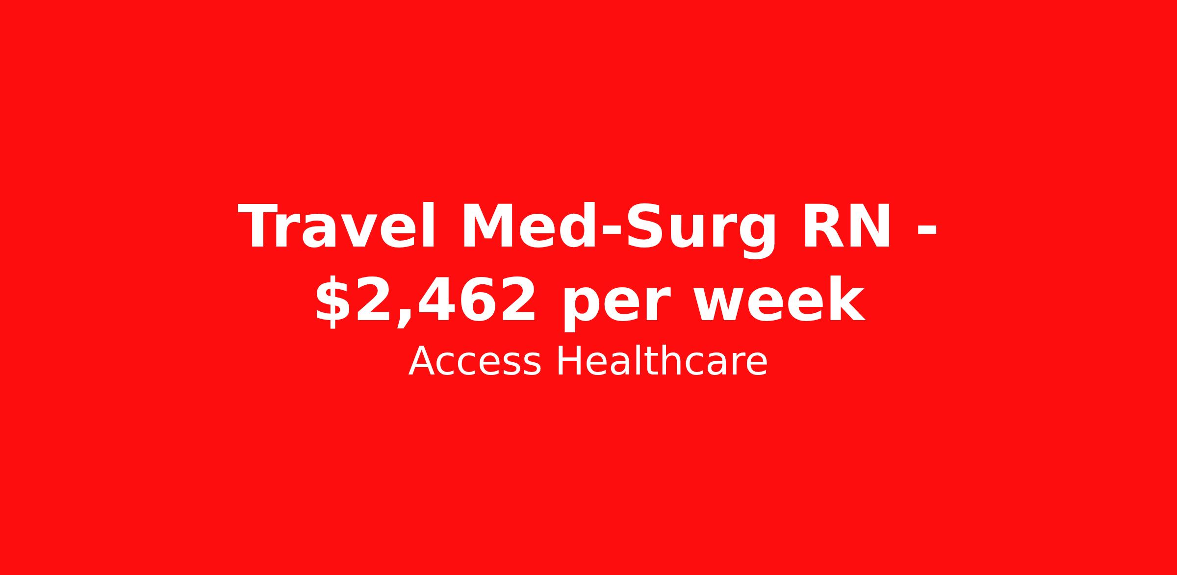 Access Healthcare is seeking a travel nurse RN Med Surg for a travel nursing job in Scottsbluff, Nebraska. Job Description & Requirements Specialty: Med Surg Discipline: RN Start Date: ASAP Duration: 13 weeks 36 hours per week Shift: 12 hours, rotating Employment Type: Travel Access Healthcare Job ID 76471127. Pay package is based on 12 hour shifts and 36 hours per week (subject to confirmation) with tax-free stipend amount to be determined. About Access Healthcare Access Healthcare aims to provide superior service to our nursing family by providing around the clock support, competitive pay packages and an unmatched benefits package! Unlike other agencies, we offer a true family feel and work with you to find the placement that is right for you. We offer one of the top leading pay packages in the industry and we are ready to get you the money you deserve! Access Healthcare was founded by two travel nurses, Danielle and Diego, who had a dream and a shared vision of creating an agency which all nurses would want to work with. Our passion has led us to where we are today as one of the top 10 agencies in our home state of New Jersey, with access to contracts in all 50 states! We encourage you to join our team and we cannot wait to get to know you!