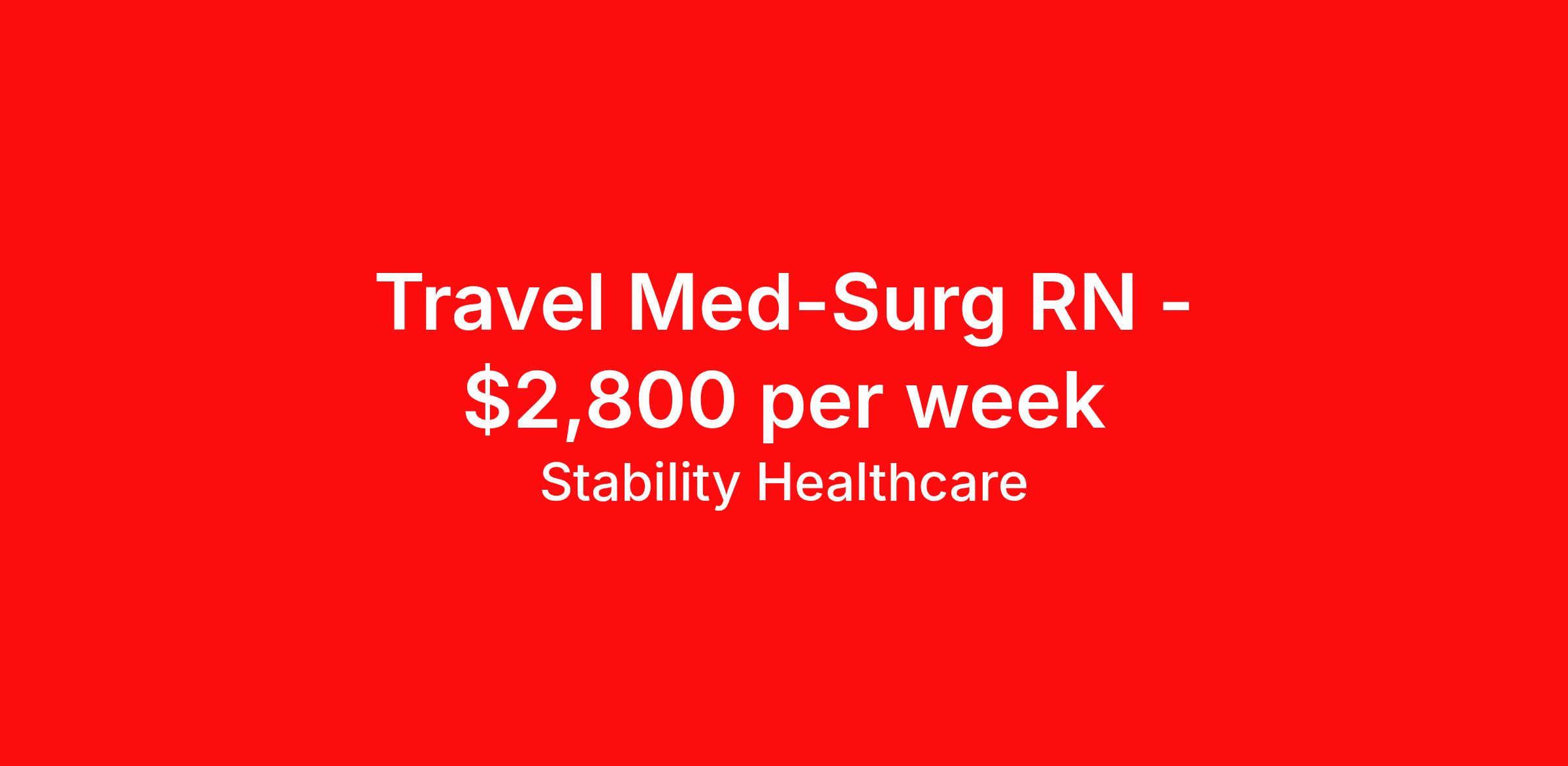 Stability Healthcare is seeking a travel nurse RN Med Surg for a travel nursing job in Willits, California. Job Description & Requirements Specialty: Med Surg Discipline: RN Duration: 13 weeks 48 hours per week Shift: 12 hours, nights Employment Type: Travel Stability Healthcare is looking for a Med-Surg RN contract position in Willits, CA. The majority of hospitalized patients are admitted to M/S either directly or after surgery. M/S is also where patients who have been in critical care (ICU) are transferred when they no longer need critical care but still require nursing care. *$600 travel bonus *Day 1 health insurance with United Healthcare *PTO plan start accruing on day 1, use during contract or cash out at the end! *Guaranteed stipend if facility calls you off *Extra hour bonus earn an additional hourly bonus for working over your weekly contracted hours Stability Job ID 824435. Pay package is based on 12 hour shifts and 48 hours per week (subject to confirmation) with tax-free stipend amount to be determined. Posted job title: Med-Surg About Stability Healthcare Stability Healthcare was founded in 2009, with the mission of becoming the best Travel Nursing Agency in California. We have been rated one of the top travel nursing agencies and offer our nurses the highest paying travel nursing jobs available. We have access to the best travel assignments from 1000’s of facilities. You can start the year off in sunny California, spend the Spring in the Colorado Rockies, enjoy the Summer in the Mid-West, experience the change of seasons in Boston and New York, and hit the beaches of Florida in the winter. Our Nurses work in the best hospitals and health systems in the country. Benefits Guaranteed Hours Benefits start day 1