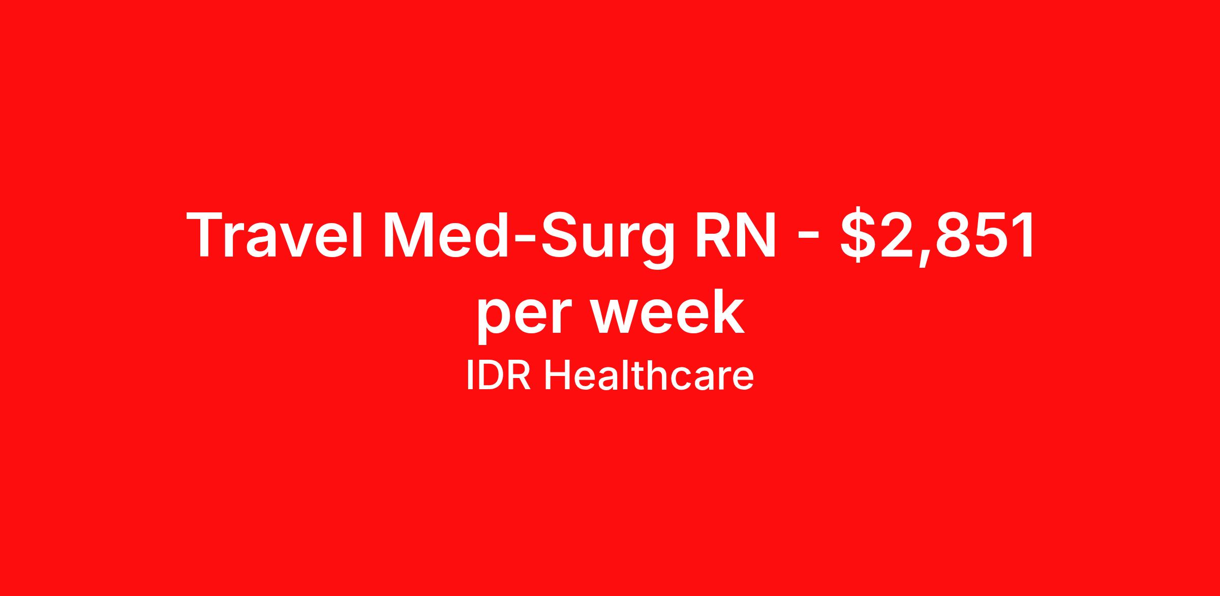 IDR Healthcare is seeking a travel nurse RN Med Surg for a travel nursing job in Wichita, Kansas. Job Description & Requirements Specialty: Med Surg Discipline: RN Start Date: ASAP Duration: 13 weeks 48 hours per week Shift: 12 hours Employment Type: Travel IDR Healthcare is an awarding winning staffing firm that believes it is a privilege and awesome responsibility to serve those who selflessly care for others. Our mission is to empower healthcare professionals to achieve their fullest potential both personally and professionally while they create positive change within the healthcare community. We exercise true grit, tenacity, and authenticity while embracing and ownership mindset to go above and beyond providing healthcare professionals a world class experience. We are employee owned and our travelers and clinicians earn shares/equity by just completing multiple assignments! We have been named SIA’s Fastest Growing Staffing Firms and have won ClearlyRated® Best of Staffing for 11 consecutive years! This cements our commitment to clinician satisfaction earning top net promoter scores putting us in the top 2% of agencies in North America! TravelFarWithIDR and see what an extraordinary experience is all about! Benefits 2024 World Staffing Best Staffing Firms to Work For! ESOP (Equity) Healthcare Benefits for up to 30 days Between Assignments. Comprehensive Health Insurance Dental and Vision Insurance Sign-On, Completion, & Referral Bonus Programs License and Certification Reimbursement Weekly Pay and Competitive Compensation Large Network of Clients and Job Opportunities 401k retirement plan Exclusive Assignments IDR Job ID 349428. Pay package is based on 12 hour shifts and 48 hours per week (subject to confirmation) with tax-free stipend amount to be determined. About IDR Healthcare IDR Healthcare is an awarding winning staffing firm that believes it is a privilege and awesome responsibility to serve those who selflessly care for others. Our mission is to empower healthcare professionals to achieve their fullest potential both personally and professionally while they create positive change within the healthcare community. We exercise true grit, tenacity, and authenticity while embracing and ownership mindset to go above and beyond providing healthcare professionals a world class experience. We are employee owned and our travelers and clinicians earn shares/equity by just completing multiple assignments! We have been named SIA’s Fastest Growing Staffing Firms and have won ClearlyRated® Best of Staffing for 11 consecutive years! This cements our commitment to clinician satisfaction earning top net promoter scores putting us in the top 2% of agencies in North America! Help us give back! For every booked assignment, proceeds are donated to St. Jude and Feeding America! Last year we raised over $18,000 for St. Jude and provided over 49,000 meals for children in need. TravelFarWithIDR and see what it is all about! Benefits Weekly pay 401k retirement plan Referral bonus Medical benefits Dental benefits License and certification reimbursement Vision benefits