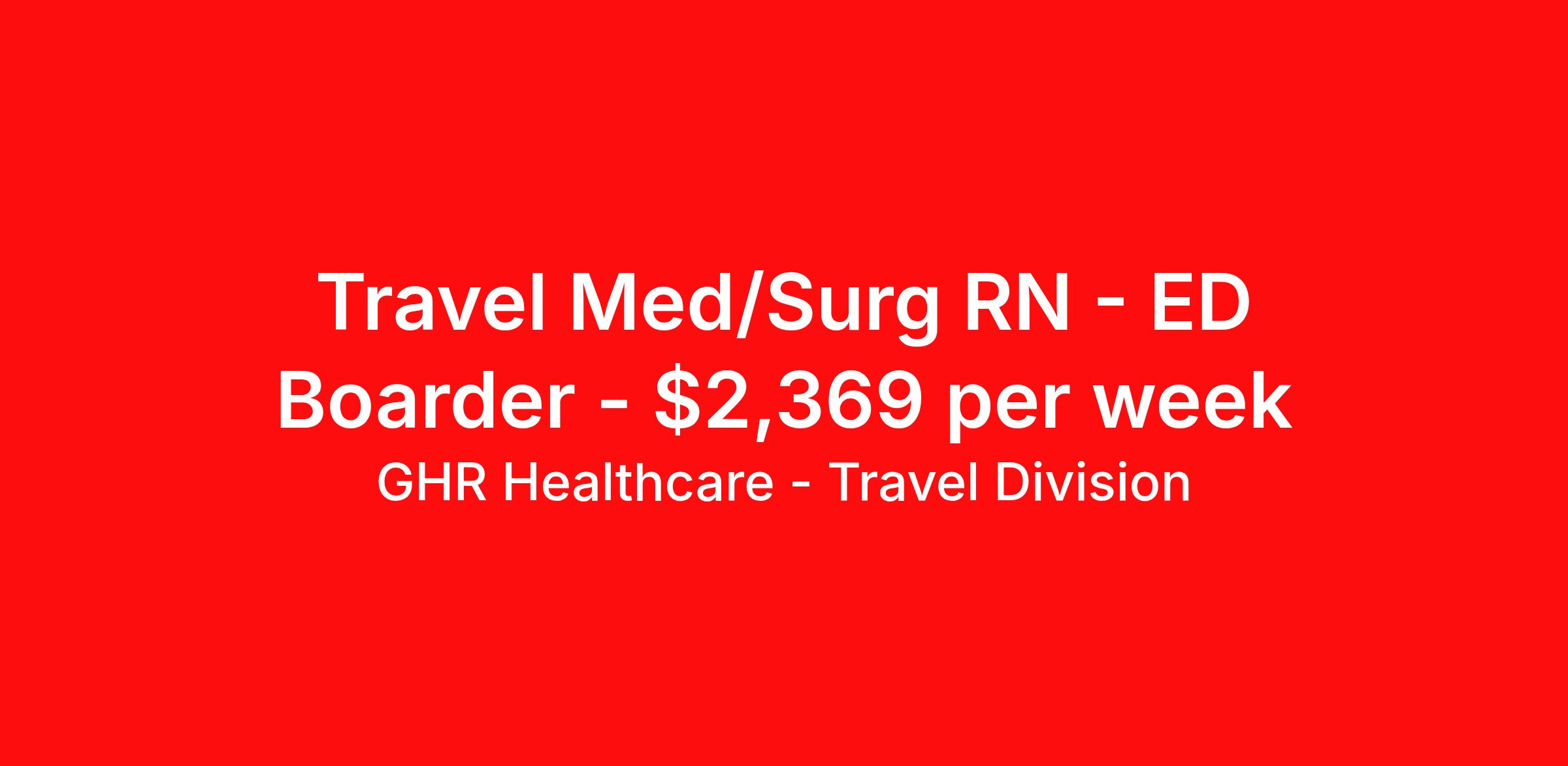GHR Healthcare - Travel Division is seeking a travel nurse RN Med Surg Level III for a travel nursing job in Rochester, New York. Job Description & Requirements Specialty: Med Surg Discipline: RN Start Date: 04/13/2026 Duration: 12 weeks 36 hours per week Shift: 12 hours Employment Type: Travel GHR Healthcare - Travel Division Job ID 76438249. Pay package is based on 12 hour shifts and 36 hours per week (subject to confirmation) with tax-free stipend amount to be determined. About GHR Healthcare - Travel Division For over 30 years, GHR Healthcare has been the bridge between healthcare professionals and the facilities that need them nationwide. We're committed to uncovering your ideal fit, supported by GHR's dedication to competitive compensation, transparent communication, and a devoted team that genuinely cares about your career journey. You can trust us to stand by your side as your advocate, confidante, and partner in advancing your career. At GHR, care and consideration are at the heart of everything we do. Visit ghrhealthcare.com to learn more.