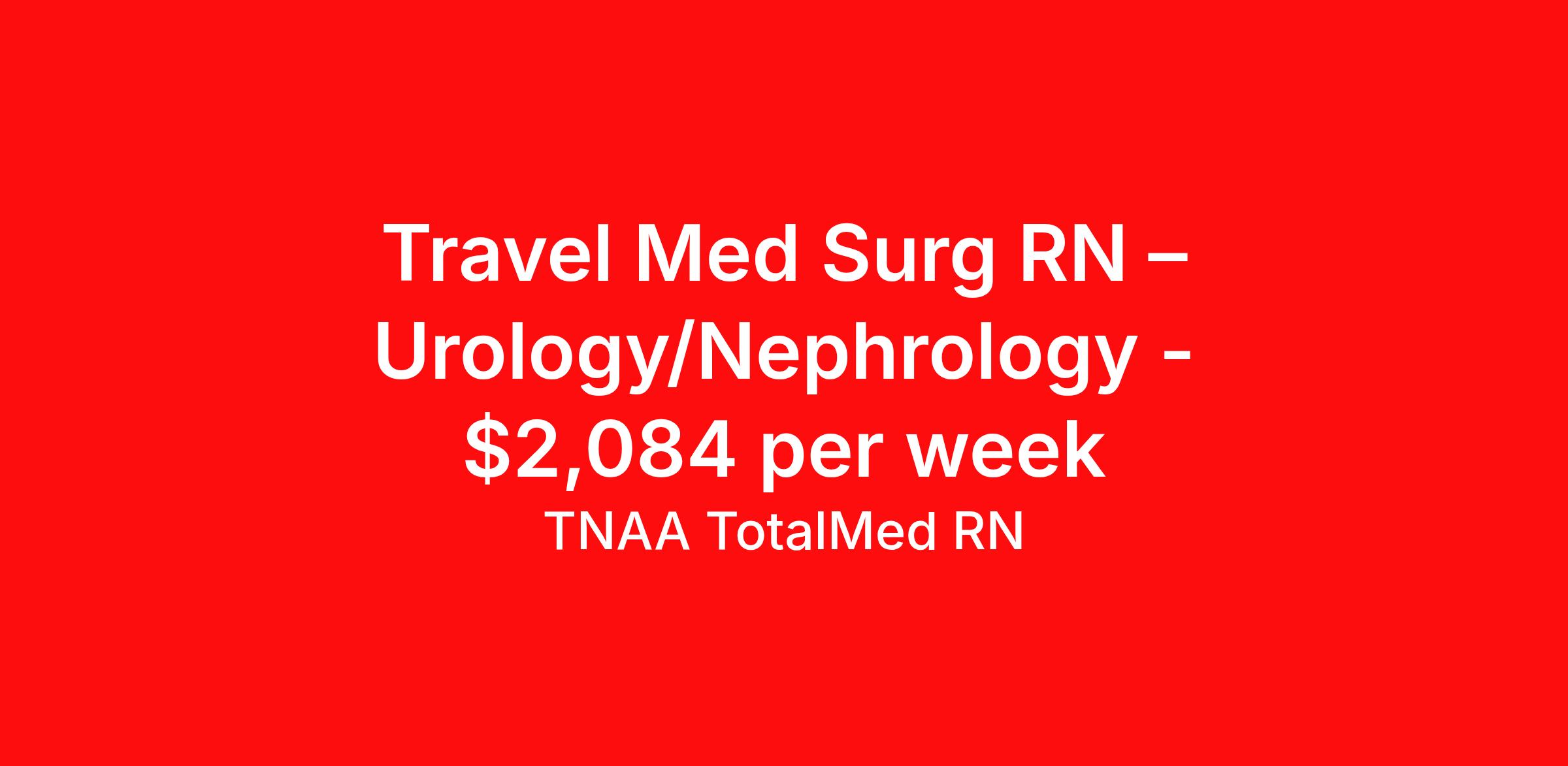 TNAA TotalMed RN is seeking a travel nurse RN Med Surg for a travel nursing job in Springfield, Illinois. Job Description & Requirements Specialty: Med Surg Discipline: RN Duration: 13 weeks 36 hours per week Shift: 12 hours, nights Employment Type: Travel We're looking for Medical Surgical RNs for an immediate travel nurse opening in Springfield, IL. The right RN should have 1-2 years recent acute care experience. Read below for more requirements. As a MedSurg RN, you will conduct patient assessments and prioritize data collection based on patients' immediate conditions or needs. MedSurg RNs perform ongoing assessments and appropriate treatments as ordered by a physician. Documenting patient findings and providing education and support to patients' families is essential to this travel nurse position. As a Medical Surgical Travel Nurse, you should be prepared to perform the following tasks: Provide bedside care for a variety of patients, including pre- and post-op patients. Prepare, administer and record prescribed medication, reporting any adverse reactions to treatment. Change dressings, insert catheters and start IVs. Prepares equipment and aids physician during examination and treatment of patient. Educates patients on surgical procedures. Participates in discharge planning and initiates patient education plan as prescribed by physician. Medical Surgical Travel Nurses should be able to stand and walk for long periods of time, as well as bend, lean and stoop without difficulty. RNs should be able to easily lift 20 pounds. Moving or lifting of patients may require lifting of up to 50 pounds at times. RNs will work in a fast-paced environment treating patients that may be confused, agitated, and/or uncooperative. Requirements*: BLS, 2 Years * Additional certifications may be required before beginning an assignment. TotalMed Travel Job ID 1388755. Pay package is based on 12 hour shifts and 36 hours per week (subject to confirmation) with tax-free stipend amount to be determined. Posted job title: Medical/Surgical - MedSurg RN - Travel Nurse About TNAA TotalMed RN TotalMed is a Top Ten, travel nursing and healthcare staffing agency with the mission of igniting purpose in healthcare. The organization staffs nurses, therapists, pharmacists, and other clinicians of all specialties in all 50 states. They offer local and travel jobs and match caregivers with the right organization to assist both facilities and patients. As an organization, they focus on putting highly-skilled staff into facilities to ensure adequate staffing for a better patient experience. TotalMed specializes in recruiting and placing healthcare professionals in travel, PRN, and permanent positions across the country in Nursing and Allied Health. Throughout 2020, the organization filled roles at even the most short-staffed facilities during the most challenging time in healthcare. By matching the right travel healthcare professional with the right organization, TotalMed continues to offer a lifeline to facilities and their patients. Benefits Weekly pay Guaranteed Hours Continuing Education 401k retirement plan Sick pay Wellness and fitness programs Referral bonus Employee assistance programs Medical benefits Dental benefits Vision benefits Benefits start day 1
