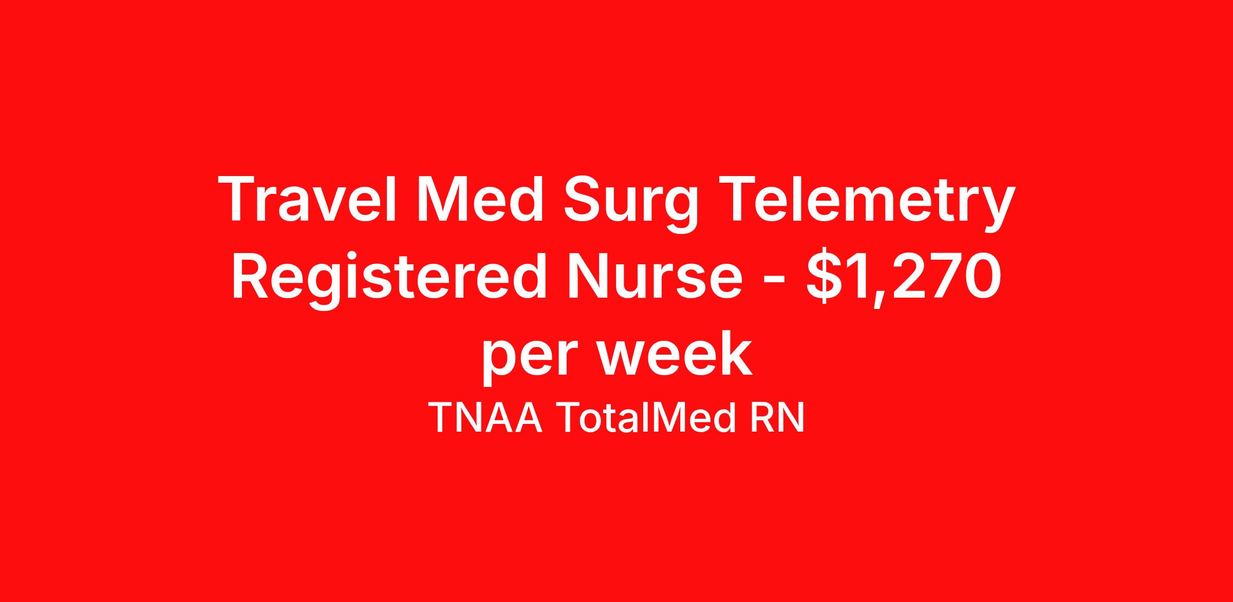 TNAA TotalMed RN is seeking a travel nurse RN Med Surg for a travel nursing job in Decatur, Texas. Job Description & Requirements Specialty: Med Surg Discipline: RN Start Date: ASAP Duration: 13 weeks 36 hours per week Shift: 12 hours, nights Employment Type: Travel We're looking for Medical Surgical RNs for an immediate travel nurse opening in Decatur, TX. The right RN should have 1-2 years recent acute care experience. Read below for more requirements. As a MedSurg RN, you will conduct patient assessments and prioritize data collection based on patients' immediate conditions or needs. MedSurg RNs perform ongoing assessments and appropriate treatments as ordered by a physician. Documenting patient findings and providing education and support to patients' families is essential to this travel nurse position. As a Medical Surgical Travel Nurse, you should be prepared to perform the following tasks: Provide bedside care for a variety of patients, including pre- and post-op patients. Prepare, administer and record prescribed medication, reporting any adverse reactions to treatment. Change dressings, insert catheters and start IVs. Prepares equipment and aids physician during examination and treatment of patient. Educates patients on surgical procedures. Participates in discharge planning and initiates patient education plan as prescribed by physician. Medical Surgical Travel Nurses should be able to stand and walk for long periods of time, as well as bend, lean and stoop without difficulty. RNs should be able to easily lift 20 pounds. Moving or lifting of patients may require lifting of up to 50 pounds at times. RNs will work in a fast-paced environment treating patients that may be confused, agitated, and/or uncooperative. Requirements*: ACLS, BLS, NIH, 1 Year * Additional certifications may be required before beginning an assignment. TotalMed Travel Job ID 1379540. Pay package is based on 12 hour shifts and 36 hours per week (subject to confirmation) with tax-free stipend amount to be determined. Posted job title: Medical/Surgical - MedSurg RN - Travel Nurse About TNAA TotalMed RN TotalMed is a Top Ten, travel nursing and healthcare staffing agency with the mission of igniting purpose in healthcare. The organization staffs nurses, therapists, pharmacists, and other clinicians of all specialties in all 50 states. They offer local and travel jobs and match caregivers with the right organization to assist both facilities and patients. As an organization, they focus on putting highly-skilled staff into facilities to ensure adequate staffing for a better patient experience. TotalMed specializes in recruiting and placing healthcare professionals in travel, PRN, and permanent positions across the country in Nursing and Allied Health. Throughout 2020, the organization filled roles at even the most short-staffed facilities during the most challenging time in healthcare. By matching the right travel healthcare professional with the right organization, TotalMed continues to offer a lifeline to facilities and their patients. Benefits Weekly pay Guaranteed Hours Continuing Education 401k retirement plan Sick pay Wellness and fitness programs Referral bonus Employee assistance programs Medical benefits Dental benefits Vision benefits Benefits start day 1