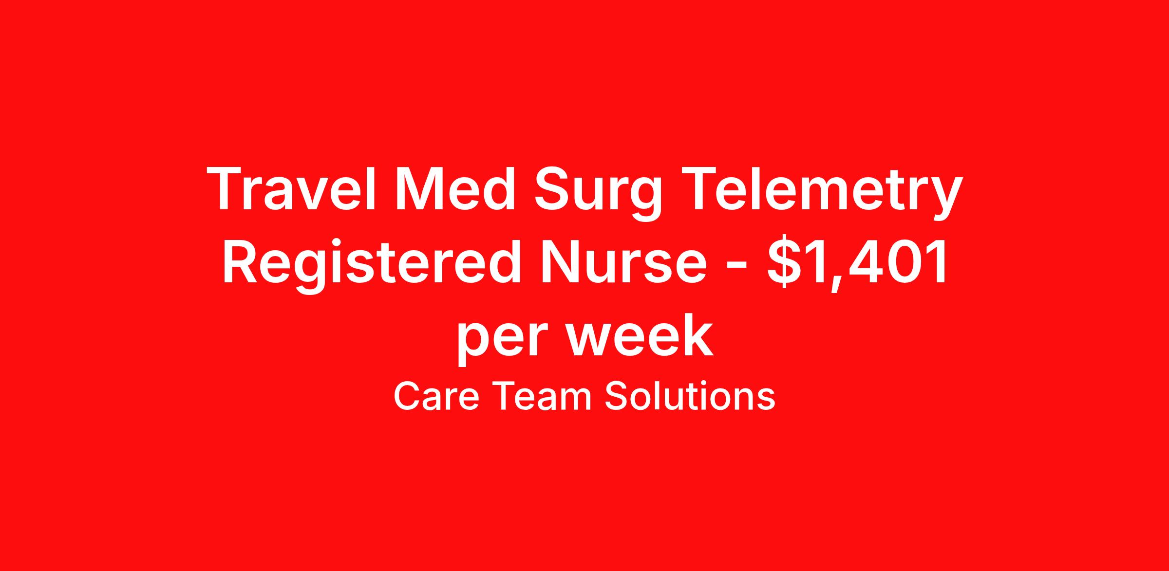 Care Team Solutions is seeking a travel nurse RN Med Surg for a travel nursing job in Decatur, Texas. Job Description & Requirements Specialty: Med Surg Discipline: RN Start Date: ASAP Duration: 13 weeks 36 hours per week Shift: 12 hours Employment Type: Travel Registered Nurse must have 2 years of recent experience in particular specialty Details: Must Have 2 Years of recent Medical-Surgical experience. Specialty: Medical-Surgical Discipline: Registered Nurse Start Date: 2026-03-16 Duration: 13 Weeks Shift: 12 Hours Overnight shift. Hours Per Week: 36 Hours Employment Type: Contract Gross Weekly Pay: $1400.98 Six things that won’t happen if you apply to this job: You won’t have to guess what the downsides are. We’ll tell you up front. You won’t show up on day 1 and find out this is not what you signed up for. We won't leave your phone call ringing when it's inconvenient. Business hours for you are business hours for us. You won’t get shuffled to some customer service rep when a problem pops up. If we screw up something in securing your placement, we'll own it. That means it's on us to make it right. You won’t figure out your credentials alone. Our credentialing experts will walk you through it step by step. We've talked to thousands of travel nurses like you. We know you want good pay. You want to choose when you work. But the one thing nurse after nurse has said they want and don't have is someone in their corner. There's a lot in this business that’s messed up. We’re trying to be the people that fix it. You and every nurse with the guts to travel deserve it. We've worked hard for you to enjoy some one-of-a-kind benefits you'll not likely find anywhere else, because they benefit you more than they benefit us: Our early pay program Student loan reimbursement Free well-being tele-visits with a psychologist Care Team Solutions Job ID 585305. Pay package is based on 12 hour shifts and 36 hours per week (subject to confirmation) with tax-free stipend amount to be determined. Posted job title: TRAVEL - RN Med Surg (610) / MC Decatur / 7P-7A About Care Team Solutions Two brothers who give an enormous damn. We're Justin and Kyle. Neither of us are nurses. It doesn’t take a nurse to see that the way travel nurses are treated sucks. Nursing is already hard enough. Travel nursing takes serious guts. You get the toughest assignments in places you’ve never been. Which can be fun, but it’s also stressful. You’re in your element but outside of your hometown. You can be a stranger on the team. If anyone deserves someone in their corner, it’s you. But that’s not how most agencies operate. Which is why travel nurses hate working with them. We got into this business because we saw bucket-loads of nurses moving through the "churn and burn" travel machinery. We absolutely hate that. You'll do your best work when you have the placements you want and feel fully supported in your work. We pay our people well because we want them to treat you well. Our recruiters are amazing (we picked each of them ourselves), but if you've got a problem too big for them, they can come straight to us. We work like ten feet away. The "Churners and Burners" promise you the same benefits. They might as well copy/paste them from each other. We have them too: 401k, holiday pay, healthcare, dental, travel reimbursement, etc But we've worked hard for you to enjoy some one-of-a-kind benefits you'll not likely find anywhere else, because they benefit you more than they benefit us: Our early pay program Student loan reimbursement Free well-being tele-visits with a psychologist Benefits Weekly pay Holiday Pay Guaranteed Hours 401k retirement plan Wellness and fitness programs Referral bonus Medical benefits Dental benefits Vision benefits School loan reimbursement
