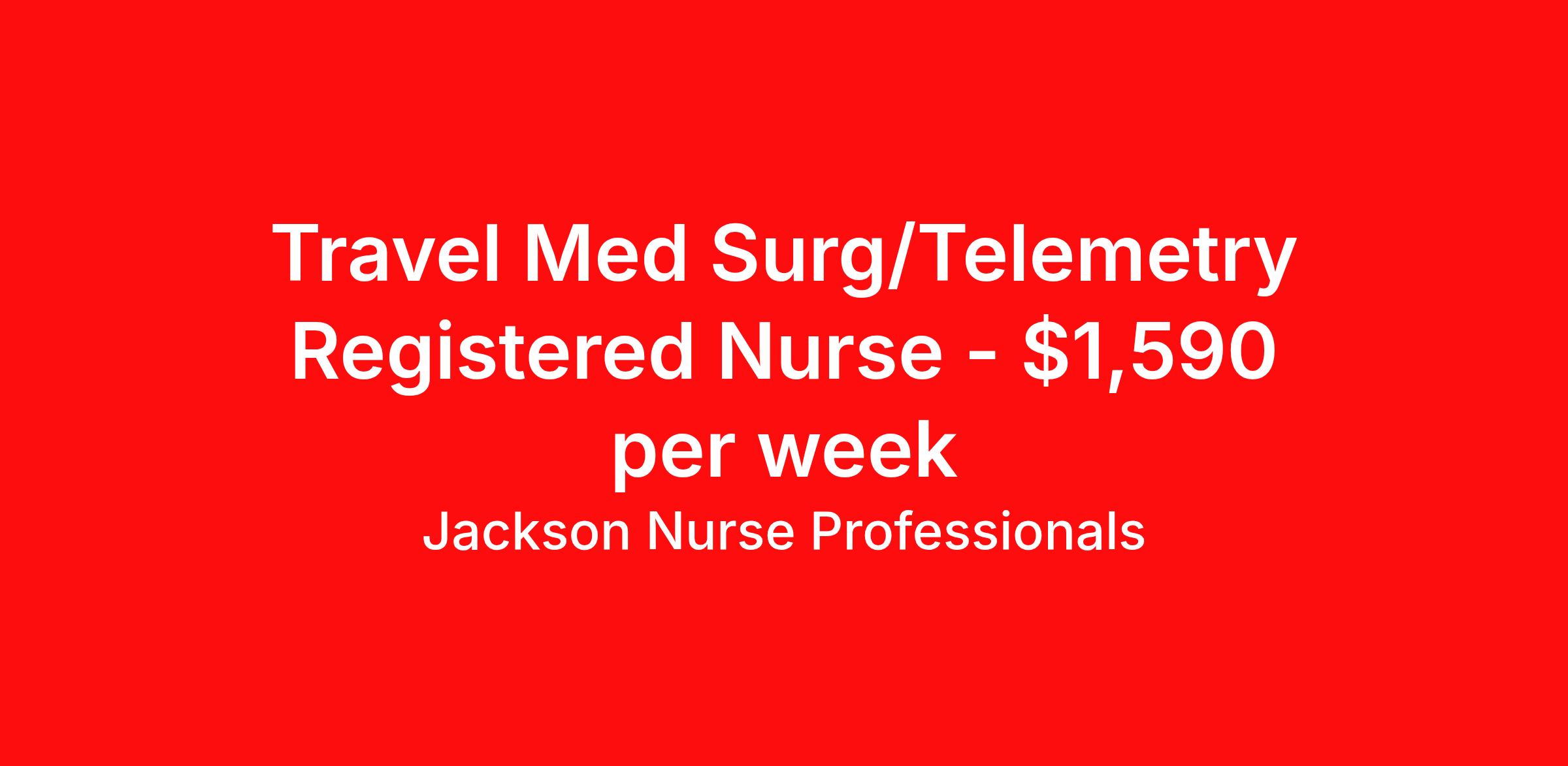 Jackson Nurse Professionals is seeking a travel nurse RN Med Surg / Telemetry for a travel nursing job in Albany, New York. Job Description & Requirements Specialty: Med Surg / Telemetry Discipline: RN Start Date: ASAP Duration: 9 weeks 36 hours per week Shift: 12 hours, days Employment Type: Travel At Jackson Nurse Professionals , we are dedicated to supporting travel nurses and helping you build a fulfilling nursing career. Whether you’re looking for your first or next travel nursing assignment, we specialize in connecting healthcare professionals with leading medical facilities. With a focus on personalized service and a wide range of opportunities, we make it easier than ever for nurses to find the right balance of adventure and professional growth. Qualifications: 2 years of recent experience in area of specialty listed on job Current BLS required (certifications vary by location – job may require ACLS) Valid license and/or certification in state of practice Valid Driver's License Background and drug screen Benefits: Full Medical, Dental and Vision Insurance 401(k) with Employer Match 24/7/365 Support from your Recruiter available by text, phone, or email Referral Bonus Program: Give $200, Get $500 for every referral Same Day Immediate Pay Access Certification & Licensure Reimbursement Apply today to experience the Jackson Nurse Professionals difference! Jackson Nurse Professionals Job ID 2458658. Pay package is based on 12 hour shifts and 36 hours per week (subject to confirmation) with tax-free stipend amount to be determined. About Jackson Nurse Professionals Filling critical needs in patient care, Jackson Nurse Professionals delivers cost-effective travel nurse staffing solutions to over 500 hospitals, outpatient clinics, and home health clients nationwide. Awarded Best of Staffing - Talent and Client 2024, and rated as a Top Workplace 2023 by the Orlando Sentinel, Jackson Nurse Professionals goes the extra mile to provide travel nurses the career they deserve, while providing clients with a large range of highly skilled nurses to fill short, long-term, and temporary assignments. As a member of Jackson Healthcare’s family of award-winning staffing companies, we’re part of a growing community that’s impacting 10 million patients nationwide. Join our mission to improve the delivery of patient care, and the lives of everyone we touch.