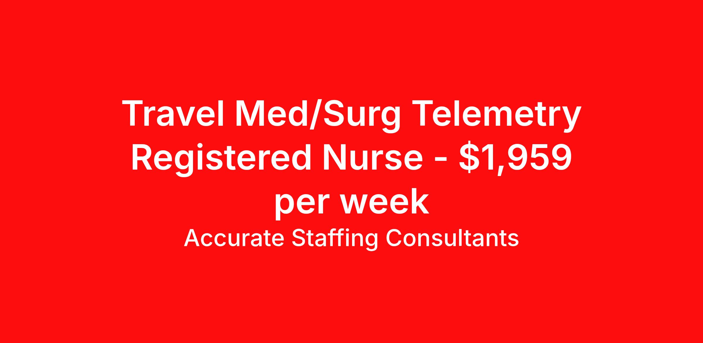 Accurate Staffing Consultants is seeking a travel nurse RN Med Surg / Telemetry for a travel nursing job in Wilmington, North Carolina. Job Description & Requirements Specialty: Med Surg / Telemetry Discipline: RN Start Date: 04/20/2026 Duration: 13 weeks 36 hours per week Shift: 12 hours, nights Employment Type: Travel AccurateStaffing Job ID 4862. Pay package is based on 12 hour shifts and 36 hours per week (subject to confirmation) with tax-free stipend amount to be determined. Posted job title: RN - Med-surg Tele
