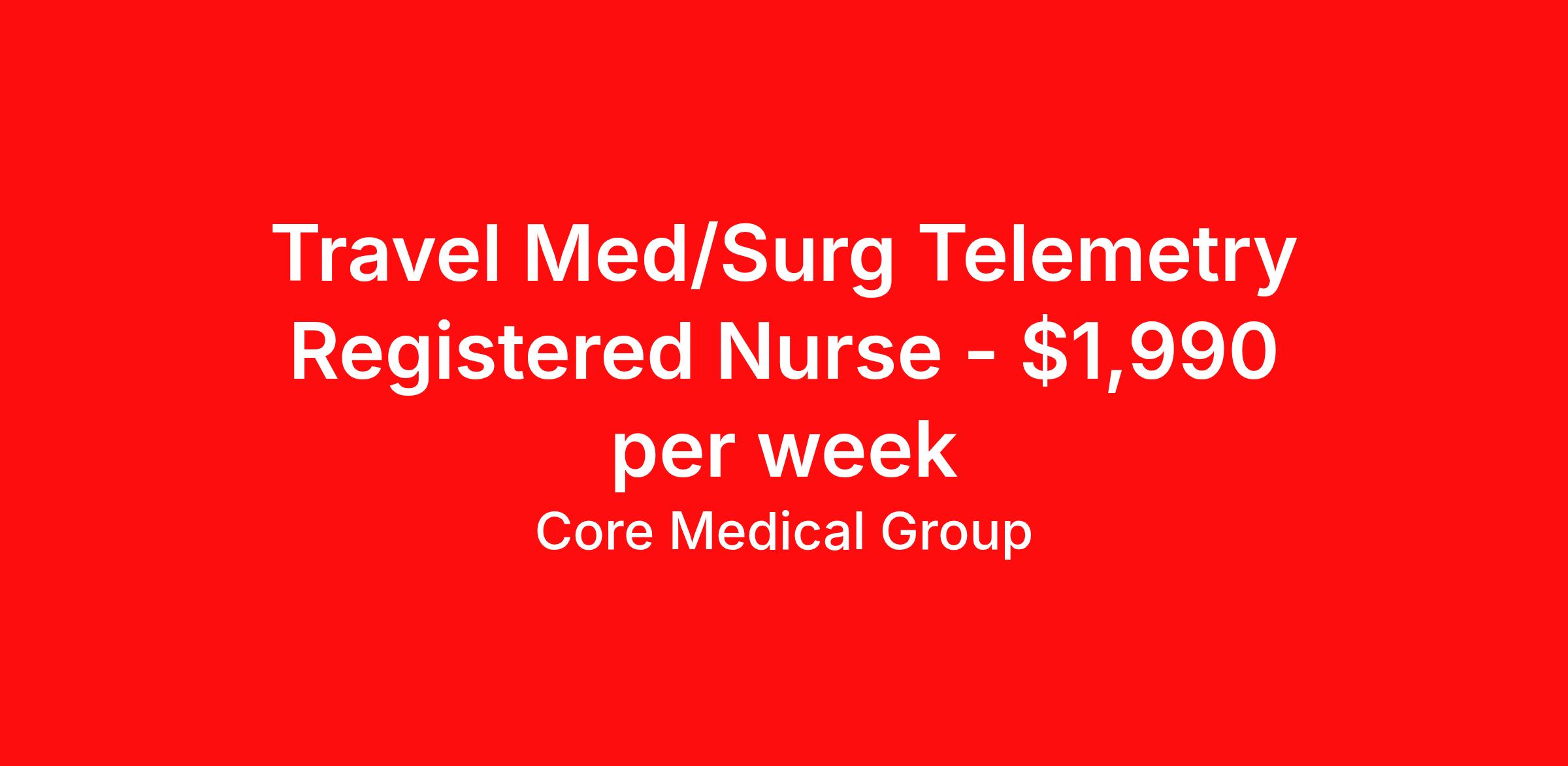 Core Medical Group is seeking a travel nurse RN Med Surg / Telemetry for a travel nursing job in Ellensburg, Washington. Job Description & Requirements Specialty: Med Surg / Telemetry Discipline: RN Start Date: ASAP Duration: 13 weeks 36 hours per week Shift: 12 hours Employment Type: Travel Client in WA seeking Registered Nurse: Med/Surg for the following shift(s): Days We are looking for a healthcare professional who is ready to provide exceptional patient care in this contract/travel role. Contract/travel assignments are typically 13 weeks, with potential to extend. Help us continue our mission to connect people, improve lives, and give back to the community by joining the CoreMedical Group team. When you work with CoreMedical Group, we put you first and treat you like family, supporting you every step of the way. CoreMedical Group is one of the largest healthcare staffing agencies in the country, with travel and contract positions located across the United States. Our recruiters will help you find the perfect job, whether it's across the country or across the street. In addition to dedicated, personalized support from your recruiter, when you work with CoreMedical Group you'll receive: Access to an extensive benefits package, including day 1 health, dental, and vision insurance, employer paid life insurance, a health reimbursement account, and more! Weekly paychecks with competitive pay packages Matching 401(k) benefits to help you save for retirement Licensure assistance and reimbursement to set you up for success on your contract Travel reimbursement and dedicated housing support while on assignment Referral cash bonuses when you connect us with other clinicians CoreMedical Group also offers you a free, all-inclusive vacation each year as our way of saying "thank you" for your hard work. Join other healthcare professionals on the annual Club CoreMed retreat and you'll see why our contract and travel professionals come back to us year after year! Your career is too valuable to tackle on your own. Let CoreMedical Group help you with your healthcare journey! *Estimate of weekly payments is intended for informational purposes and includes hourly wages, as well as reimbursements for meal & incidental expenses, and housing expenses incurred on behalf of the Company. Any benefits (medical/dental/vision) are in addition to the weekly pay. Please speak with your Recruiter for additional details. Estimated payments are subject to change until formal offer of assignment is made and accepted. Core Medical Group Job ID 1362979. Pay package is based on 12 hour shifts and 36 hours per week (subject to confirmation) with tax-free stipend amount to be determined. Posted job title: RN About Core Medical Group CoreMedical Group is one of the largest healthcare staffing agencies in the country. We have jobs nationwide in travel nursing, travel allied health, interim, locum tenens, and permanent placements! Join the staffing agency with Club CoreMed, the best perk in the industry - an all inclusive paid trip to a tropical resort! Benefits Weekly pay Holiday Pay Guaranteed Hours Continuing Education 401k retirement plan Pet insurance Company provided housing options Sick pay Wellness and fitness programs Mileage reimbursement Referral bonus Employee assistance programs Medical benefits Dental benefits Vision benefits Benefits start day 1 License and certification reimbursement Life insurance Discount program