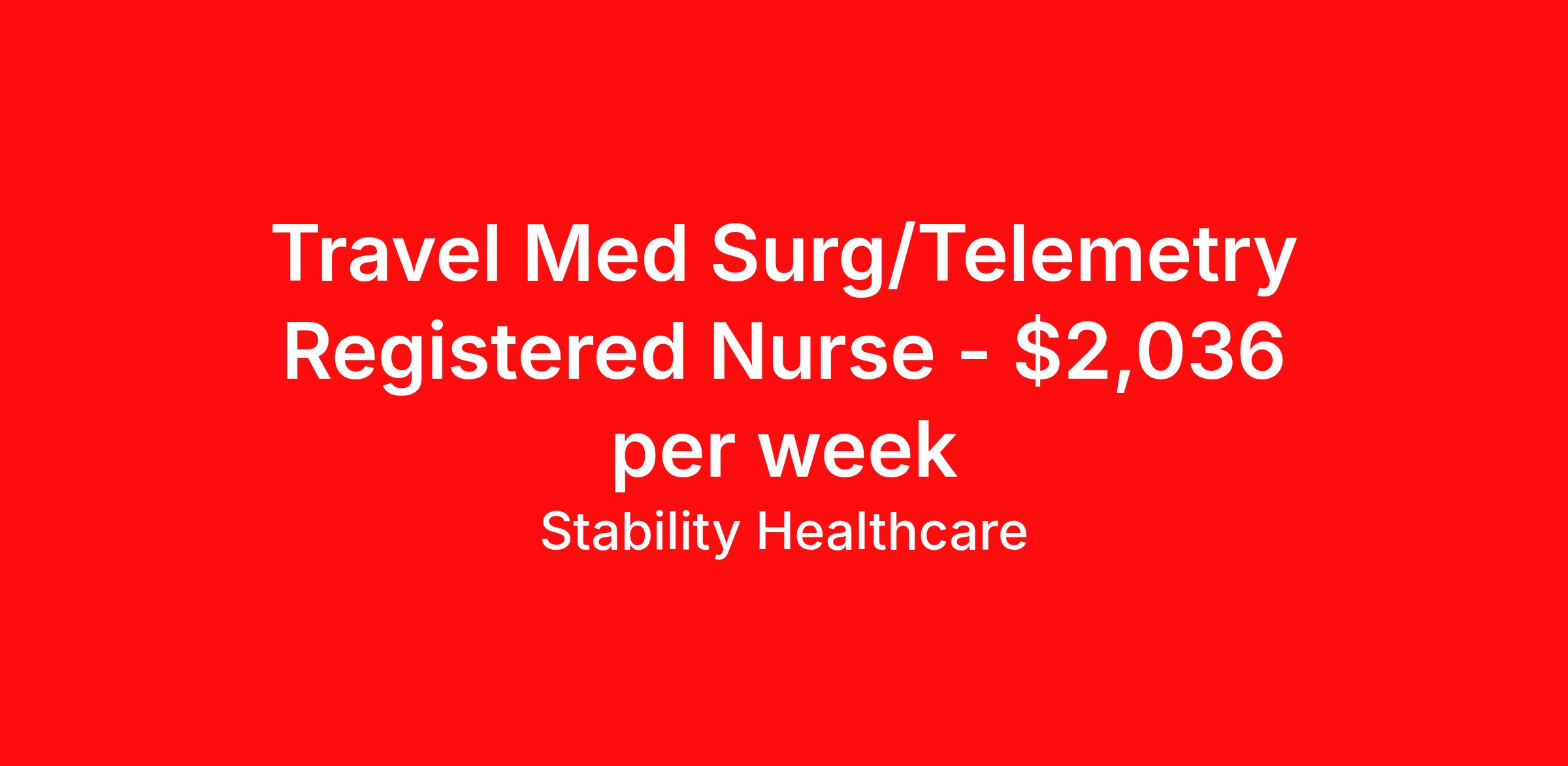 Stability Healthcare is seeking a travel nurse RN Med Surg / Telemetry for a travel nursing job in Onancock, Virginia. Job Description & Requirements Specialty: Med Surg / Telemetry Discipline: RN Start Date: 04/13/2026 Duration: 13 weeks 36 hours per week Shift: 12 hours, nights Employment Type: Travel Stability Healthcare is looking for a Tele Med-Surg RN contract position in Onancock, VA. The Medical Surgical Telemetry Registered Nurse (RN) provides direct nursing care in accordance with established policies, procedures and protocols of the healthcare organization often specializing in Neuro, Ortho or Cardiac patients. *$600 travel bonus *Day 1 health insurance with United Healthcare *PTO plan start accruing on day 1, use during contract or cash out at the end! *Guaranteed stipend if facility calls you off *Extra hour bonus earn an additional hourly bonus for working over your weekly contracted hours Stability Job ID 822701. Pay package is based on 12 hour shifts and 36 hours per week (subject to confirmation) with tax-free stipend amount to be determined. Posted job title: Tele Med-Surg About Stability Healthcare Stability Healthcare was founded in 2009, with the mission of becoming the best Travel Nursing Agency in California. We have been rated one of the top travel nursing agencies and offer our nurses the highest paying travel nursing jobs available. We have access to the best travel assignments from 1000’s of facilities. You can start the year off in sunny California, spend the Spring in the Colorado Rockies, enjoy the Summer in the Mid-West, experience the change of seasons in Boston and New York, and hit the beaches of Florida in the winter. Our Nurses work in the best hospitals and health systems in the country. Benefits Guaranteed Hours Benefits start day 1