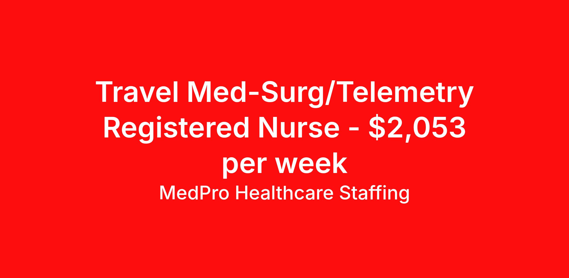 MedPro Healthcare Staffing is seeking a travel nurse RN Med Surg / Telemetry for a travel nursing job in Indianapolis, Indiana. Job Description & Requirements Specialty: Med Surg / Telemetry Discipline: RN Start Date: 04/06/2026 Duration: 13 weeks 36 hours per week Shift: 12 hours, nights Employment Type: Travel MedPro Healthcare Staffing , a Joint Commission-certified staffing agency, is seeking a quality Med-Surg registered nurse (RN) for a travel assignment with one of our top healthcare clients. Requirements Active RN License Degree from accredited nursing program BLS Certifications Eighteen months of recent experience in an Acute Care Med/Surg setting Other requirements to be determined by our client facility Benefits Weekly pay and direct deposit Full coverage of all credentialing fees Private housing or housing allowance Group Health insurance for you and your family Company-paid life and disability insurance Travel reimbursement 401(k) matching Unlimited Referral Bonuses up to $1,000 Duties Responsibilities Med-Surg Nurses (RN) provide care for primarily adult patients before and after surgical procedures; they also attend to those who are being treated with pharmaceuticals to manage illness. Due to the broad range of medical conditions Med/Surg Nurses will encounter, they must be well-versed in a large variety of health conditions. Complete assignments made by physicians. Provide routine treatment and post-surgical care. Assess changes in patient's health status and perform various treatments. Administer medication. Meticulous documentation as to medication and treatment administration to ensure continuity of care between nursing staff, physicians and other treatment team members. About Agency MedPro Healthcare Staffing is a Joint Commission certified provider of contract staffing services. Since 1983, we have placed nursing and allied travelers in top healthcare facilities nationwide. Join us today for your very own MedPro Experience®. If qualified and interested, please call for immediate consideration. MedPro Staffing is an Equal Opportunity Employer. All applicants will be considered for employment without attention to race, color, religion, national origin, age, sex, disability, marital status or veteran status. Key Words: Registered Nurse, RN, Medical-Surgical, Travel Nurse, Contract Nurse, Agency Nurse, Agency RN, RN-MS, RN- Medical Surgical, Travel RN, Contract, Nursing, RN Med-Surg, Travel Nursing *Weekly payment estimates are intended for informational purposes only and include a gross estimate of hourly wages and reimbursements for meal, incidental, and housing expenses. Your recruiter will confirm your eligibility and provide additional details. MedPro Job ID a0Fcx00000H7IsrEAF. Pay package is based on 12 hour shifts and 36 hours per week (subject to confirmation) with tax-free stipend amount to be determined. Posted job title: Med-Surg/Telemetry Registered Nurse Nursing: Med Surg/Tele. About MedPro Healthcare Staffing At MedPro Healthcare Staffing , we believe no one cares more for caregivers than we do. Our mission is simple: you focus on your patients, and we’ll take care of the rest. As a Joint Commission-certified leader in temporary and contract healthcare staffing since 1983, MedPro has proudly connected nursing and allied travelers with top healthcare facilities across the nation. With thousands of job opportunities available nationwide, we make it easy to find assignments that align with your goals and lifestyle. Our on-staff clinical support team—alongside a compassionate group of experienced recruiters—provides hands-on guidance every step of the way. From Day 1 medical benefits and a 401(k) plan to personalized career support, we’re committed to ensuring every professional we serve feels valued, cared for, and empowered to succeed. Guided by a CEO who is a Registered Nurse, MedPro is built on a foundation of clinical insight and genuine compassion for the caregiving community. Through The MedPro Experience® , we deliver travel assignments that are rewarding, memorable, and designed to help you DREAM big, EXPLORE often, and ACHIEVE greatness. Benefits Day 1 medical, dental, and vision benefits for you and your family Weekly pay and direct deposit Unlimited Referral Bonuses starting at $500 On Staff Clinical Support Team Access to nationwide travel assignments MPX Mobile app -24/7 real-time access to jobs, credentials, assignment details, and more Full coverage of all credentialing fees Private housing or housing allowance Tax Free Per Diems, Housing Stipends and Travel Reimbursements Company-paid life and disability insurance Travel reimbursement 401(k) matching Benefits Weekly pay Referral bonus Employee assistance programs
