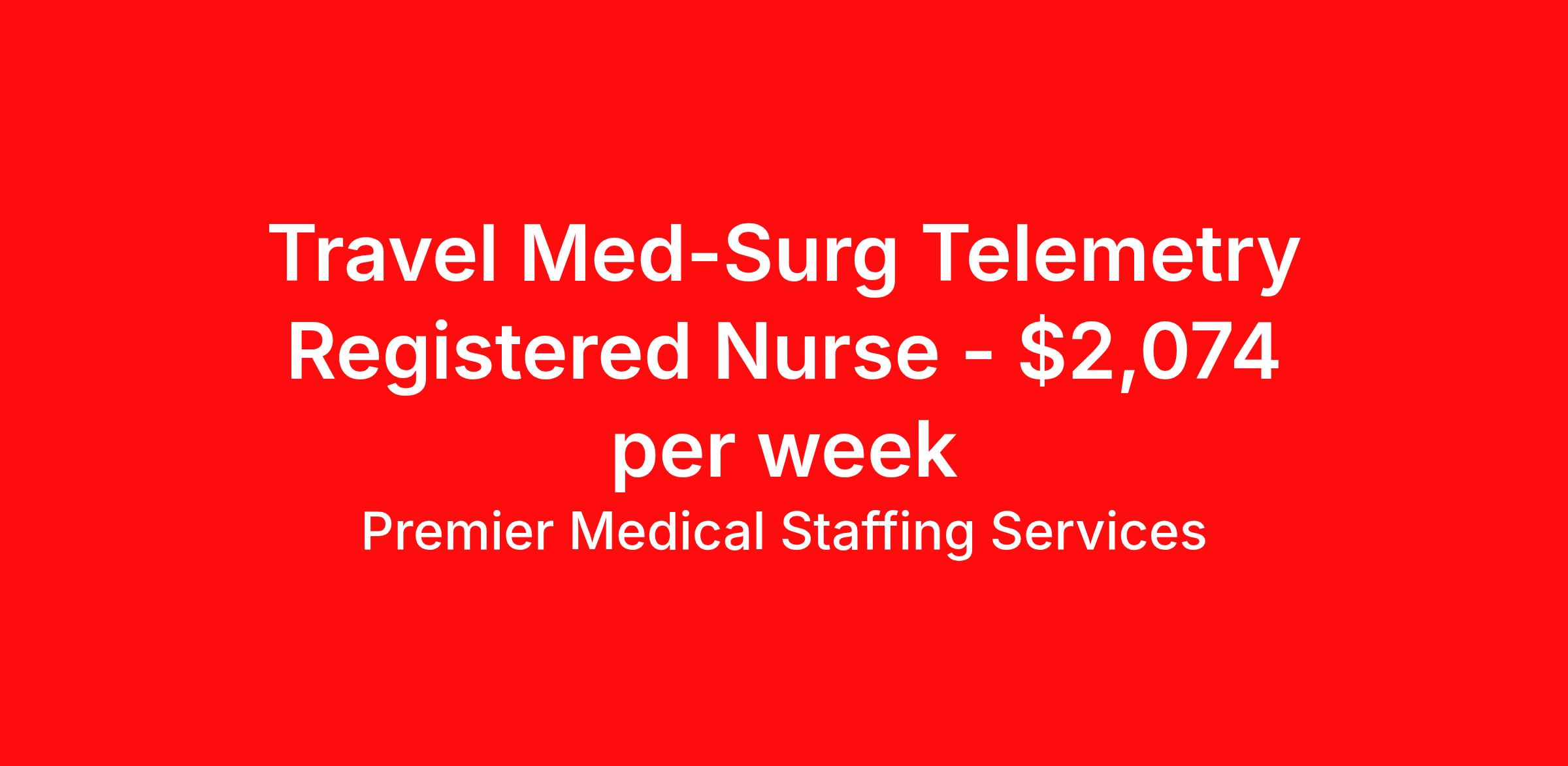 Premier Medical Staffing Services is seeking a travel nurse RN Med Surg / Telemetry for a travel nursing job in indianapolis, Indiana. Job Description & Requirements Specialty: Med Surg / Telemetry Discipline: RN Start Date: 04/06/2026 Duration: 13 weeks 36 hours per week Shift: 12 hours Employment Type: Travel Premier Medical Staffing Job ID 615644. Pay package is based on 12 hour shifts and 36 hours per week (subject to confirmation) with tax-free stipend amount to be determined. Posted job title: RN Tele Med/Surg About Premier Medical Staffing Services Premier Medical Staffing Services, LLC is a nationally expanding healthcare staffing firm for healthcare professionals and companies. We understand our clients’ need for highly qualified, expertly trained medical professionals and are passionate about helping clinicians find employment opportunities that fit their personality and needs. Able to accommodate the ever-changing needs of the healthcare landscape, we offer per-diem, contract and direct hire placements to support the unique needs of each industry sector. Premier Medical Staffing Services is Joint Commission Certified, a Military Spouse Employment Partner and is certified as a Women’s Business Enterprise. We are proudly nurse owned.