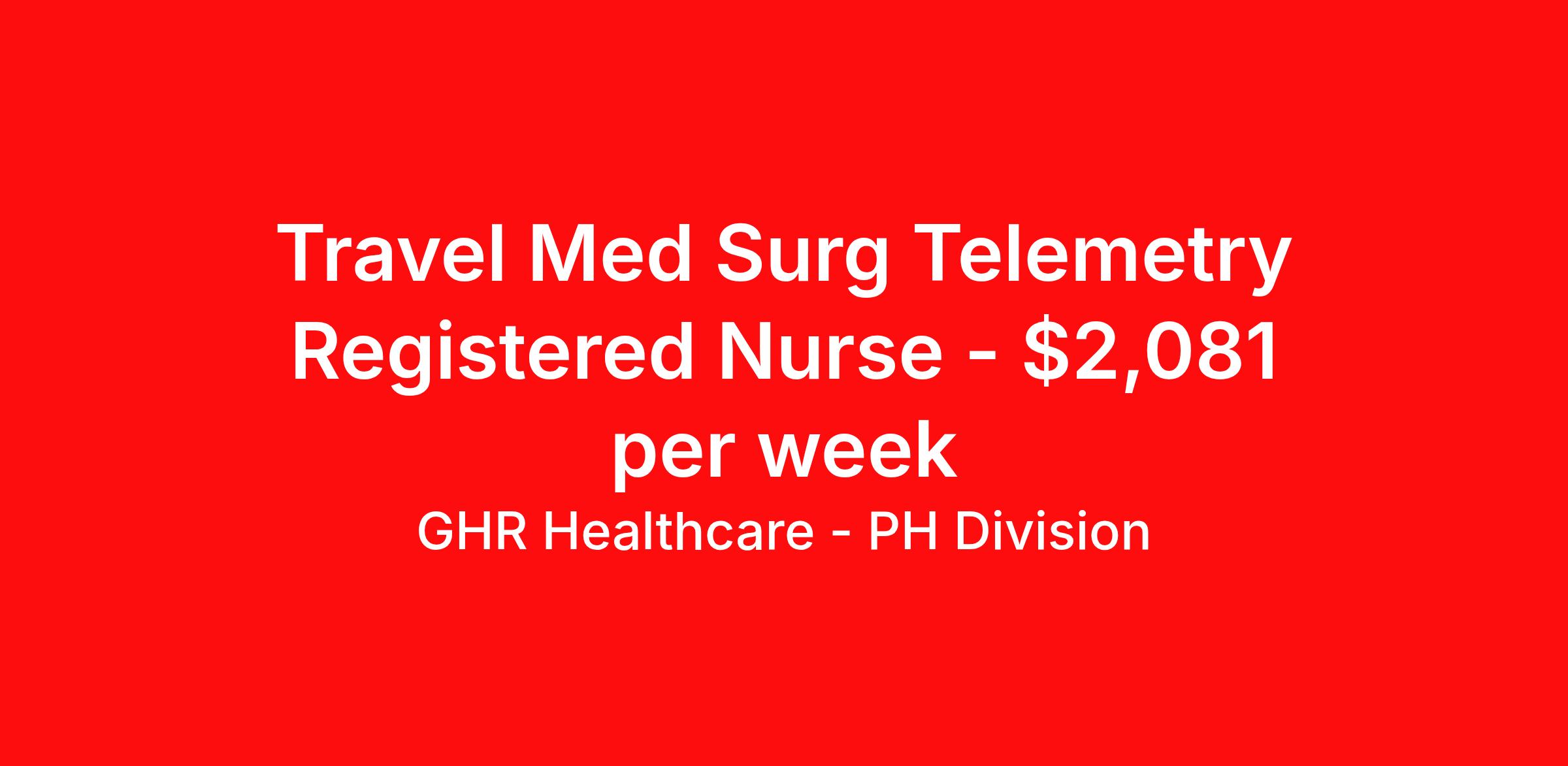 GHR Healthcare - PH Division is seeking a travel nurse RN Telemetry Med Surg for a travel nursing job in Salem, Massachusetts. Job Description & Requirements Specialty: Telemetry Discipline: RN Start Date: 04/19/2026 Duration: 12 weeks 36 hours per week Shift: 12 hours Employment Type: Travel Planet Healthcare Job ID 76316527. Pay package is based on 12 hour shifts and 36 hours per week (subject to confirmation) with tax-free stipend amount to be determined. About GHR Healthcare - PH Division For over 30 years, GHR Healthcare has been the bridge between healthcare professionals and the facilities that need them nationwide. We're committed to uncovering your ideal fit, supported by GHR's dedication to competitive compensation, transparent communication, and a devoted team that genuinely cares about your career journey. You can trust us to stand by your side as your advocate, confidante, and partner in advancing your career. At GHR, care and consideration are at the heart of everything we do. Visit ghrhealthcare.com to learn more.
