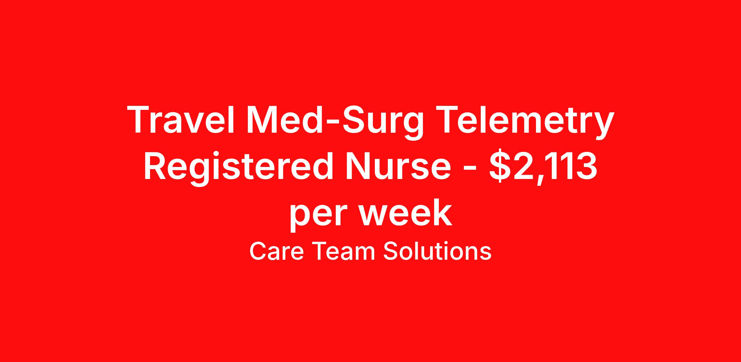 Care Team Solutions is seeking a travel nurse RN Med Surg / Telemetry for a travel nursing job in Indianapolis, Indiana. Job Description & Requirements Specialty: Med Surg / Telemetry Discipline: RN Start Date: ASAP Duration: 13 weeks 36 hours per week Shift: 12 hours Employment Type: Travel Registered Nurse must have 2 years of recent experience in particular specialty Details: Must Have 2 Years of recent Medical/Surgical/Telemetry experience. Specialty: Medical/Surgical/Telemetry Discipline: Registered Nurse Start Date: 2026-02-23 Duration: 13 Weeks Shift: 12 Hours Overnight shift. Hours Per Week: 36 Hours Employment Type: Contract Gross Weekly Pay: $2113.15 Six things that won’t happen if you apply to this job: You won’t have to guess what the downsides are. We’ll tell you up front. You won’t show up on day 1 and find out this is not what you signed up for. We won't leave your phone call ringing when it's inconvenient. Business hours for you are business hours for us. You won’t get shuffled to some customer service rep when a problem pops up. If we screw up something in securing your placement, we'll own it. That means it's on us to make it right. You won’t figure out your credentials alone. Our credentialing experts will walk you through it step by step. We've talked to thousands of travel nurses like you. We know you want good pay. You want to choose when you work. But the one thing nurse after nurse has said they want and don't have is someone in their corner. There's a lot in this business that’s messed up. We’re trying to be the people that fix it. You and every nurse with the guts to travel deserve it. We've worked hard for you to enjoy some one-of-a-kind benefits you'll not likely find anywhere else, because they benefit you more than they benefit us: Our early pay program Student loan reimbursement Free well-being tele-visits with a psychologist Care Team Solutions Job ID 579984. Pay package is based on 12 hour shifts and 36 hours per week (subject to confirmation) with tax-free stipend amount to be determined. Posted job title: MS/Tele Registered Nurse About Care Team Solutions Two brothers who give an enormous damn. We're Justin and Kyle. Neither of us are nurses. It doesn’t take a nurse to see that the way travel nurses are treated sucks. Nursing is already hard enough. Travel nursing takes serious guts. You get the toughest assignments in places you’ve never been. Which can be fun, but it’s also stressful. You’re in your element but outside of your hometown. You can be a stranger on the team. If anyone deserves someone in their corner, it’s you. But that’s not how most agencies operate. Which is why travel nurses hate working with them. We got into this business because we saw bucket-loads of nurses moving through the "churn and burn" travel machinery. We absolutely hate that. You'll do your best work when you have the placements you want and feel fully supported in your work. We pay our people well because we want them to treat you well. Our recruiters are amazing (we picked each of them ourselves), but if you've got a problem too big for them, they can come straight to us. We work like ten feet away. The "Churners and Burners" promise you the same benefits. They might as well copy/paste them from each other. We have them too: 401k, holiday pay, healthcare, dental, travel reimbursement, etc But we've worked hard for you to enjoy some one-of-a-kind benefits you'll not likely find anywhere else, because they benefit you more than they benefit us: Our early pay program Student loan reimbursement Free well-being tele-visits with a psychologist Benefits Weekly pay Holiday Pay Guaranteed Hours 401k retirement plan Wellness and fitness programs Referral bonus Medical benefits Dental benefits Vision benefits School loan reimbursement