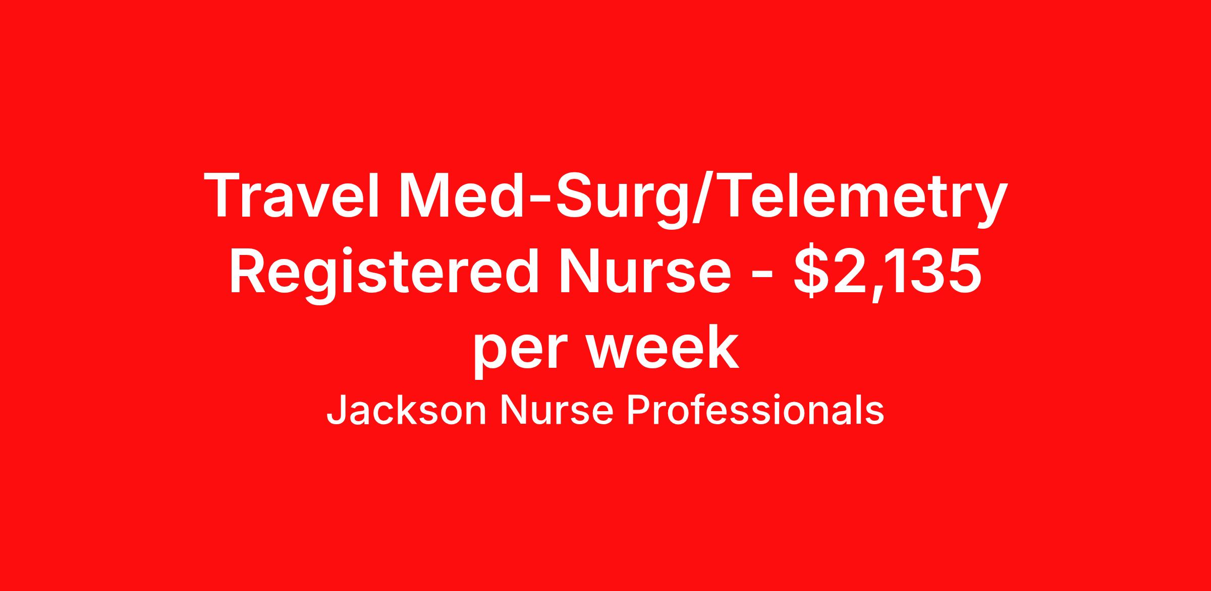 Jackson Nurse Professionals is seeking a travel nurse RN Med Surg / Telemetry for a travel nursing job in Rochester, New York. Job Description & Requirements Specialty: Med Surg / Telemetry Discipline: RN Start Date: 04/06/2026 Duration: 13 weeks 36 hours per week Shift: 12 hours, nights Employment Type: Travel At Jackson Nurse Professionals , we are dedicated to supporting travel nurses and helping you build a fulfilling nursing career. Whether you’re looking for your first or next travel nursing assignment, we specialize in connecting healthcare professionals with leading medical facilities. With a focus on personalized service and a wide range of opportunities, we make it easier than ever for nurses to find the right balance of adventure and professional growth. Qualifications: 2 years of recent experience in area of specialty listed on job Current BLS required (certifications vary by location – job may require ACLS) Valid license and/or certification in state of practice Valid Driver's License Background and drug screen Benefits: Full Medical, Dental and Vision Insurance 401(k) with Employer Match 24/7/365 Support from your Recruiter available by text, phone, or email Referral Bonus Program: Give $200, Get $500 for every referral Same Day Immediate Pay Access Certification & Licensure Reimbursement Apply today to experience the Jackson Nurse Professionals difference! Jackson Nurse Professionals Job ID 2476393. Pay package is based on 12 hour shifts and 36 hours per week (subject to confirmation) with tax-free stipend amount to be determined. About Jackson Nurse Professionals Filling critical needs in patient care, Jackson Nurse Professionals delivers cost-effective travel nurse staffing solutions to over 500 hospitals, outpatient clinics, and home health clients nationwide. Awarded Best of Staffing - Talent and Client 2024, and rated as a Top Workplace 2023 by the Orlando Sentinel, Jackson Nurse Professionals goes the extra mile to provide travel nurses the career they deserve, while providing clients with a large range of highly skilled nurses to fill short, long-term, and temporary assignments. As a member of Jackson Healthcare’s family of award-winning staffing companies, we’re part of a growing community that’s impacting 10 million patients nationwide. Join our mission to improve the delivery of patient care, and the lives of everyone we touch.