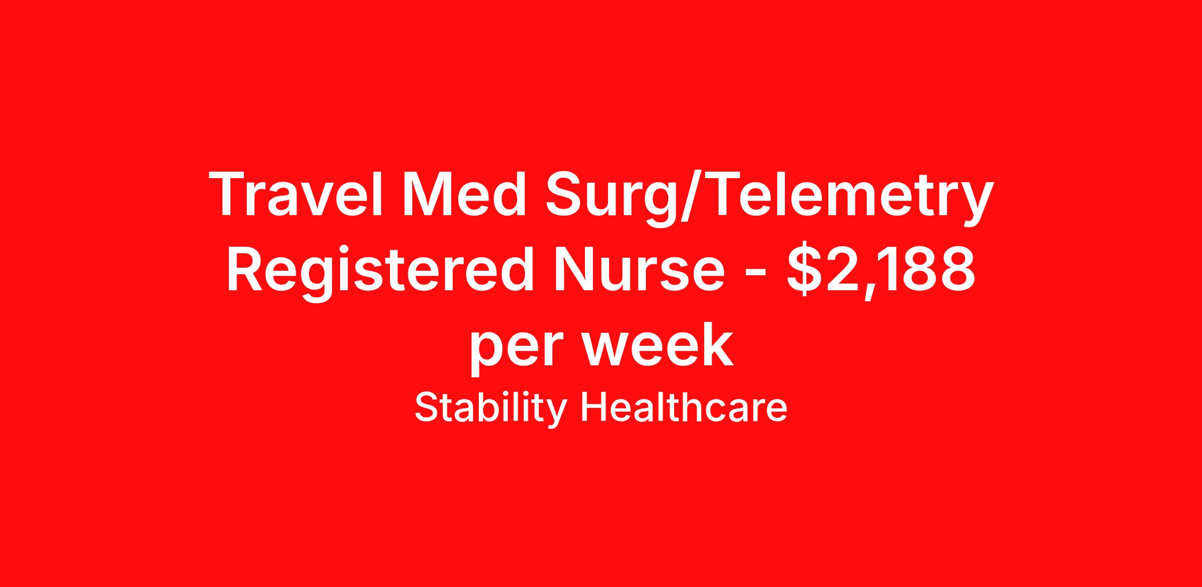 Stability Healthcare is seeking a travel nurse RN Med Surg / Telemetry for a travel nursing job in Rock Island, Illinois. Job Description & Requirements Specialty: Med Surg / Telemetry Discipline: RN Duration: 13 weeks 36 hours per week Shift: 12 hours, days Employment Type: Travel Stability Healthcare is looking for a Tele Med-Surg RN contract position in Rock Island, IL. The Medical Surgical Telemetry Registered Nurse (RN) provides direct nursing care in accordance with established policies, procedures and protocols of the healthcare organization often specializing in Neuro, Ortho or Cardiac patients. *$600 travel bonus *Day 1 health insurance with United Healthcare *PTO plan start accruing on day 1, use during contract or cash out at the end! *Guaranteed stipend if facility calls you off *Extra hour bonus earn an additional hourly bonus for working over your weekly contracted hours Stability Job ID 827541. Pay package is based on 12 hour shifts and 36 hours per week (subject to confirmation) with tax-free stipend amount to be determined. Posted job title: Tele Med-Surg About Stability Healthcare Stability Healthcare was founded in 2009, with the mission of becoming the best Travel Nursing Agency in California. We have been rated one of the top travel nursing agencies and offer our nurses the highest paying travel nursing jobs available. We have access to the best travel assignments from 1000’s of facilities. You can start the year off in sunny California, spend the Spring in the Colorado Rockies, enjoy the Summer in the Mid-West, experience the change of seasons in Boston and New York, and hit the beaches of Florida in the winter. Our Nurses work in the best hospitals and health systems in the country. Benefits Guaranteed Hours Benefits start day 1