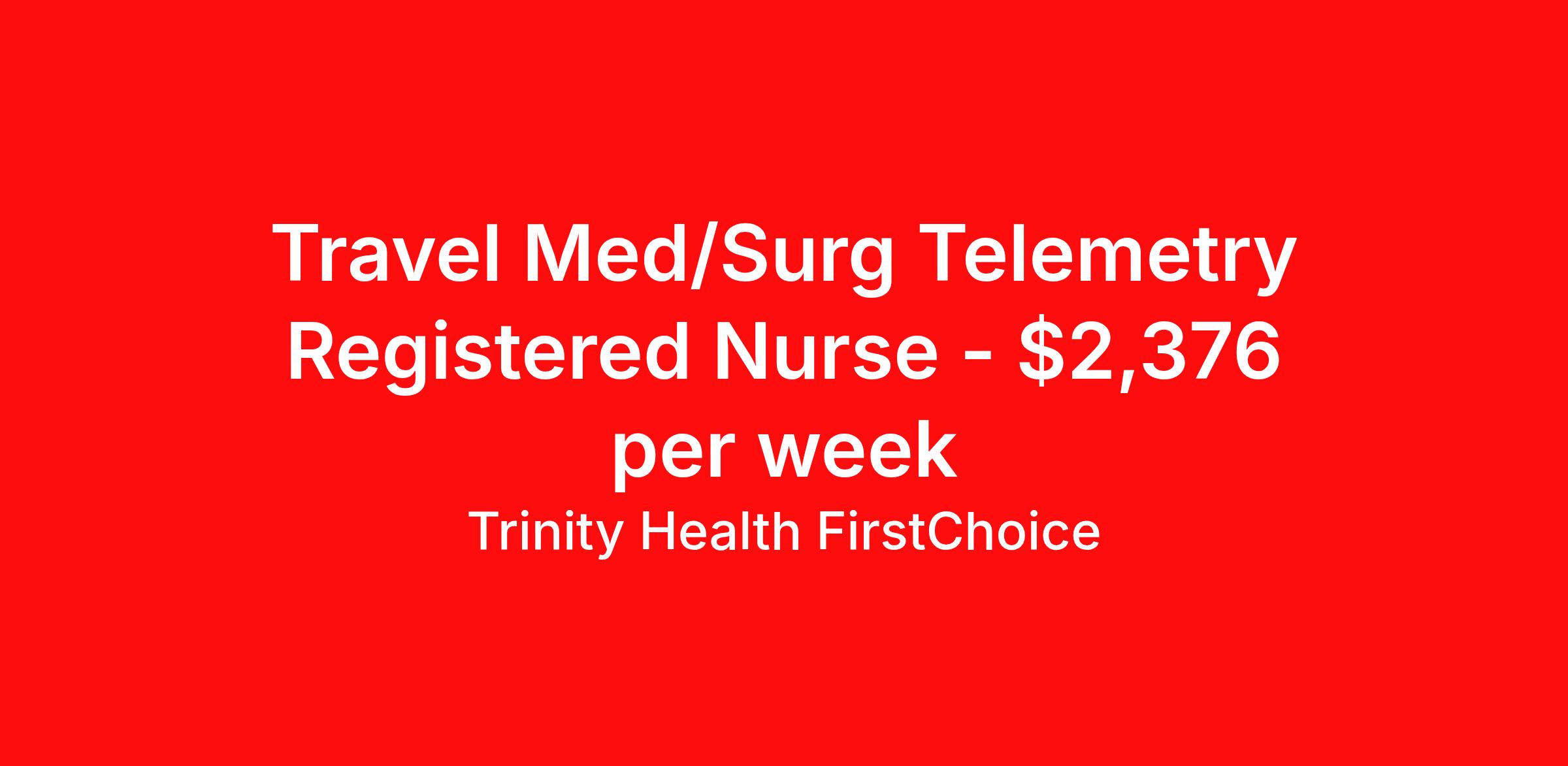 Trinity Health FirstChoice is seeking a travel nurse RN Med Surg / Telemetry for a travel nursing job in Brighton, Michigan. Job Description & Requirements Specialty: Med Surg / Telemetry Discipline: RN Start Date: ASAP Duration: 13 weeks 36 hours per week Shift: 12 hours, nights Employment Type: Travel Employment Type: Part time Shift: Description: Job Details Location: Trinity Health Livingston Start Date: ASAP Weeks: 13 weeks Hours: 3x12 Shift: Night (7:00p-7:30a) Gross Weekly Rate: $2376 Posting Travel Registered Nurse, RN, Med Surg/Tele Position Purpose: Are you an experienced Registered Nurse looking for premium compensation and maximum flexibility? Explore FirstChoice – Trinity Health's mobile staffing solution! FirstChoice RNs are utilized to fill short and long-term assignments throughout the health system, and we need you to be a part of this innovative program! Nationwide and Regional opportunities available! What you will do: Qualified and willing to float throughout the hospital and/or throughout multiple hospital locations and/or regions Knows, understands, incorporates & demonstrates standard elements of professional practice: Assess, Outcomes Identification / Solutions, Plan, Implement, Evaluate Acts independently & appropriately within license, scope of knowledge & experience in practice area Retains accountability for delegation, choices, decisions & outcomes Collaborates with key stakeholders & contributes to quality & improvement practices & outcomes Exhibits agility & willingness to take on new & additional responsibilities Embraces new ideas & cultural differences while managing competing priorities Minimum Qualifications: Graduation from an accredited school of nursing. Valid RN licensure authorized in the applicable state(s) of practice/employment. Minimum of eighteen (18) months of recent clinical experience for Med Surg, Tele and PCU. Minimum two (2) years of recent clinical experience for all remaining specialties including Critical Care, Surgical Services, Maternal Services, Emergency Department and Behavioral Health. Required to have and maintain the credentials required per their specialty area (ex: ACLS, TNCC, etc). BLS, ACLS and PALS must be obtained through American Heart Association Position Highlights and Benefits: Premium Pay Flexible Scheduling Travel and Per Diem opportunities available Variety of Practice Settings Learning Opportunities DailyPay available Reimbursement of License and Certifications available per assignment Opportunity to participate in 403B program Ministry Information: FirstChoice offers rewarding Nursing, Respiratory Therapist, Surgical Technologist, and Health Care Professional travel positions with a flexible schedule to fit your life. FirstChoice travel Health Care Professionals fill critical positions when unforeseen or unplanned circumstances occur; or, when there is a position open due to an extended leave-of-absence. You’ll get to experience a variety of practice settings while traveling within your local region or traveling nationally – your choice! Our Commitment Rooted in our Mission and Core Values, we honor the dignity of every person and recognize the unique perspectives, experiences, and talents each colleague brings. By finding common ground and embracing our differences, we grow stronger together and deliver more compassionate, person-centered care. We are an Equal Opportunity Employer. All qualified applicants will receive consideration for employment without regard to race, color, religion, sex, sexual orientation, gender identity, national origin, disability, veteran status, or any other status protected by federal, state, or local law. Trinity Health FirstChoice Job ID 00651737. Pay package is based on 12 hour shifts and 36 hours per week (subject to confirmation) with tax-free stipend amount to be determined. Posted job title: Travel Registered Nurse, RN, Med/Surg Tele About Trinity Health FirstChoice Premium pay FirstChoice offers a rewarding career with significant p remium pay and flexible scheduling to fit your life. FirstChoice h ealthcare travel professionals fill critical positions when unforeseen or unplanned circumstances occur; or, when there is a position open due to an extended leave-of-absence. You’ll get to experience a variety of practice settings while traveling within your local region or traveling nationally – your choice! Healthcare travel professionals, join us in caring for our community, we can't do it without you. FirstChoice exclusively supports facilities within the Trinity Health system meaning you will have a consistent experience between job sites. Your training at one site will apply to other sites within the region and will minimize the time you are spending outside of patient care. We understand that there has been a fundamental shift in the nursing position in recent years and like any other employee, nurses want more options and flexibility in their careers. FirstChoice provides you with both along with the comfort and security of one employer. Benefits of Being a FirstChoice healthcare travel professional: Premium pay Choose your own travel adventure—work in a variety of practice settings Wide range of assignments available Housing and meal stipend Minimum Qualifications/Requirements of a FirstChoice Nurse: Registered nurse with a license in the state(s) you will work Minimum of 2 years, depending on specialty area Cannot hold a concurrent position at a Trinity Health facility Trinity Health is a leading not-for-profit Catholic health system with 92 hospitals and hundreds of primary, specialty and continuing care centers across the United States. Benefits Employee assistance programs 403b retirement plan Discount program