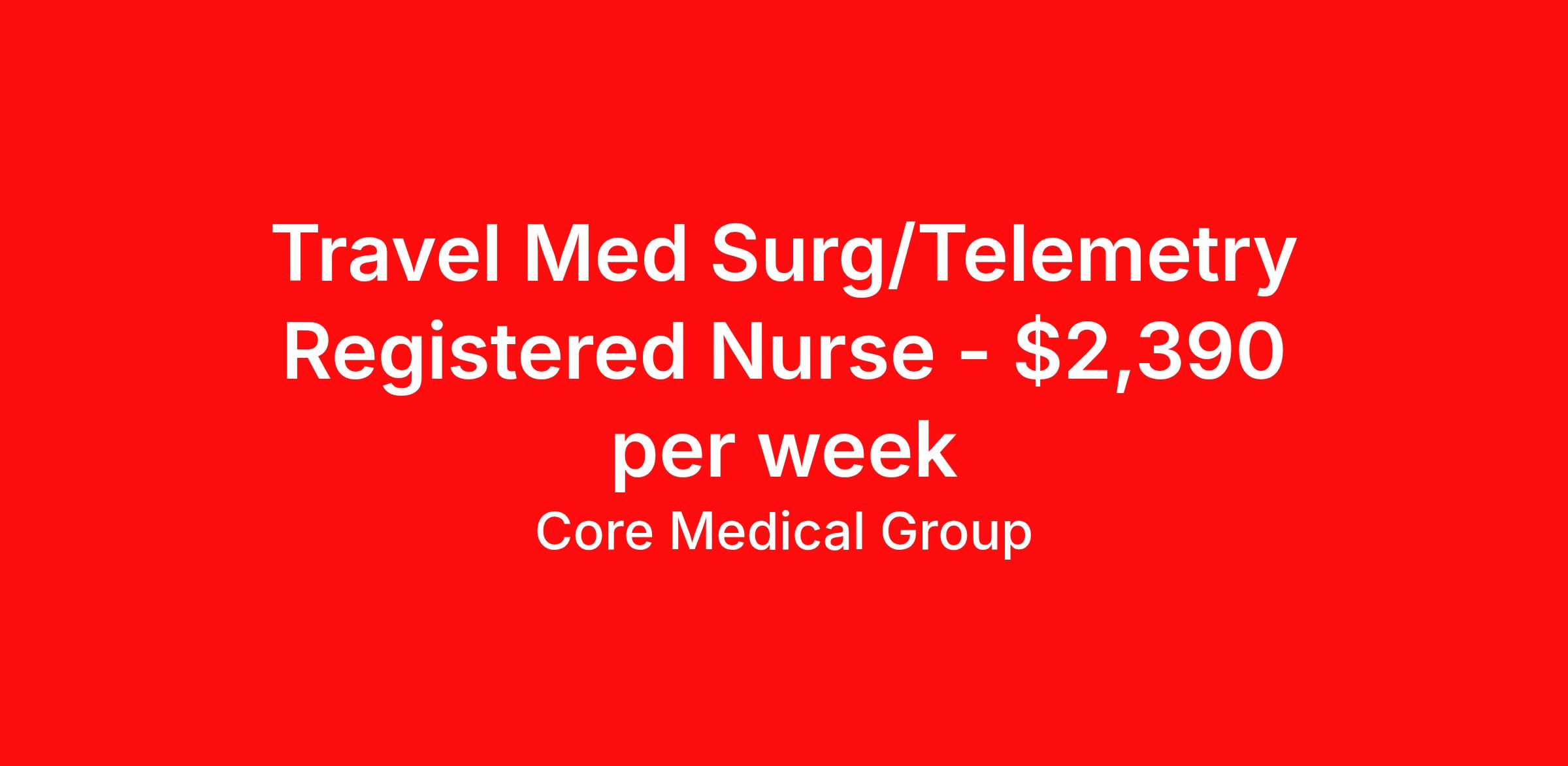 Core Medical Group is seeking a travel nurse RN Med Surg / Telemetry for a travel nursing job in Rock Island, Illinois. Job Description & Requirements Specialty: Med Surg / Telemetry Discipline: RN Start Date: 04/06/2026 Duration: 13 weeks 36 hours per week Shift: 12 hours Employment Type: Travel Client in IL seeking Registered Nurse: Med/Surg-Telemetry for the following shift(s): Days We are looking for a healthcare professional who is ready to provide exceptional patient care in this contract/travel role. Contract/travel assignments are typically 13 weeks, with potential to extend. Help us continue our mission to connect people, improve lives, and give back to the community by joining the CoreMedical Group team. When you work with CoreMedical Group, we put you first and treat you like family, supporting you every step of the way. CoreMedical Group is one of the largest healthcare staffing agencies in the country, with travel and contract positions located across the United States. Our recruiters will help you find the perfect job, whether it's across the country or across the street. In addition to dedicated, personalized support from your recruiter, when you work with CoreMedical Group you'll receive: Access to an extensive benefits package, including day 1 health, dental, and vision insurance, employer paid life insurance, a health reimbursement account, and more! Weekly paychecks with competitive pay packages Matching 401(k) benefits to help you save for retirement Licensure assistance and reimbursement to set you up for success on your contract Travel reimbursement and dedicated housing support while on assignment Referral cash bonuses when you connect us with other clinicians CoreMedical Group also offers you a free, all-inclusive vacation each year as our way of saying "thank you" for your hard work. Join other healthcare professionals on the annual Club CoreMed retreat and you'll see why our contract and travel professionals come back to us year after year! Your career is too valuable to tackle on your own. Let CoreMedical Group help you with your healthcare journey! *Estimate of weekly payments is intended for informational purposes and includes hourly wages, as well as reimbursements for meal & incidental expenses, and housing expenses incurred on behalf of the Company. Any benefits (medical/dental/vision) are in addition to the weekly pay. Please speak with your Recruiter for additional details. Estimated payments are subject to change until formal offer of assignment is made and accepted. Core Medical Group Job ID 1366121. Pay package is based on 12 hour shifts and 36 hours per week (subject to confirmation) with tax-free stipend amount to be determined. Posted job title: RN About Core Medical Group CoreMedical Group is one of the largest healthcare staffing agencies in the country. We have jobs nationwide in travel nursing, travel allied health, interim, locum tenens, and permanent placements! Join the staffing agency with Club CoreMed, the best perk in the industry - an all inclusive paid trip to a tropical resort! Benefits Weekly pay Holiday Pay Guaranteed Hours Continuing Education 401k retirement plan Pet insurance Company provided housing options Sick pay Wellness and fitness programs Mileage reimbursement Referral bonus Employee assistance programs Medical benefits Dental benefits Vision benefits Benefits start day 1 License and certification reimbursement Life insurance Discount program