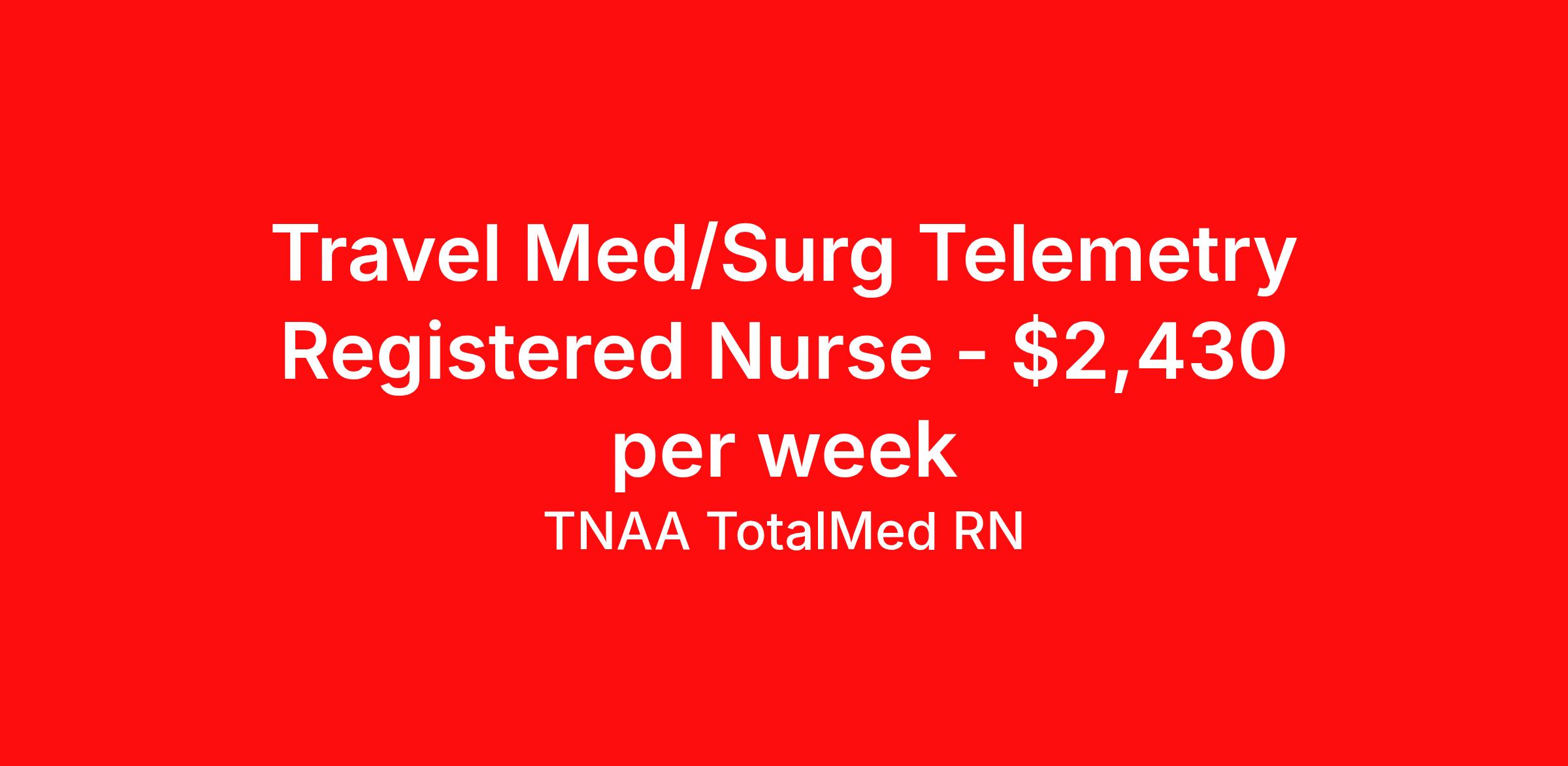 TNAA TotalMed RN is seeking a travel nurse RN Telemetry for a travel nursing job in Cleveland, Ohio. Job Description & Requirements Specialty: Telemetry Discipline: RN Duration: 13 weeks 36 hours per week Shift: 12 hours, rotating Employment Type: Travel We're looking for Telemetry RNs for an immediate travel nurse opening in Cleveland, OH. The right RN should have 1-2 years' recent acute care experience. Read below for more requirements. As a TELE Travel Nurse, you will provide care by connecting patients to machines that measure heart rate, blood pressure, breathing rate, as well as blood-oxygen levels and electrocardiogram information. These machines then send data to computer screens for RNs to monitor. Telemetry RNs read and interpret the data to better determine patient care. As a TELE Travel Nurse, you should be prepared to perform the following tasks: Provide basic bedside care. Monitor and adjust specialized equipment used on patients, and interpret and record electronic displays. Identify irregular telemetry readings and notify appropriate medical team members. Initiate corrective action whenever information from monitoring equipment shows adverse symptomatology. TELE Travel Nurses should be able to stand and walk for long periods of time, as well as bend, lean and stoop without difficulty. RNs should be able to easily lift 20 pounds. Moving or lifting of patients may require lifting of up to 50 pounds at times. RNs must have specific vision abilities including close vision, distance vision, color vision, peripheral vision, depth perception and ability to adjust focus. Requirements*: ACLS, BLS, NIH, 1.5 Years * Additional certifications may be required before beginning an assignment. TotalMed Travel Job ID 1391075. Pay package is based on 12 hour shifts and 36 hours per week (subject to confirmation) with tax-free stipend amount to be determined. Posted job title: Telemetry - TELE RN - Travel Nurse About TNAA TotalMed RN TotalMed is a Top Ten, travel nursing and healthcare staffing agency with the mission of igniting purpose in healthcare. The organization staffs nurses, therapists, pharmacists, and other clinicians of all specialties in all 50 states. They offer local and travel jobs and match caregivers with the right organization to assist both facilities and patients. As an organization, they focus on putting highly-skilled staff into facilities to ensure adequate staffing for a better patient experience. TotalMed specializes in recruiting and placing healthcare professionals in travel, PRN, and permanent positions across the country in Nursing and Allied Health. Throughout 2020, the organization filled roles at even the most short-staffed facilities during the most challenging time in healthcare. By matching the right travel healthcare professional with the right organization, TotalMed continues to offer a lifeline to facilities and their patients. Benefits Weekly pay Guaranteed Hours Continuing Education 401k retirement plan Sick pay Wellness and fitness programs Referral bonus Employee assistance programs Medical benefits Dental benefits Vision benefits Benefits start day 1
