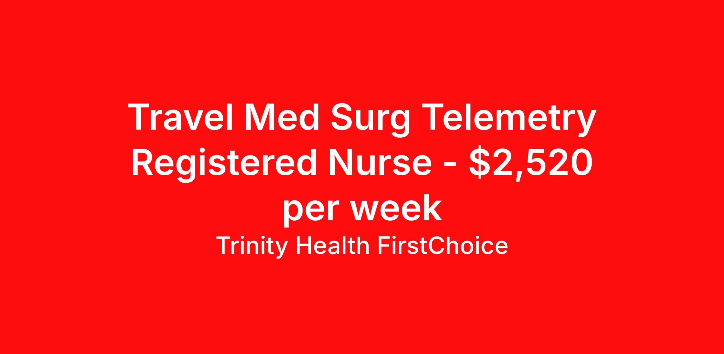 Trinity Health FirstChoice is seeking a travel nurse RN Med Surg / Telemetry for a travel nursing job in Mason City, Iowa. Job Description & Requirements Specialty: Med Surg / Telemetry Discipline: RN Start Date: ASAP Duration: 13 weeks 36 hours per week Shift: 12 hours, nights Employment Type: Travel Employment Type: Part time Shift: 12 Hour Night Shift Description: Are you an experienced Registered Nurse looking for premium compensation and maximum flexibility? Explore FirstChoice – Trinity Health's mobile staffing solution! FirstChoice RNs are utilized to fill short and long-term assignments throughout the health system, and we need you to be a part of this innovative program! Nationwide and Regional opportunities available! What you will do: Qualified and willing to float throughout the hospital and/or throughout multiple hospital locations and/or regions Knows, understands, incorporates & demonstrates standard elements of professional practice: Assess, Outcomes Identification / Solutions, Plan, Implement, Evaluate Acts independently & appropriately within license, scope of knowledge & experience in practice area Retains accountability for delegation, choices, decisions & outcomes Collaborates with key stakeholders & contributes to quality & improvement practices & outcomes Exhibits agility & willingness to take on new & additional responsibilities Embraces new ideas & cultural differences while managing competing priorities Minimum Qualifications: Graduation from an accredited school of nursing. Valid RN licensure authorized in the applicable state(s) of practice/employment. Minimum of eighteen (18) months of recent clinical experience for Med Surg, Tele and PCU. Minimum two (2) years of recent clinical experience for all remaining specialties including Critical Care, Surgical Services, Maternal Services, Emergency Department and Behavioral Health. Required to have and maintain the credentials required per their specialty area (ex: ACLS, TNCC, etc). BLS, ACLS and PALS must be obtained through American Heart Association Position Highlights and Benefits: Premium Pay Flexible Scheduling Travel and Per Diem opportunities available Variety of Practice Settings Learning Opportunities DailyPay available Reimbursement of License and Certifications available per assignment Opportunity to participate in 403B program Ministry Information: FirstChoice offers rewarding Nursing, Respiratory Therapist, Surgical Technologist, and Health Care Professional travel positions with a flexible schedule to fit your life. FirstChoice travel Health Care Professionals fill critical positions when unforeseen or unplanned circumstances occur; or, when there is a position open due to an extended leave-of-absence. You’ll get to experience a variety of practice settings while traveling within your local region or traveling nationally – your choice! Job Details: LOCATION: MercyOne Mason City, IA START DATE: Flexible WEEKS: 13 HOURS: 3x12 SHIFT: Night (7p-7a) GROSS WEEKLY RATE: $2,520 Our Commitment Rooted in our Mission and Core Values, we honor the dignity of every person and recognize the unique perspectives, experiences, and talents each colleague brings. By finding common ground and embracing our differences, we grow stronger together and deliver more compassionate, person-centered care. We are an Equal Opportunity Employer. All qualified applicants will receive consideration for employment without regard to race, color, religion, sex, sexual orientation, gender identity, national origin, disability, veteran status, or any other status protected by federal, state, or local law. Trinity Health FirstChoice Job ID 00652198. Pay package is based on 12 hour shifts and 36 hours per week (subject to confirmation) with tax-free stipend amount to be determined. Posted job title: Travel Registered Nurse, RN, MS Tele About Trinity Health FirstChoice Premium pay FirstChoice offers a rewarding career with significant p remium pay and flexible scheduling to fit your life. FirstChoice h ealthcare travel professionals fill critical positions when unforeseen or unplanned circumstances occur; or, when there is a position open due to an extended leave-of-absence. You’ll get to experience a variety of practice settings while traveling within your local region or traveling nationally – your choice! Healthcare travel professionals, join us in caring for our community, we can't do it without you. FirstChoice exclusively supports facilities within the Trinity Health system meaning you will have a consistent experience between job sites. Your training at one site will apply to other sites within the region and will minimize the time you are spending outside of patient care. We understand that there has been a fundamental shift in the nursing position in recent years and like any other employee, nurses want more options and flexibility in their careers. FirstChoice provides you with both along with the comfort and security of one employer. Benefits of Being a FirstChoice healthcare travel professional: Premium pay Choose your own travel adventure—work in a variety of practice settings Wide range of assignments available Housing and meal stipend Minimum Qualifications/Requirements of a FirstChoice Nurse: Registered nurse with a license in the state(s) you will work Minimum of 2 years, depending on specialty area Cannot hold a concurrent position at a Trinity Health facility Trinity Health is a leading not-for-profit Catholic health system with 92 hospitals and hundreds of primary, specialty and continuing care centers across the United States. Benefits Employee assistance programs 403b retirement plan Discount program
