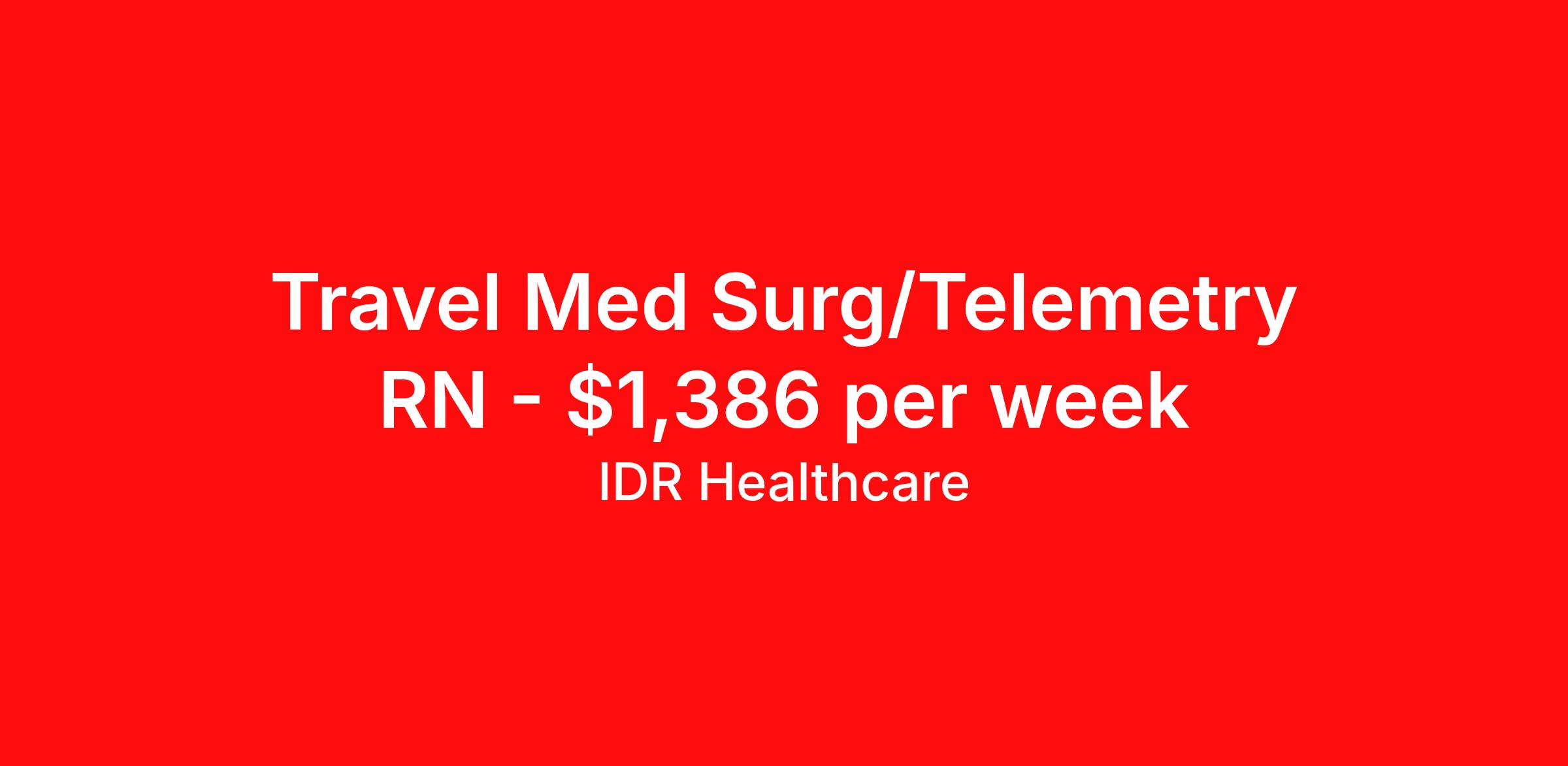 IDR Healthcare is seeking a travel nurse RN Med Surg / Telemetry for a travel nursing job in Titusville, Florida. Job Description & Requirements Specialty: Med Surg / Telemetry Discipline: RN Start Date: 04/06/2026 Duration: 13 weeks 36 hours per week Shift: 12 hours, days Employment Type: Travel IDR Healthcare is an awarding winning staffing firm that believes it is a privilege and awesome responsibility to serve those who selflessly care for others. Our mission is to empower healthcare professionals to achieve their fullest potential both personally and professionally while they create positive change within the healthcare community. We exercise true grit, tenacity, and authenticity while embracing and ownership mindset to go above and beyond providing healthcare professionals a world class experience. We are employee owned and our travelers and clinicians earn shares/equity by just completing multiple assignments! We have been named SIA’s Fastest Growing Staffing Firms and have won ClearlyRated® Best of Staffing for 11 consecutive years! This cements our commitment to clinician satisfaction earning top net promoter scores putting us in the top 2% of agencies in North America! TravelFarWithIDR and see what an extraordinary experience is all about! Benefits 2024 World Staffing Best Staffing Firms to Work For! ESOP (Equity) Healthcare Benefits for up to 30 days Between Assignments Comprehensive Health Insurance Dental and Vision Insurance Sign-On, Completion, & Referral Bonus Programs License and Certification Reimbursement Weekly Pay and Competitive Compensation Large Network of Clients and Job Opportunities 401k retirement plan Exclusive Assignments IDR Job ID 495329. Pay package is based on 12 hour shifts and 36 hours per week (subject to confirmation) with tax-free stipend amount to be determined. About IDR Healthcare IDR Healthcare is an awarding winning staffing firm that believes it is a privilege and awesome responsibility to serve those who selflessly care for others. Our mission is to empower healthcare professionals to achieve their fullest potential both personally and professionally while they create positive change within the healthcare community. We exercise true grit, tenacity, and authenticity while embracing and ownership mindset to go above and beyond providing healthcare professionals a world class experience. We are employee owned and our travelers and clinicians earn shares/equity by just completing multiple assignments! We have been named SIA’s Fastest Growing Staffing Firms and have won ClearlyRated® Best of Staffing for 11 consecutive years! This cements our commitment to clinician satisfaction earning top net promoter scores putting us in the top 2% of agencies in North America! Help us give back! For every booked assignment, proceeds are donated to St. Jude and Feeding America! Last year we raised over $18,000 for St. Jude and provided over 49,000 meals for children in need. TravelFarWithIDR and see what it is all about! Benefits Weekly pay 401k retirement plan Referral bonus Medical benefits Dental benefits License and certification reimbursement Vision benefits