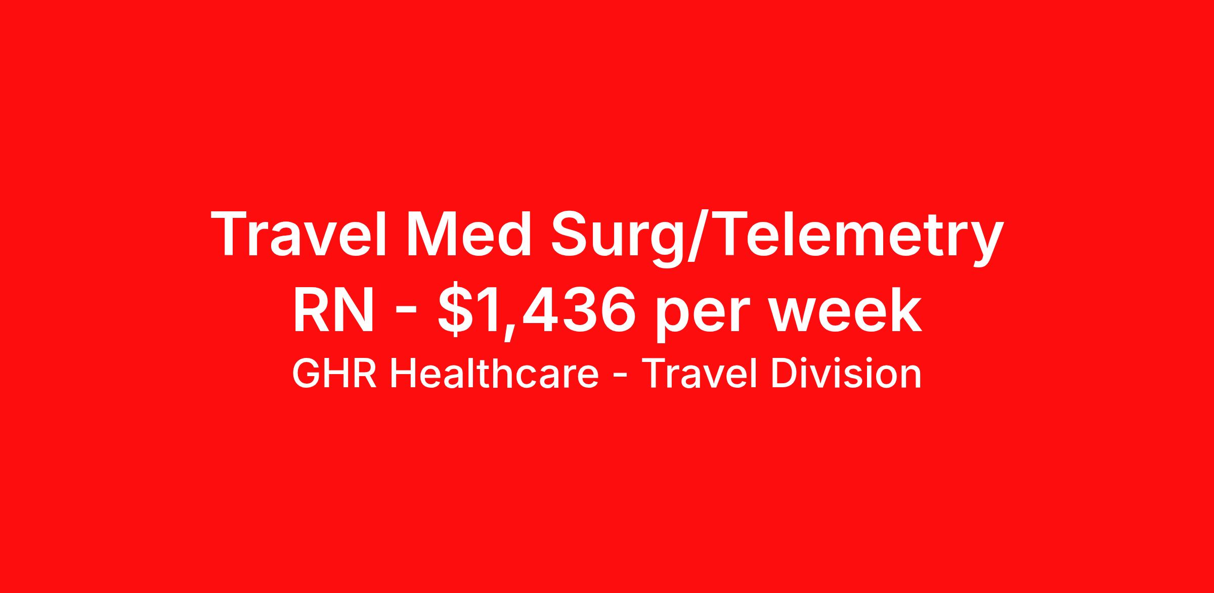 GHR Healthcare - Travel Division is seeking a travel nurse RN Med Surg / Telemetry for a travel nursing job in Titusville, Florida. Job Description & Requirements Specialty: Med Surg / Telemetry Discipline: RN Start Date: 04/21/2026 Duration: 13 weeks 36 hours per week Shift: 12 hours Employment Type: Travel GHR Healthcare - Travel Division Job ID 76247454. Pay package is based on 12 hour shifts and 36 hours per week (subject to confirmation) with tax-free stipend amount to be determined. About GHR Healthcare - Travel Division For over 30 years, GHR Healthcare has been the bridge between healthcare professionals and the facilities that need them nationwide. We're committed to uncovering your ideal fit, supported by GHR's dedication to competitive compensation, transparent communication, and a devoted team that genuinely cares about your career journey. You can trust us to stand by your side as your advocate, confidante, and partner in advancing your career. At GHR, care and consideration are at the heart of everything we do. Visit ghrhealthcare.com to learn more.