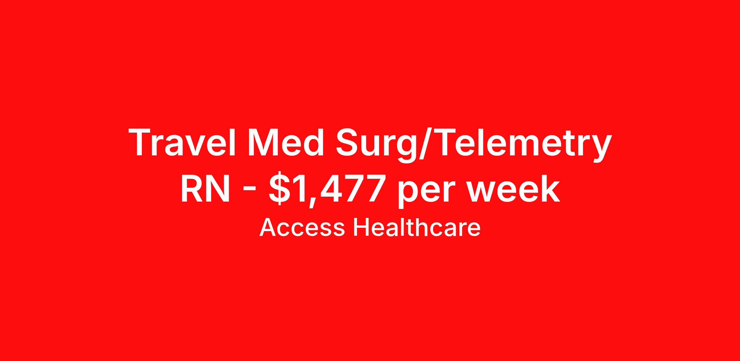 Access Healthcare is seeking a travel nurse RN Med Surg / Telemetry for a travel nursing job in Titusville, Florida. Job Description & Requirements Specialty: Med Surg / Telemetry Discipline: RN Start Date: 04/21/2026 Duration: 13 weeks 36 hours per week Shift: 12 hours, days Employment Type: Travel Access Healthcare Job ID 76090683. Pay package is based on 12 hour shifts and 36 hours per week (subject to confirmation) with tax-free stipend amount to be determined. About Access Healthcare Access Healthcare aims to provide superior service to our nursing family by providing around the clock support, competitive pay packages and an unmatched benefits package! Unlike other agencies, we offer a true family feel and work with you to find the placement that is right for you. We offer one of the top leading pay packages in the industry and we are ready to get you the money you deserve! Access Healthcare was founded by two travel nurses, Danielle and Diego, who had a dream and a shared vision of creating an agency which all nurses would want to work with. Our passion has led us to where we are today as one of the top 10 agencies in our home state of New Jersey, with access to contracts in all 50 states! We encourage you to join our team and we cannot wait to get to know you!