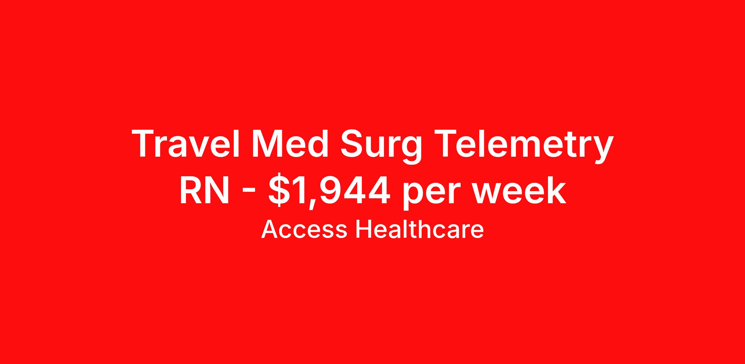 Access Healthcare is seeking a travel nurse RN Telemetry for a travel nursing job in Morgantown, West Virginia. Job Description & Requirements Specialty: Telemetry Discipline: RN Start Date: ASAP Duration: 13 weeks 36 hours per week Shift: 12 hours, nights Employment Type: Travel Access Healthcare Job ID 75951470. Pay package is based on 12 hour shifts and 36 hours per week (subject to confirmation) with tax-free stipend amount to be determined. About Access Healthcare Access Healthcare aims to provide superior service to our nursing family by providing around the clock support, competitive pay packages and an unmatched benefits package! Unlike other agencies, we offer a true family feel and work with you to find the placement that is right for you. We offer one of the top leading pay packages in the industry and we are ready to get you the money you deserve! Access Healthcare was founded by two travel nurses, Danielle and Diego, who had a dream and a shared vision of creating an agency which all nurses would want to work with. Our passion has led us to where we are today as one of the top 10 agencies in our home state of New Jersey, with access to contracts in all 50 states! We encourage you to join our team and we cannot wait to get to know you!