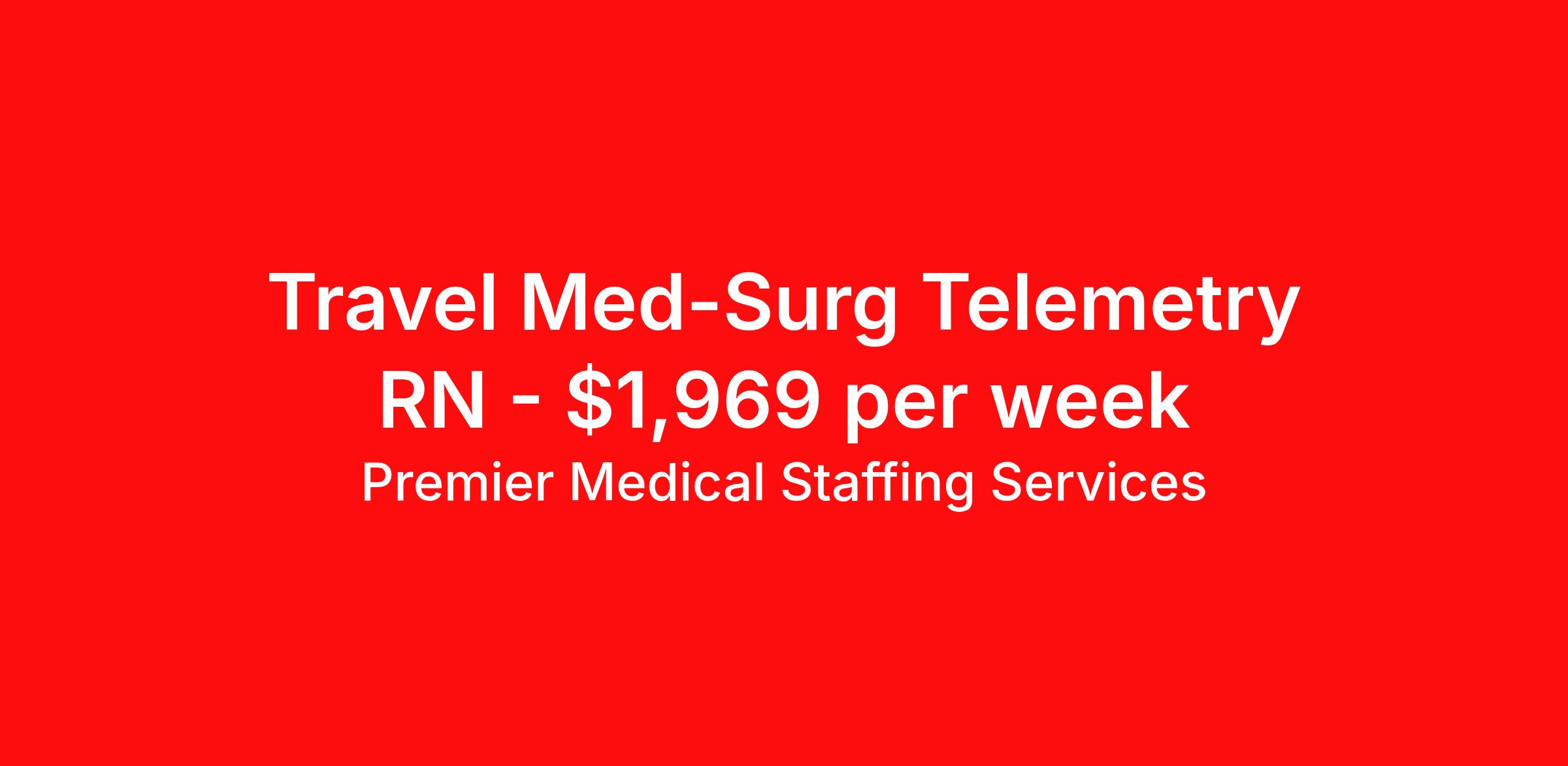 Premier Medical Staffing Services is seeking a travel nurse RN Med Surg / Telemetry for a travel nursing job in Greensboro, North Carolina. Job Description & Requirements Specialty: Med Surg / Telemetry Discipline: RN Start Date: ASAP Duration: 13 weeks 36 hours per week Shift: 12 hours Employment Type: Travel Premier Medical Staffing Job ID 607106. Pay package is based on 12 hour shifts and 36 hours per week (subject to confirmation) with tax-free stipend amount to be determined. Posted job title: RN Tele Med/Surg About Premier Medical Staffing Services Premier Medical Staffing Services, LLC is a nationally expanding healthcare staffing firm for healthcare professionals and companies. We understand our clients’ need for highly qualified, expertly trained medical professionals and are passionate about helping clinicians find employment opportunities that fit their personality and needs. Able to accommodate the ever-changing needs of the healthcare landscape, we offer per-diem, contract and direct hire placements to support the unique needs of each industry sector. Premier Medical Staffing Services is Joint Commission Certified, a Military Spouse Employment Partner and is certified as a Women’s Business Enterprise. We are proudly nurse owned.