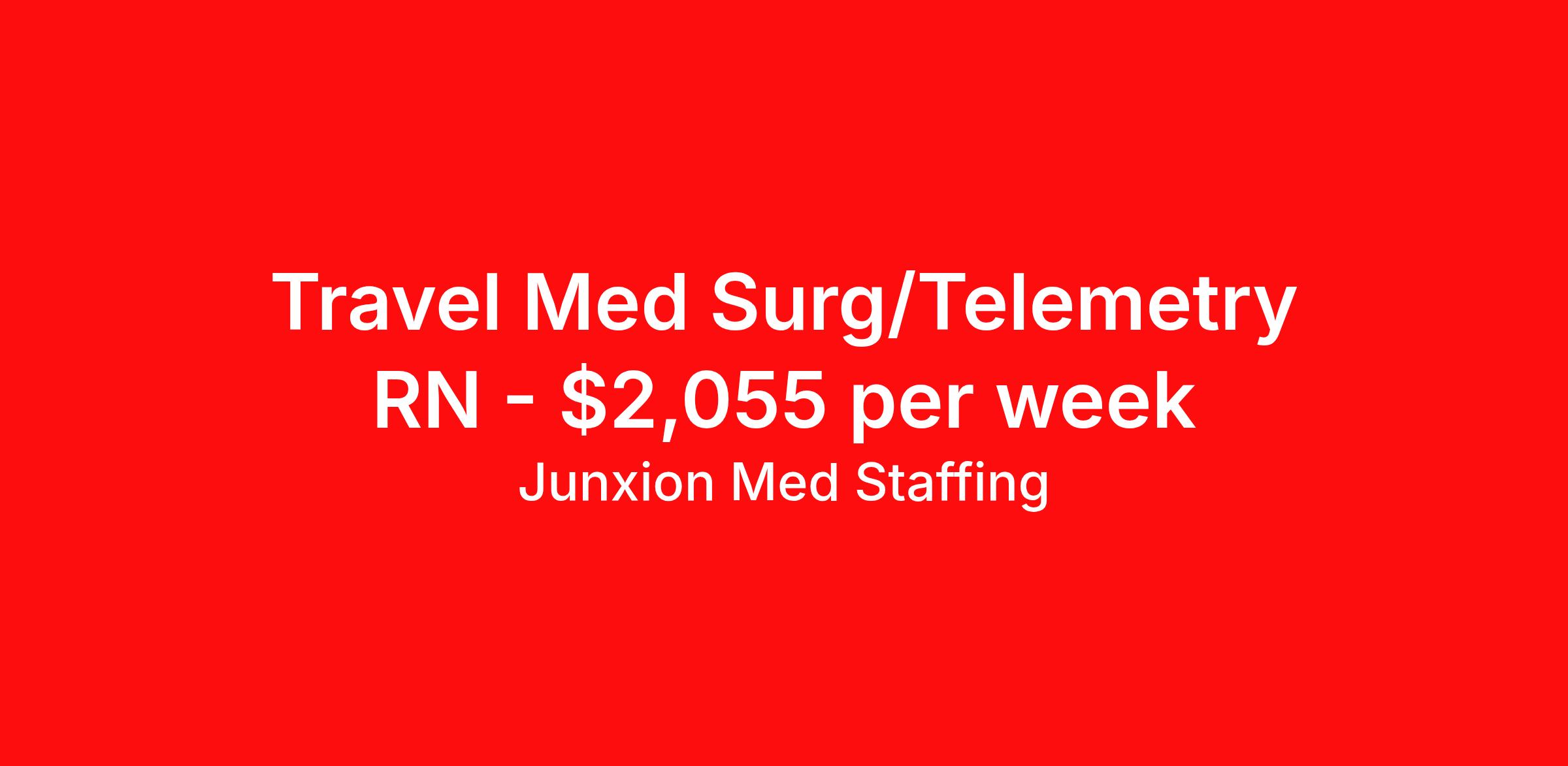 Junxion Med Staffing is seeking a travel nurse RN Med Surg / Telemetry for a travel nursing job in Show Low, Arizona. Job Description & Requirements Specialty: Med Surg / Telemetry Discipline: RN Start Date: ASAP Duration: 13 weeks 36 hours per week Shift: 12 hours, nights Employment Type: Travel Summary: Junxion Med Staffing is looking for a MS/Tele RN to take an assignment in Show Low, Arizona. This assignment lasts 13.14 WEEKS and is scheduled to start on March 20, 2026. If you don't like the start date, pay, or shift, then let’s talk. Give us a call opt 1 Job Details: Shift: 12H Nights Total Weekly Hours: 36 Certifications: BLS, ACLS, BLS, NIHSS Trauma Level: Benefits: Day 1 Insurance Additional bonus potential for every contract Additional vacation incentives Medical insurance with no more than $175 monthly premium for employee Employee Assistance Program (EAP) Referral bonus up to $1,000 401K and access to financial advisors for financial wellness and education A dedicated recruiter and support team that will help you every step of the way to sure you start on time and have an exceptional experience An agency ran by a traveler for travelers Click here for licensing requirements About the Company: Junxion Med Staffing is an award-winning healthcare staffing company with a mission to provide quality healthcare to our communities. Apply today to speak with a recruiter! Awards: RNVIP- Top 10 Travel Nursing Agencies of 2024 BluePipes – The Best Travel Nursing Companies 2023 *Estimated weekly pay includes projected hourly wages and weekly meal and lodging per diems for eligible clinicians based on nationally published GSA rates. Actual weekly pay and per diems may differ from the amount shown and may be subject to change during an assignment. For all employees and employee applicants, Junxion Med Staffing is an Equal Employment Opportunity ("EEO") Employer, including Disability/Vets, and welcomes all to apply. Junxion Med Staffing Job ID 1363227. Pay package is based on 12 hour shifts and 36 hours per week (subject to confirmation) with tax-free stipend amount to be determined. About Junxion Med Staffing Junxion Med Staffing was founded by a former healthcare traveler who understands the challenges healthcare professionals face - because we’ve been there. We specialize in placing travel nurses, allied health professionals, physicians, physician assistants, and nurse practitioners in both short-term and permanent roles across a wide range of specialties. Whether you're looking for a travel contract or a long-term fit, we work to ensure the right match between each healthcare professional and facility. At Junxion, we keep it simple: ● Transparent communication. No surprises, no hidden details, just honest conversations so you always know what to expect. ● Dedicated support. From job search to contract negotiations and throughout your assignment, you’ll have a recruiter who’s with you every step of the way. ● Competitive pay and benefits. We advocate for you to be fairly compensated and supported in your goals. ● A focus on your success. When healthcare professionals feel valued and empowered, patient care improves and that’s what it’s all about. You’re not just a number here. You’re part of a team that actually cares. Let’s find your next great opportunity together. Benefits Weekly pay Referral bonus Dental benefits Vision benefits 401k retirement plan Medical benefits Mileage reimbursement