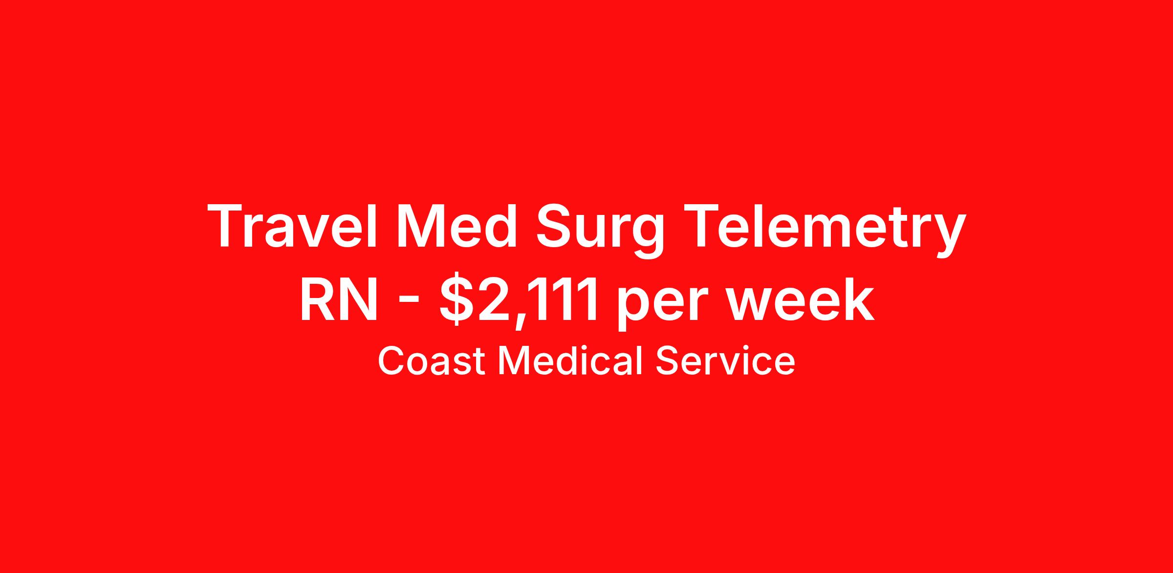 Coast Medical Service is seeking a travel nurse RN Telemetry for a travel nursing job in Waco, Texas. Job Description & Requirements Specialty: Telemetry Discipline: RN Start Date: 04/12/2026 Duration: 13 weeks 48 hours per week Shift: 12 hours, nights Employment Type: Travel Coast Medical Service is a nationwide travel nursing & allied healthcare staffing agency dedicated to providing an elite traveler experience for the experienced or first-time traveler. Coast is featured on Blue Pipes' 2023 Best Travel Agencies and named a 2022 Top Rated Healthcare Staffing Firm & 2023 First Half Top Rated Healthcare Staffing Firm by Great Recruiters. Please note that pay rate may differ for locally based candidates. Please apply here or contact a recruiter directly to learn more about this position & the facility, and/or explore others that may be of interest to you. We look forward to speaking with you! Coast Medical Services Job ID 36162949. Pay package is based on 12 hour shifts and 48.0 hours per week (subject to confirmation) with tax-free stipend amount to be determined. Posted job title: RN:Telemetry,19:00:00-07:00:00