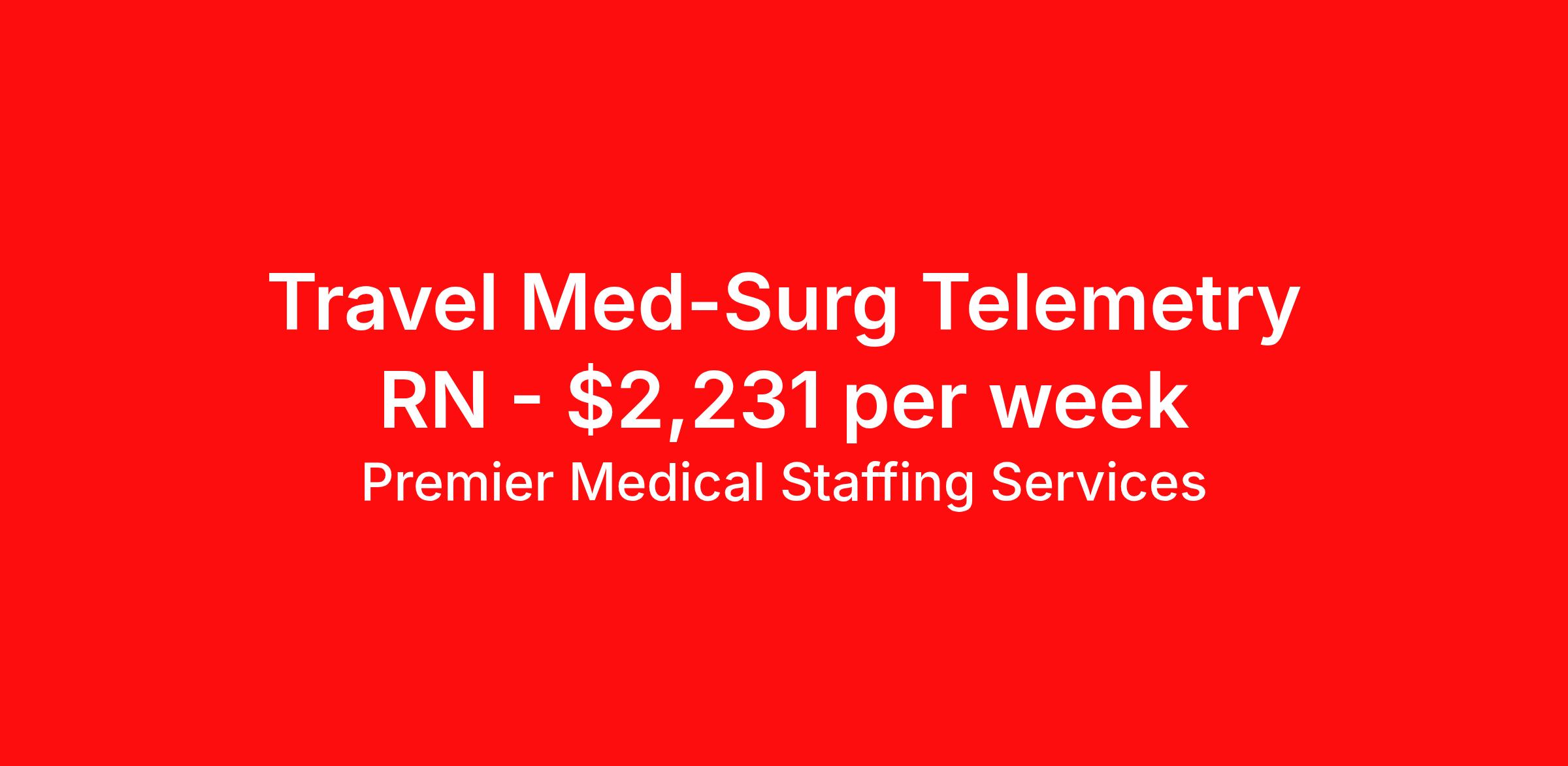 Premier Medical Staffing Services is seeking a travel nurse RN Med Surg / Telemetry for a travel nursing job in Garden City, Kansas. Job Description & Requirements Specialty: Med Surg / Telemetry Discipline: RN Start Date: 04/06/2026 Duration: 13 weeks 36 hours per week Shift: 12 hours Employment Type: Travel Premier Medical Staffing Job ID 617733. Pay package is based on 12 hour shifts and 36 hours per week (subject to confirmation) with tax-free stipend amount to be determined. Posted job title: RN Tele Med/Surg About Premier Medical Staffing Services Premier Medical Staffing Services, LLC is a nationally expanding healthcare staffing firm for healthcare professionals and companies. We understand our clients’ need for highly qualified, expertly trained medical professionals and are passionate about helping clinicians find employment opportunities that fit their personality and needs. Able to accommodate the ever-changing needs of the healthcare landscape, we offer per-diem, contract and direct hire placements to support the unique needs of each industry sector. Premier Medical Staffing Services is Joint Commission Certified, a Military Spouse Employment Partner and is certified as a Women’s Business Enterprise. We are proudly nurse owned.