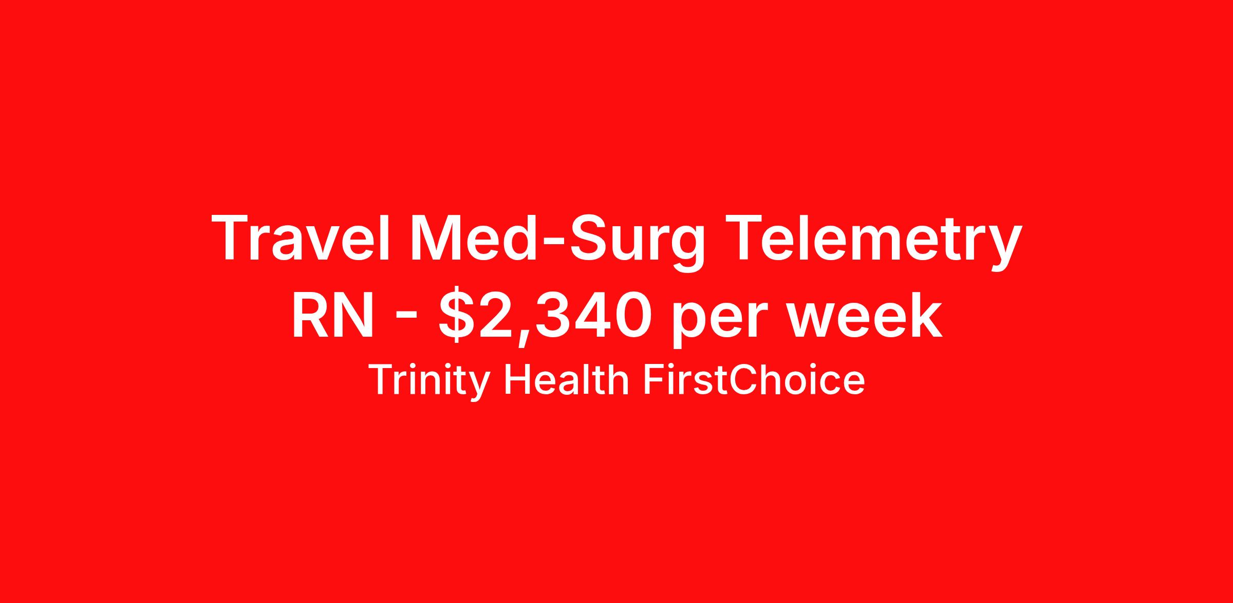 Trinity Health FirstChoice is seeking a travel nurse RN Med Surg / Telemetry for a travel nursing job in Mason City, Iowa. Job Description & Requirements Specialty: Med Surg / Telemetry Discipline: RN Start Date: ASAP Duration: 13 weeks 36 hours per week Shift: 12 hours, days Employment Type: Travel Employment Type: Part time Shift: 12 Hour Day Shift Description: Are you an experienced Registered Nurse looking for premium compensation and maximum flexibility? Explore FirstChoice – Trinity Health's mobile staffing solution! FirstChoice RNs are utilized to fill short and long-term assignments throughout the health system, and we need you to be a part of this innovative program! Nationwide and Regional opportunities available! What you will do: Qualified and willing to float throughout the hospital and/or throughout multiple hospital locations and/or regions Knows, understands, incorporates & demonstrates standard elements of professional practice: Assess, Outcomes Identification / Solutions, Plan, Implement, Evaluate Acts independently & appropriately within license, scope of knowledge & experience in practice area Retains accountability for delegation, choices, decisions & outcomes Collaborates with key stakeholders & contributes to quality & improvement practices & outcomes Exhibits agility & willingness to take on new & additional responsibilities Embraces new ideas & cultural differences while managing competing priorities Minimum Qualifications: Graduation from an accredited school of nursing. Valid RN licensure authorized in the applicable state(s) of practice/employment. Minimum of eighteen (18) months of recent clinical experience for Med Surg, Tele and PCU. Minimum two (2) years of recent clinical experience for all remaining specialties including Critical Care, Surgical Services, Maternal Services, Emergency Department and Behavioral Health. Required to have and maintain the credentials required per their specialty area (ex: ACLS, TNCC, etc). BLS, ACLS and PALS must be obtained through American Heart Association Position Highlights and Benefits: Premium Pay Flexible Scheduling Travel and Per Diem opportunities available Variety of Practice Settings Learning Opportunities DailyPay available Reimbursement of License and Certifications available per assignment Opportunity to participate in 403B program Ministry Information: FirstChoice offers rewarding Nursing, Respiratory Therapist, Surgical Technologist, and Health Care Professional travel positions with a flexible schedule to fit your life. FirstChoice travel Health Care Professionals fill critical positions when unforeseen or unplanned circumstances occur; or, when there is a position open due to an extended leave-of-absence. You’ll get to experience a variety of practice settings while traveling within your local region or traveling nationally – your choice! Job Details: LOCATION: MercyOne Mason City, IA START DATE: Flexible WEEKS: 13 HOURS: 3x12 SHIFT: Day (7a-7p) GROSS WEEKLY RATE: $2,340 Our Commitment Rooted in our Mission and Core Values, we honor the dignity of every person and recognize the unique perspectives, experiences, and talents each colleague brings. By finding common ground and embracing our differences, we grow stronger together and deliver more compassionate, person-centered care. We are an Equal Opportunity Employer. All qualified applicants will receive consideration for employment without regard to race, color, religion, sex, sexual orientation, gender identity, national origin, disability, veteran status, or any other status protected by federal, state, or local law. Trinity Health FirstChoice Job ID 00652201. Pay package is based on 12 hour shifts and 36 hours per week (subject to confirmation) with tax-free stipend amount to be determined. Posted job title: Travel Registered Nurse, RN, Med Surg Tele About Trinity Health FirstChoice Premium pay FirstChoice offers a rewarding career with significant p remium pay and flexible scheduling to fit your life. FirstChoice h ealthcare travel professionals fill critical positions when unforeseen or unplanned circumstances occur; or, when there is a position open due to an extended leave-of-absence. You’ll get to experience a variety of practice settings while traveling within your local region or traveling nationally – your choice! Healthcare travel professionals, join us in caring for our community, we can't do it without you. FirstChoice exclusively supports facilities within the Trinity Health system meaning you will have a consistent experience between job sites. Your training at one site will apply to other sites within the region and will minimize the time you are spending outside of patient care. We understand that there has been a fundamental shift in the nursing position in recent years and like any other employee, nurses want more options and flexibility in their careers. FirstChoice provides you with both along with the comfort and security of one employer. Benefits of Being a FirstChoice healthcare travel professional: Premium pay Choose your own travel adventure—work in a variety of practice settings Wide range of assignments available Housing and meal stipend Minimum Qualifications/Requirements of a FirstChoice Nurse: Registered nurse with a license in the state(s) you will work Minimum of 2 years, depending on specialty area Cannot hold a concurrent position at a Trinity Health facility Trinity Health is a leading not-for-profit Catholic health system with 92 hospitals and hundreds of primary, specialty and continuing care centers across the United States. Benefits Employee assistance programs 403b retirement plan Discount program
