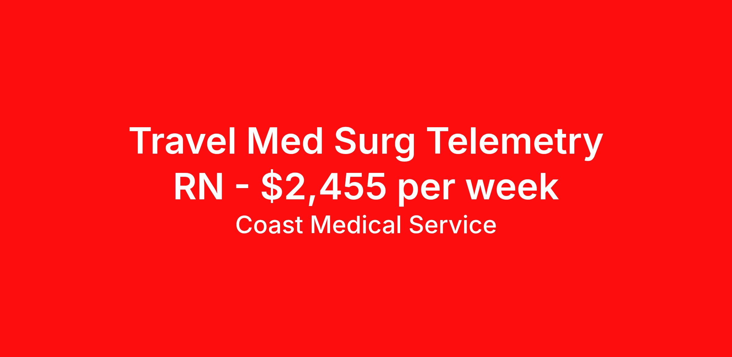 Coast Medical Service is seeking a travel nurse RN Med Surg / Telemetry for a travel nursing job in Morrisville, Vermont. Job Description & Requirements Specialty: Med Surg / Telemetry Discipline: RN Start Date: ASAP Duration: 13 weeks 36 hours per week Shift: 12 hours, nights Employment Type: Travel Coast Medical Service is a nationwide travel nursing & allied healthcare staffing agency dedicated to providing an elite traveler experience for the experienced or first-time traveler. Coast is featured on Blue Pipes' 2023 Best Travel Agencies and named a 2022 Top Rated Healthcare Staffing Firm & 2023 First Half Top Rated Healthcare Staffing Firm by Great Recruiters. Please note that pay rate may differ for locally based candidates. Please apply here or contact a recruiter directly to learn more about this position & the facility, and/or explore others that may be of interest to you. We look forward to speaking with you! Coast Medical Services Job ID 35905704. Pay package is based on 12 hour shifts and 36.0 hours per week (subject to confirmation) with tax-free stipend amount to be determined. Posted job title: RN:Medical-Surgical,19:00:00-07:30:00