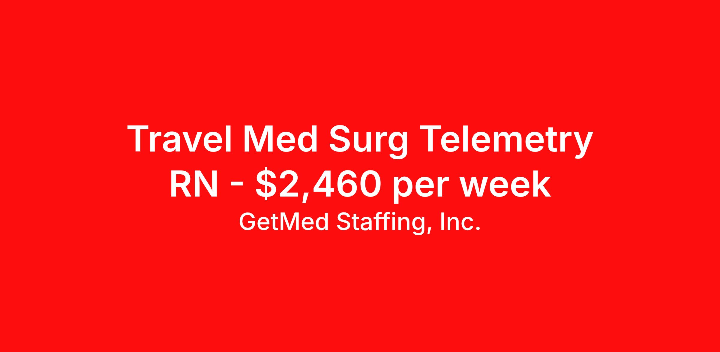 GetMed Staffing, Inc. is seeking a travel nurse RN Med Surg / Telemetry for a travel nursing job in Morrisville, Vermont. Job Description & Requirements Specialty: Med Surg / Telemetry Discipline: RN Start Date: 03/30/2026 Duration: 13 weeks 40 hours per week Shift: 8 hours, days, evenings, nights, flexible Employment Type: Travel GetMed Staffing is searching for a strong MedSurg RN to assist our traveler-friendly client. A minimum of 1-2 years of experience is required. Traveling with GetMed Staffing offers the unique opportunity to gain diverse experiences, both personally and professionally. Gain experience that matters. GetMed Staffing, Inc. Job ID 35905284. Pay package is based on 8 hour shifts and 40.0 hours per week (subject to confirmation) with tax-free stipend amount to be determined. Posted job title: RN:MedSurg,07:00:00-15:00:00 About GetMed Staffing, Inc. We are a diversity owned company, specializing in healthcare recruiting services. We truly understand how important a healthcare travelers' relationship is with their recruiter, as well as our relationship is with our healthcare facilities. We recognize that the needs of our healthcare travelers can vary, and therefore we provide the personalized touch necessary to ensure a successful travel assignment each and every time. Our healthcare facilities and clients benefit from us putting our healthcare travelers first. GetMed Staffing is excited to be a leader within the industry by focusing on providing healthcare travelers with more choices and possibilities as they plan for their next healthcare travel assignment. Benefits Life insurance Medical benefits Dental benefits Vision benefits 401k retirement plan