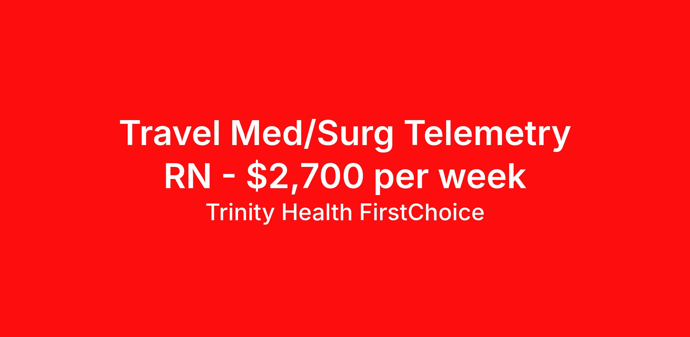 Trinity Health FirstChoice is seeking a travel nurse RN Med Surg / Telemetry for a travel nursing job in Hartford, Connecticut. Job Description & Requirements Specialty: Med Surg / Telemetry Discipline: RN Start Date: ASAP Duration: 13 weeks 36 hours per week Shift: 12 hours, nights Employment Type: Travel Employment Type: Part time Shift: Description: Travel Registered Nurse, RN, Med/Surg Tele Position Purpose: Are you an experienced Registered Nurse looking for premium compensation and maximum flexibility? Explore FirstChoice – Trinity Health's mobile staffing solution! FirstChoice RNs are utilized to fill short and long-term assignments throughout the health system, and we need you to be a part of this innovative program! Nationwide and Regional opportunities available! What you will do: Qualified and willing to float throughout the hospital and/or throughout multiple hospital locations and/or regions Knows, understands, incorporates & demonstrates standard elements of professional practice: Assess, Outcomes Identification / Solutions, Plan, Implement, Evaluate Acts independently & appropriately within license, scope of knowledge & experience in practice area Retains accountability for delegation, choices, decisions & outcomes Collaborates with key stakeholders & contributes to quality & improvement practices & outcomes Exhibits agility & willingness to take on new & additional responsibilities Embraces new ideas & cultural differences while managing competing priorities Minimum Qualifications: Graduation from an accredited school of nursing. Valid RN licensure authorized in the applicable state(s) of practice/employment. Minimum of eighteen (18) months of recent clinical experience for Med Surg, Tele and PCU. Minimum two (2) years of recent clinical experience for all remaining specialties including Critical Care, Surgical Services, Maternal Services, Emergency Department and Behavioral Health. Required to have and maintain the credentials required per their specialty area (ex: ACLS, TNCC, etc). BLS, ACLS and PALS must be obtained through American Heart Association Position Highlights and Benefits: Premium Pay Flexible Scheduling Travel and Per Diem opportunities available Variety of Practice Settings Learning Opportunities DailyPay available Reimbursement of License and Certifications available per assignment Opportunity to participate in 403B program Ministry Information: FirstChoice offers rewarding Nursing, Respiratory Therapist, Surgical Technologist, and Health Care Professional travel positions with a flexible schedule to fit your life. FirstChoice travel Health Care Professionals fill critical positions when unforeseen or unplanned circumstances occur; or, when there is a position open due to an extended leave-of-absence. You’ll get to experience a variety of practice settings while traveling within your local region or traveling nationally – your choice! Job Details: Location: St. Francis Hospital Start Date: Flexible Weeks: 13 Hours: 36 Shift: Night (7p-7a) Gross Weekly Rate: $2700.00 Our Commitment Rooted in our Mission and Core Values, we honor the dignity of every person and recognize the unique perspectives, experiences, and talents each colleague brings. By finding common ground and embracing our differences, we grow stronger together and deliver more compassionate, person-centered care. We are an Equal Opportunity Employer. All qualified applicants will receive consideration for employment without regard to race, color, religion, sex, sexual orientation, gender identity, national origin, disability, veteran status, or any other status protected by federal, state, or local law. Trinity Health FirstChoice Job ID 00644147. Pay package is based on 12 hour shifts and 36 hours per week (subject to confirmation) with tax-free stipend amount to be determined. Posted job title: Travel RN, Registered Nurse, Med/Surg Tele About Trinity Health FirstChoice Premium pay FirstChoice offers a rewarding career with significant p remium pay and flexible scheduling to fit your life. FirstChoice h ealthcare travel professionals fill critical positions when unforeseen or unplanned circumstances occur; or, when there is a position open due to an extended leave-of-absence. You’ll get to experience a variety of practice settings while traveling within your local region or traveling nationally – your choice! Healthcare travel professionals, join us in caring for our community, we can't do it without you. FirstChoice exclusively supports facilities within the Trinity Health system meaning you will have a consistent experience between job sites. Your training at one site will apply to other sites within the region and will minimize the time you are spending outside of patient care. We understand that there has been a fundamental shift in the nursing position in recent years and like any other employee, nurses want more options and flexibility in their careers. FirstChoice provides you with both along with the comfort and security of one employer. Benefits of Being a FirstChoice healthcare travel professional: Premium pay Choose your own travel adventure—work in a variety of practice settings Wide range of assignments available Housing and meal stipend Minimum Qualifications/Requirements of a FirstChoice Nurse: Registered nurse with a license in the state(s) you will work Minimum of 2 years, depending on specialty area Cannot hold a concurrent position at a Trinity Health facility Trinity Health is a leading not-for-profit Catholic health system with 92 hospitals and hundreds of primary, specialty and continuing care centers across the United States. Benefits Employee assistance programs 403b retirement plan Discount program