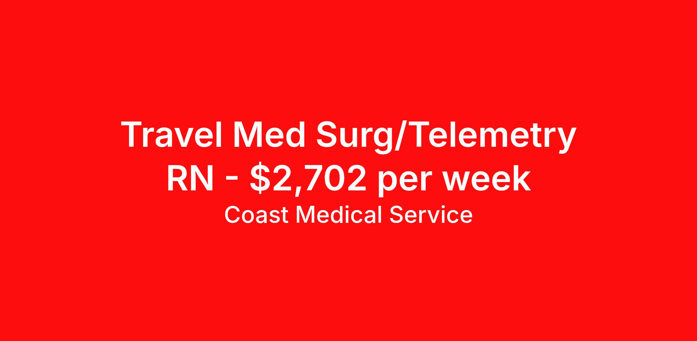 Coast Medical Service is seeking a travel nurse RN Med Surg / Telemetry for a travel nursing job in Macon, Georgia. Job Description & Requirements Specialty: Med Surg / Telemetry Discipline: RN Start Date: 04/06/2026 Duration: 13 weeks 48 hours per week Shift: 12 hours, nights Employment Type: Travel Coast Medical Service is a nationwide travel nursing & allied healthcare staffing agency dedicated to providing an elite traveler experience for the experienced or first-time traveler. Coast is featured on Blue Pipes' 2023 Best Travel Agencies and named a 2022 Top Rated Healthcare Staffing Firm & 2023 First Half Top Rated Healthcare Staffing Firm by Great Recruiters. Please note that pay rate may differ for locally based candidates. Please apply here or contact a recruiter directly to learn more about this position & the facility, and/or explore others that may be of interest to you. We look forward to speaking with you! Coast Medical Services Job ID 36136303. Pay package is based on 12 hour shifts and 48.0 hours per week (subject to confirmation) with tax-free stipend amount to be determined. Posted job title: RN:MS/Tele,19:00:00-07:00:00