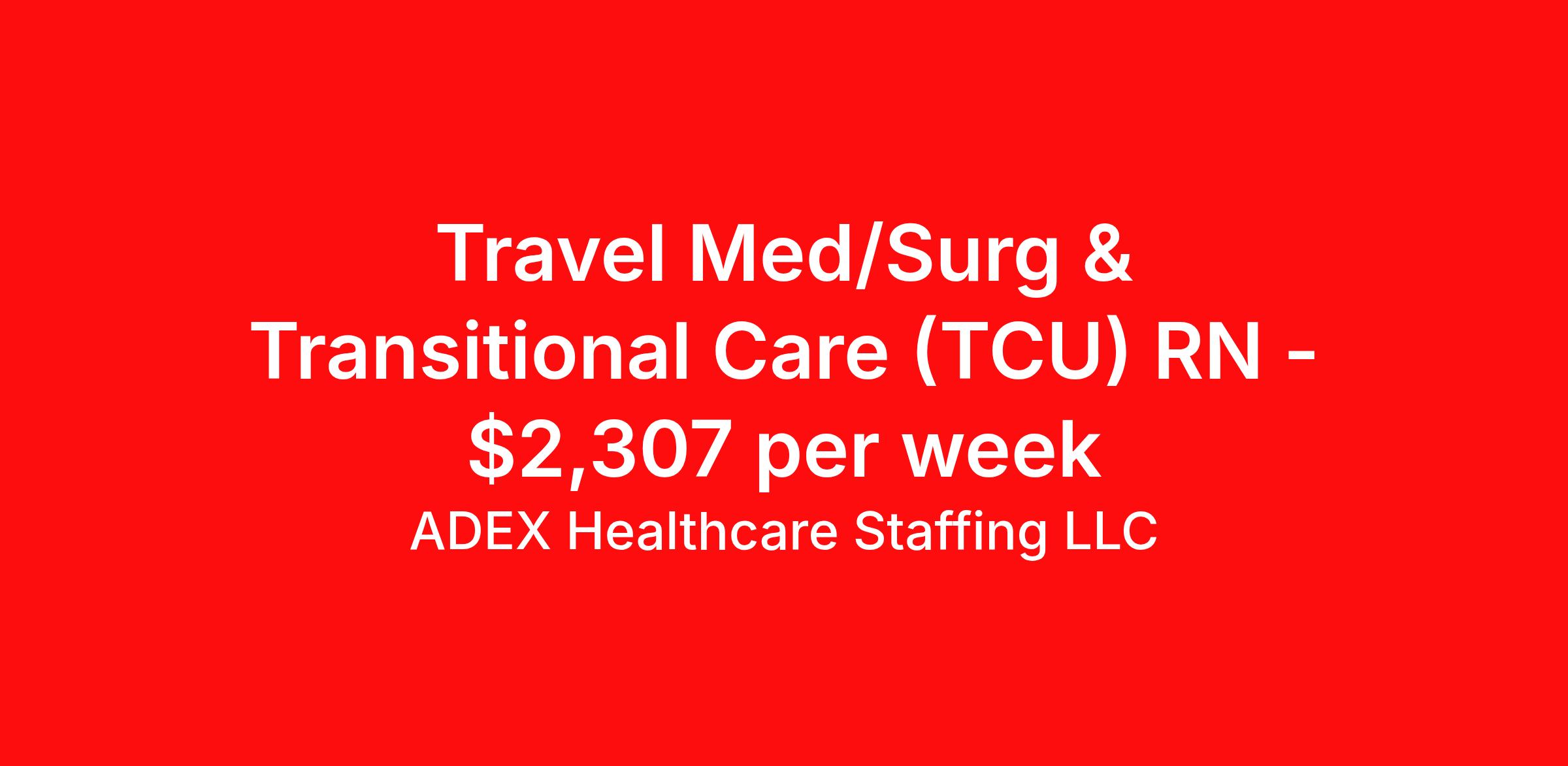 ADEX Healthcare Staffing LLC is seeking a travel nurse RN Transitional Care Unit Med Surg for a travel nursing job in Glendive, Montana. Job Description & Requirements Specialty: Transitional Care Unit Discipline: RN Start Date: 04/13/2026 Duration: 13 weeks 36 hours per week Shift: 12 hours, days Employment Type: Travel RN Position Job Notes: Travel or Local Registered Nurse needed for ASAP start. A minimum of 2 years of recent hospital bedside experience is required. Candidates must be able to start within 5 weeks. Opportunity for extension upon successful completion of the initial assignment. $750 referral bonus available. Opportunity: RN - TCU Job Details: • Work in Med/Surg and Transitional Care areas with patient ratio of 1:4 • Available for day shift or night shift positions • Multiple shift options available: 8-hour, 10-hour, or 12-hour shifts • Guaranteed hours: 40 hours weekly for 8/10-hour shifts, 36 hours weekly for three 12-hour shifts, or 48 hours weekly for four 12-hour shifts • Every other weekend requirement • Float within scope to Transitional Care Unit as needed • 36 hours of orientation provided • No on-call requirements • Maximum 5 days RTO with no RTO allowed within first two weeks • 1 year of experience required, first-timers accepted • Required certifications: BLS and ACLS; PALS preferred • Compact RN license accepted, pending license acceptable • Care for patients of all age groups including pediatrics, adults, and geriatrics • Handle medical, orthopedic, podiatry, and general surgery patients • Work with interdisciplinary team including physical therapy, respiratory services, and pharmacy • Charting system: Cerner (experience preferred) • Any scrub color acceptable • Free parking available • Free housing available Facility: This acute care hospital provides 24-hour emergency care with full medical and surgical services. The facility features 25 staffed beds and includes an attached 71-bed skilled Extended Care facility. It operates as a Level IV trauma center and maintains a low-level ICU. The hospital offers comprehensive interdisciplinary support services including physical therapy, respiratory services, radiology, and pharmacy support with nursing supervisors staffed each shift. Location: Glendive, MT Glendive offers a welcoming small-town atmosphere in eastern Montana along the Yellowstone River, providing excellent outdoor recreation opportunities and a close-knit community feel. The area is known for its scenic beauty and proximity to outdoor activities while maintaining a peaceful, rural lifestyle ideal for healthcare professionals seeking work-life balance. Adex Job ID 3232726. Pay package is based on 12 hour shifts and 36 hours per week (subject to confirmation) with tax-free stipend amount to be determined. About ADEX Healthcare Staffing LLC ADEX has been placing healthcare professionals across the US since 2004. Originally founded in Atlanta, GA, the company's headquarters are now located in Tampa, FL. JCAHO certified since 2009. Benefits Referral bonus