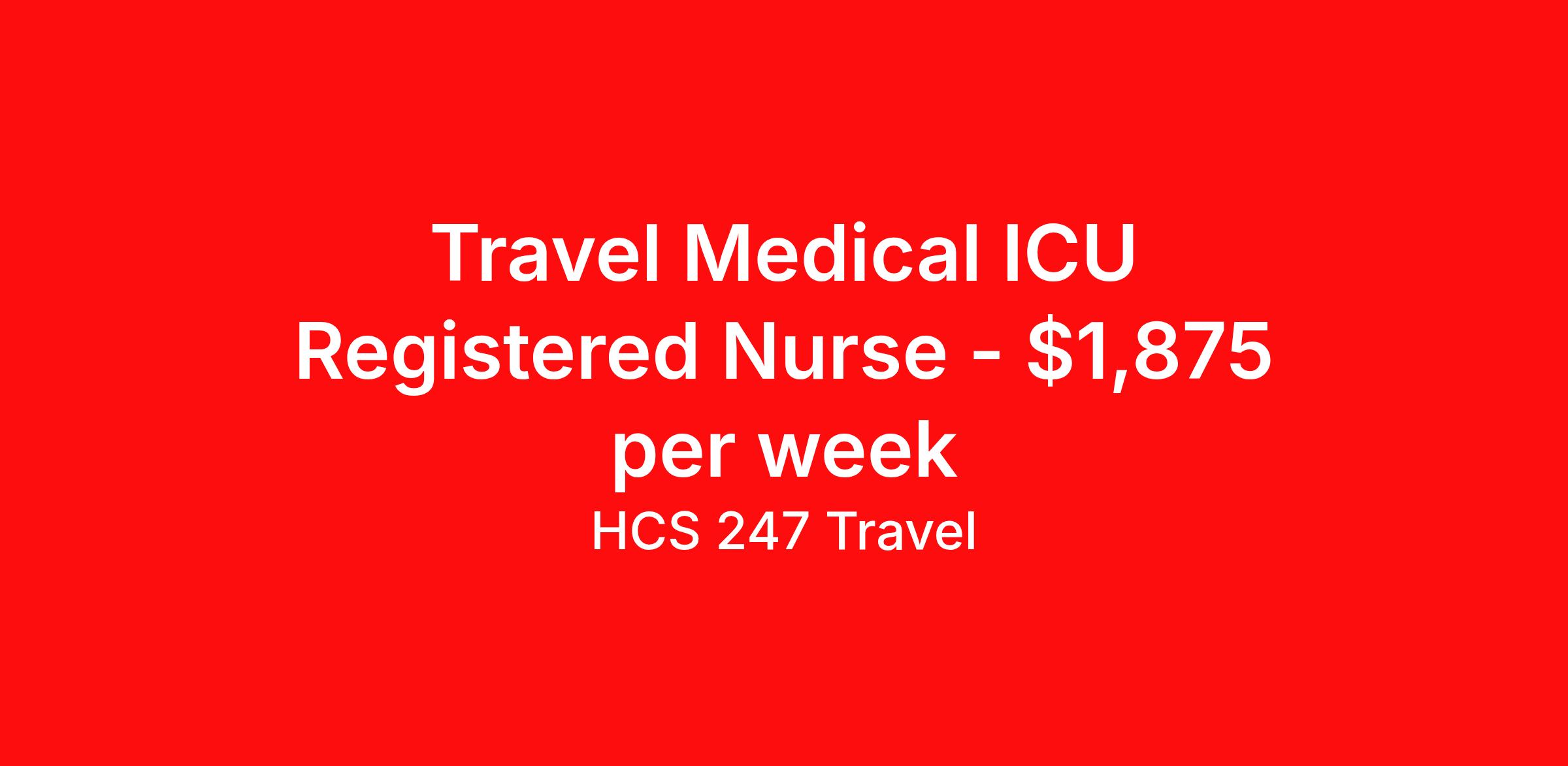 HCS 247 Travel is seeking a travel nurse RN ICU - Intensive Care Unit for a travel nursing job in Nashville, Tennessee. Job Description & Requirements Specialty: ICU - Intensive Care Unit Discipline: RN Start Date: 04/06/2026 Duration: 13 weeks 36 hours per week Shift: 12 hours, nights Employment Type: Travel HCS 247 Travel Job ID 60762713. Pay package is based on 12 hour shifts and 36 hours per week (subject to confirmation) with tax-free stipend amount to be determined. About HCS 247 Travel HCS 24/7 is a national healthcare staffing organization specializing in the placement of Registered Nurses and Allied health professionals across acute care and other clinical settings. We support travel assignments, local short- and long-term contracts, per diem, temp-to-perm, and direct hire opportunities nationwide. Our clinical coverage includes Registered Nurse specialties such as ER, ICU, Med-Surg, Telemetry, Step-Down, OR, PACU, L&D, Mother/Baby, NICU, Cath Lab, Endoscopy, and more along with a full range of allied and imaging professionals, including Respiratory Therapists, Surgical Technicians, X-Ray Techs, CT Techs, MRI Techs, Interventional Radiology (IR) Techs, Cath Lab Techs, Ultrasound/Sonographers, Mammography Techs, and Nuclear Medicine Techs. With competitive compensation and benefits, consistent opportunities, and a clinician-first approach backed by top-rated customer service, HCS 24/7 delivers a seamless experience from initial application through assignment completion. Benefits Holiday Pay Guaranteed Hours Continuing Education Mileage reimbursement Referral bonus Medical benefits Dental benefits Vision benefits License and certification reimbursement Life insurance Benefits start day 1 Weekly pay