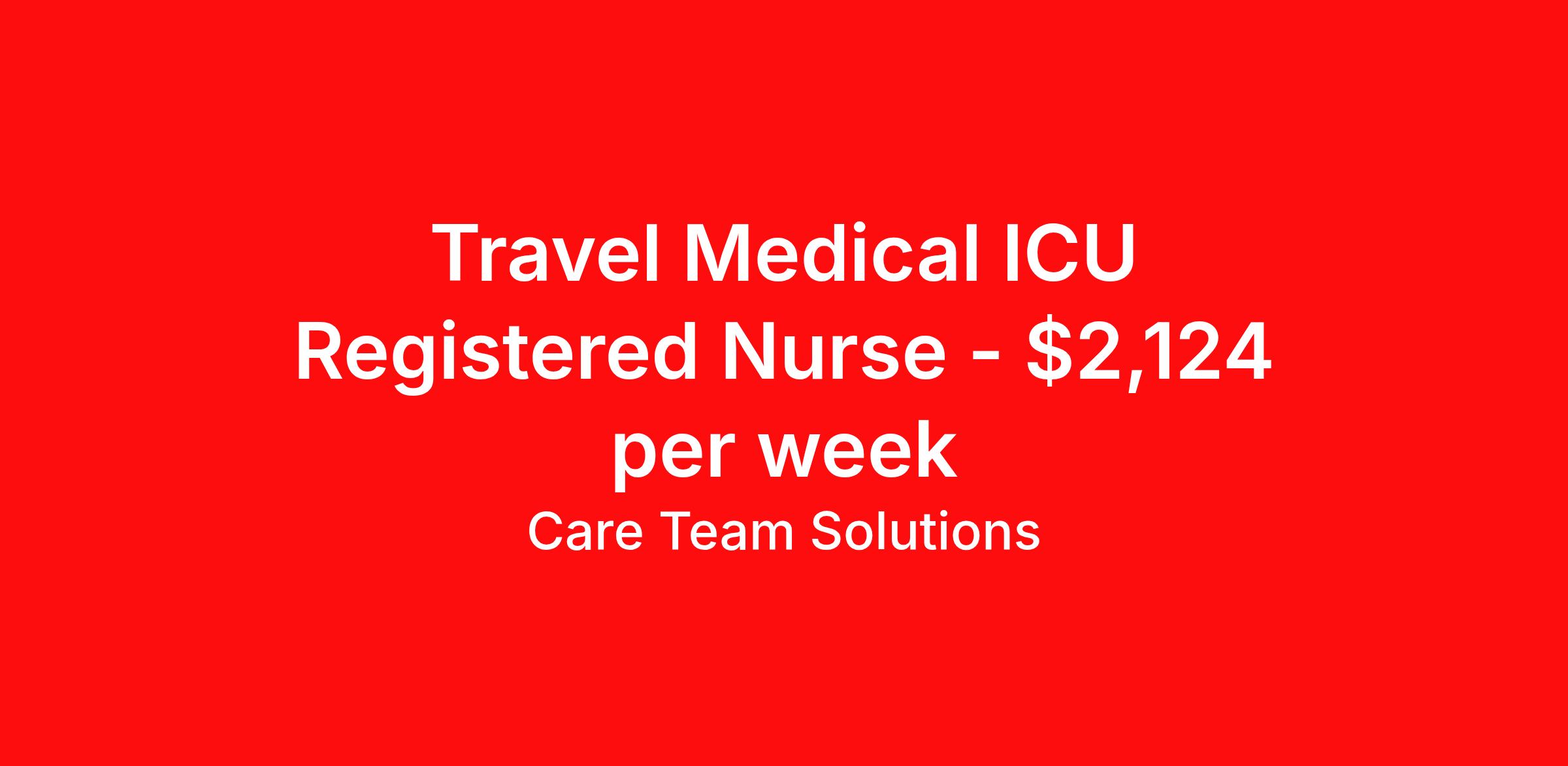 Care Team Solutions is seeking a travel nurse RN ICU - Intensive Care Unit for a travel nursing job in Salem, Massachusetts. Job Description & Requirements Specialty: ICU - Intensive Care Unit Discipline: RN Start Date: 05/31/2026 Duration: 13 weeks 36 hours per week Shift: 12 hours Employment Type: Travel Registered Nurse must have 2 years of recent experience in particular specialty Details: Must Have 2 Years of recent Intensive Care Unit experience. Specialty: Intensive Care Unit Discipline: Registered Nurse Start Date: 2026-05-31 Duration: 13 Weeks Shift: 12 Hours Overnight shift. Hours Per Week: 36 Hours Employment Type: Contract Gross Weekly Pay: $2123.82 Six things that won’t happen if you apply to this job: You won’t have to guess what the downsides are. We’ll tell you up front. You won’t show up on day 1 and find out this is not what you signed up for. We won't leave your phone call ringing when it's inconvenient. Business hours for you are business hours for us. You won’t get shuffled to some customer service rep when a problem pops up. If we screw up something in securing your placement, we'll own it. That means it's on us to make it right. You won’t figure out your credentials alone. Our credentialing experts will walk you through it step by step. We've talked to thousands of travel nurses like you. We know you want good pay. You want to choose when you work. But the one thing nurse after nurse has said they want and don't have is someone in their corner. There's a lot in this business that’s messed up. We’re trying to be the people that fix it. You and every nurse with the guts to travel deserve it. We've worked hard for you to enjoy some one-of-a-kind benefits you'll not likely find anywhere else, because they benefit you more than they benefit us: Our early pay program Student loan reimbursement Free well-being tele-visits with a psychologist Care Team Solutions Job ID 583849. Pay package is based on 12 hour shifts and 36 hours per week (subject to confirmation) with tax-free stipend amount to be determined. Posted job title: ICU RN Nights and EOW - 36 or 48hrs. About Care Team Solutions Two brothers who give an enormous damn. We're Justin and Kyle. Neither of us are nurses. It doesn’t take a nurse to see that the way travel nurses are treated sucks. Nursing is already hard enough. Travel nursing takes serious guts. You get the toughest assignments in places you’ve never been. Which can be fun, but it’s also stressful. You’re in your element but outside of your hometown. You can be a stranger on the team. If anyone deserves someone in their corner, it’s you. But that’s not how most agencies operate. Which is why travel nurses hate working with them. We got into this business because we saw bucket-loads of nurses moving through the "churn and burn" travel machinery. We absolutely hate that. You'll do your best work when you have the placements you want and feel fully supported in your work. We pay our people well because we want them to treat you well. Our recruiters are amazing (we picked each of them ourselves), but if you've got a problem too big for them, they can come straight to us. We work like ten feet away. The "Churners and Burners" promise you the same benefits. They might as well copy/paste them from each other. We have them too: 401k, holiday pay, healthcare, dental, travel reimbursement, etc But we've worked hard for you to enjoy some one-of-a-kind benefits you'll not likely find anywhere else, because they benefit you more than they benefit us: Our early pay program Student loan reimbursement Free well-being tele-visits with a psychologist Benefits Weekly pay Holiday Pay Guaranteed Hours 401k retirement plan Wellness and fitness programs Referral bonus Medical benefits Dental benefits Vision benefits School loan reimbursement